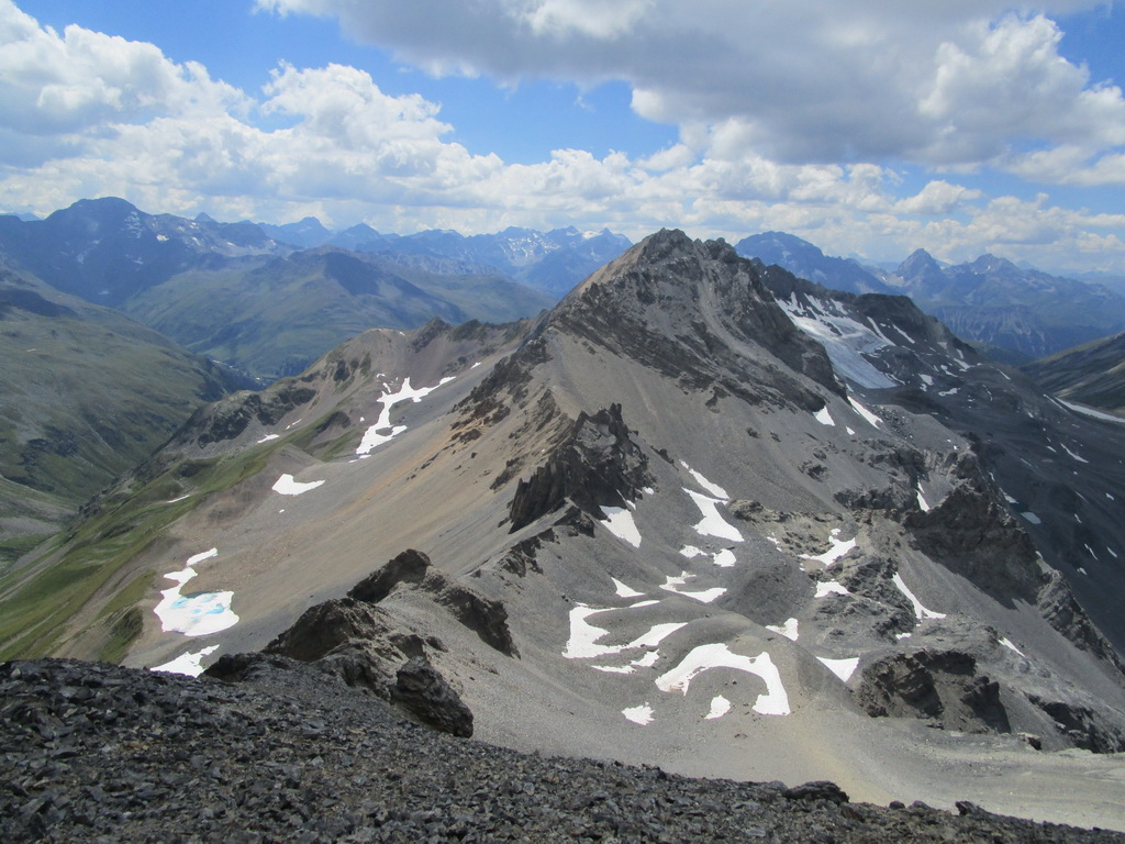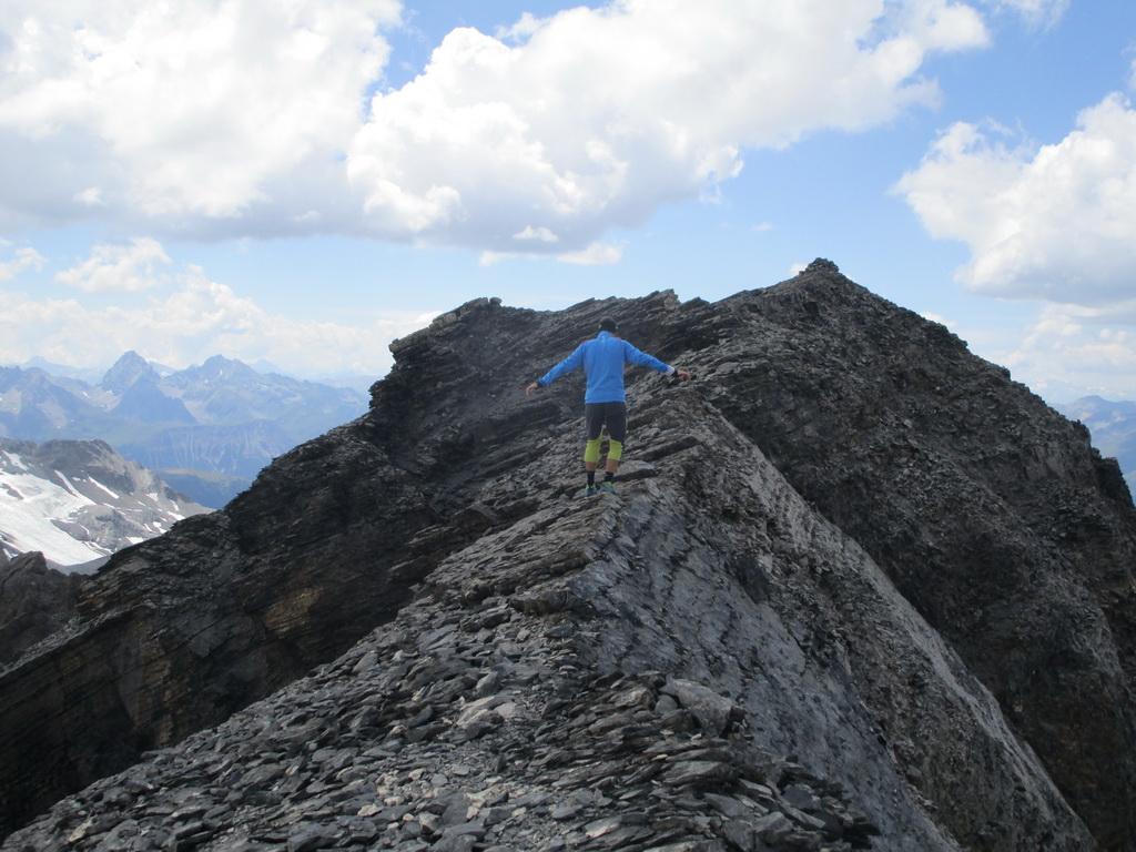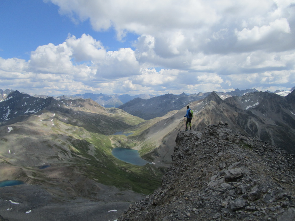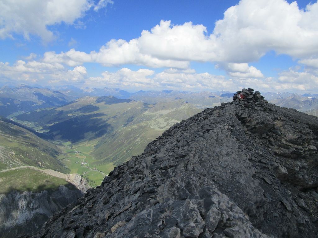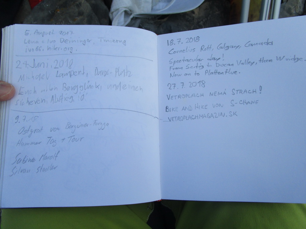 Krásny výstup s ešte krajším záverom. Úžasné výhľady na všetky strany. Zhora sa pozerám na Sertigdorfli a vzdialený Jakobshorn, odkiaľ som nedávno zjazdoval prvú časť bajkového Epicu. Na vrchole nachádzam vrcholovú knižku, za posledný rok sú tam iba štyri zápisy...