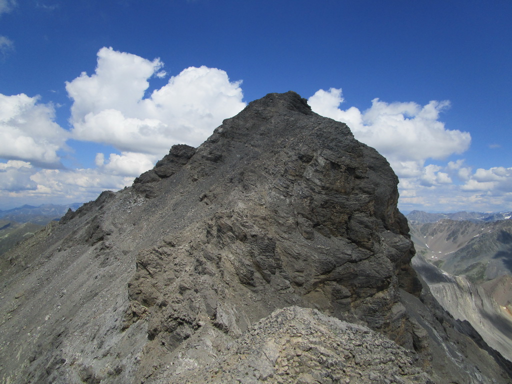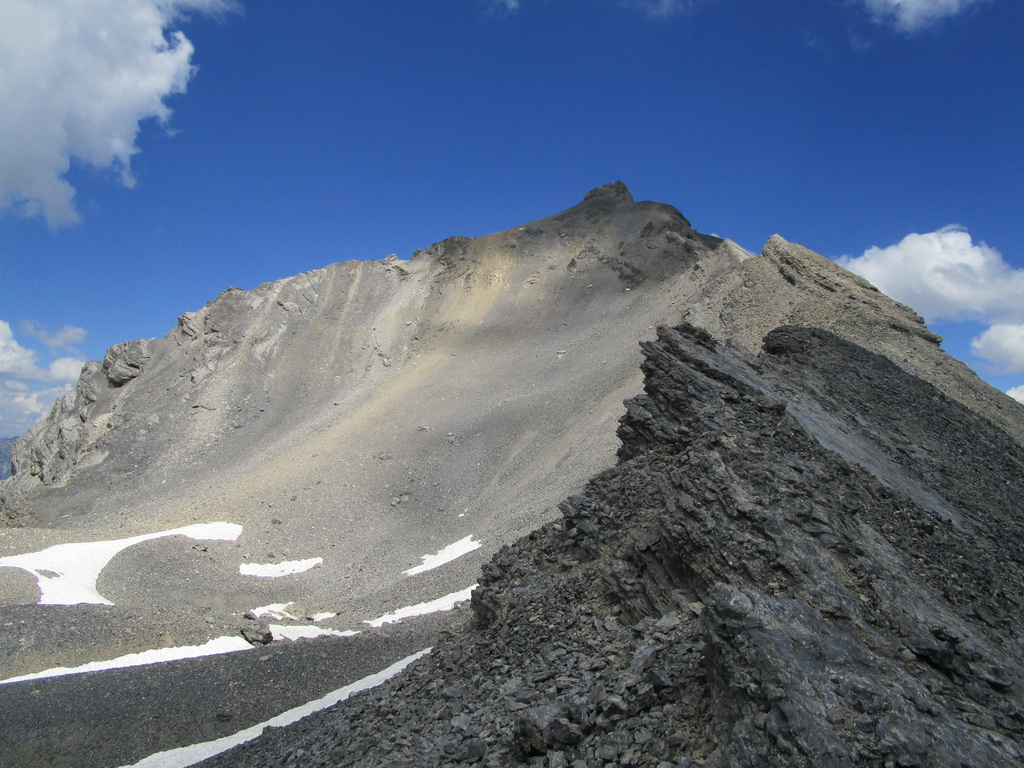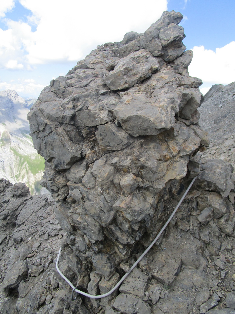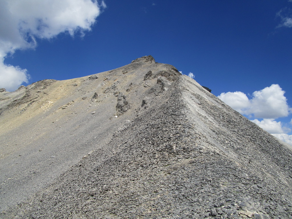 Vystupujem po strmej suti, nikde ani náznak chodníčka. Bez paličiek by to bolo priam nemožné, s nimi sa ale celkom darí postupovať. V sedle vychutnám prvé pohľady na druhú stranu a zhodnotím, že postup ďalej hrebeňom by sa mohol podariť. Stále nenachádzam stopy po ľuďoch, až v hornej časti sa v suti objavia ryhy po náznaku niečoho ako chodníček. Netrvajú ale dlho. V závere výstupu začína ľahké lezenie a stále treba dávať pozor na suť a voľné skaly. Zvyšuje sa expozícia. Konečne jasná stopa po ľuďoch, nachádzam lano so zlaňovacím okom uchytené o skalnú vežičku. Postupujem ďalej a zakrátko som na vrcholovom hrebeni.