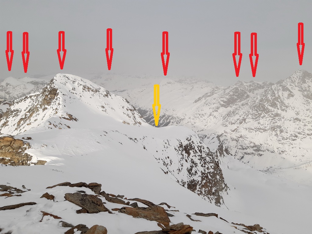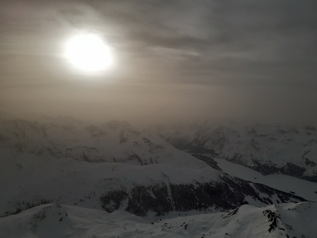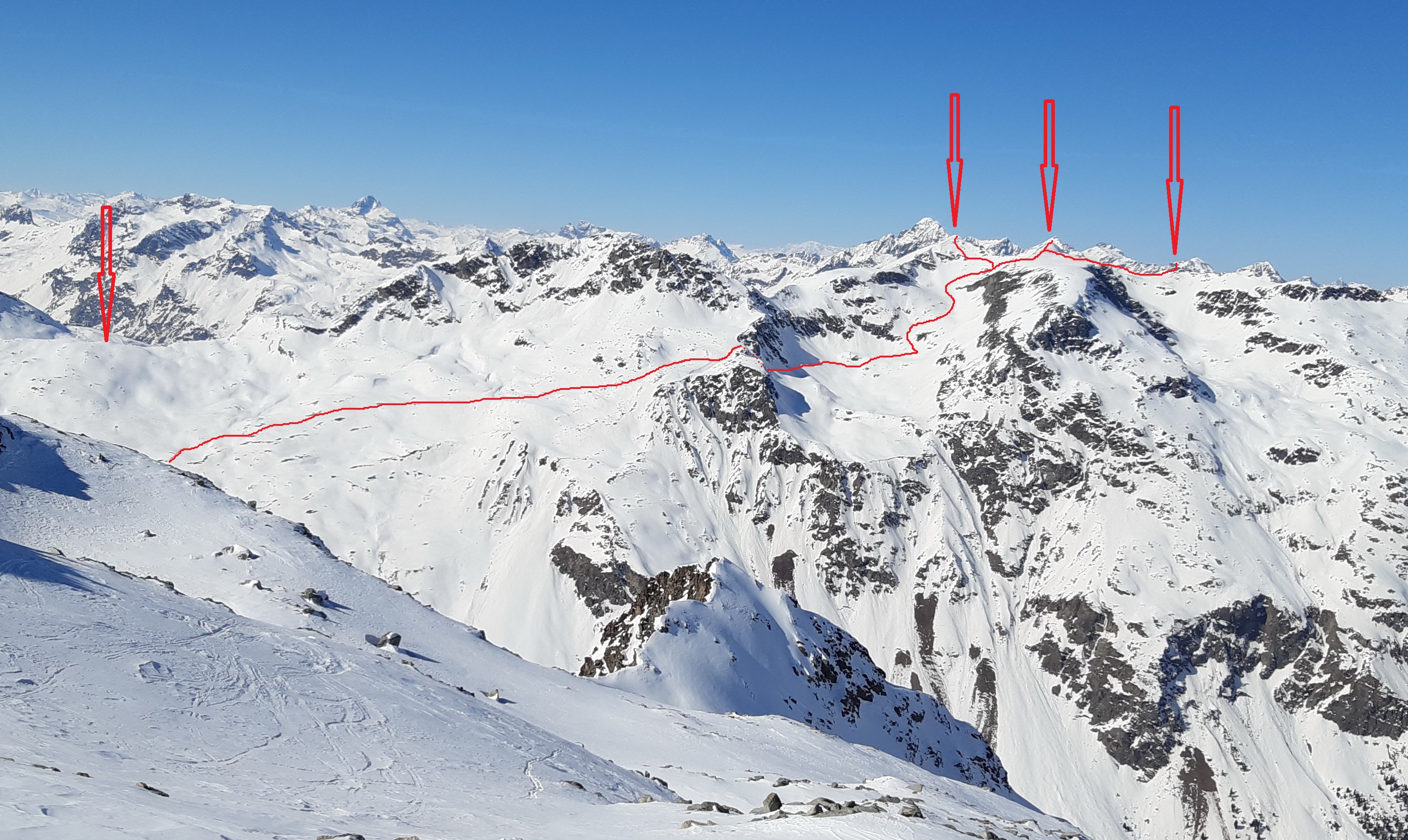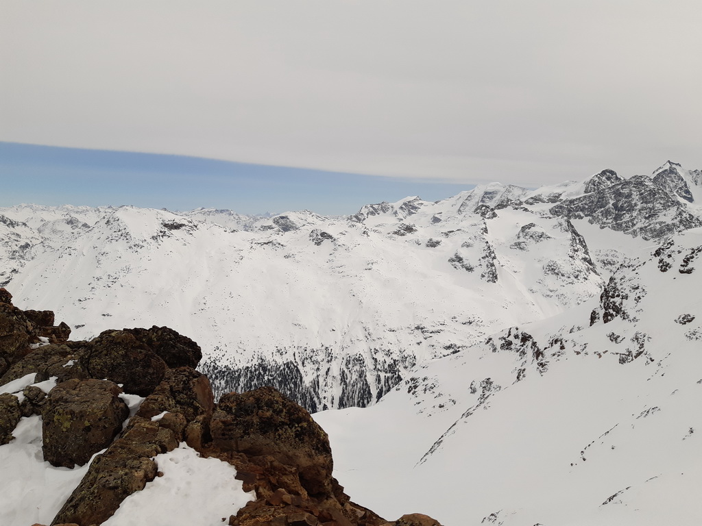 Tri vrcholy pokope: Surlej, San Gian a Chatscheder. Stopa nezmäkla. Je ľadovo. Problém. Na mačkách idem hore a špice z paličiek ktoré držin nad krúžkami používam ako poistku. Pri návrate zo San Gianu potrebujem prejsť ľadový traverz ešte raz. Je to také nepríjemné, exponované miesto nad skalnou stenou, že tam kde by som prefrčal za pár sekúnd na lyžiach, opäť dávam mačky a... Zváram.