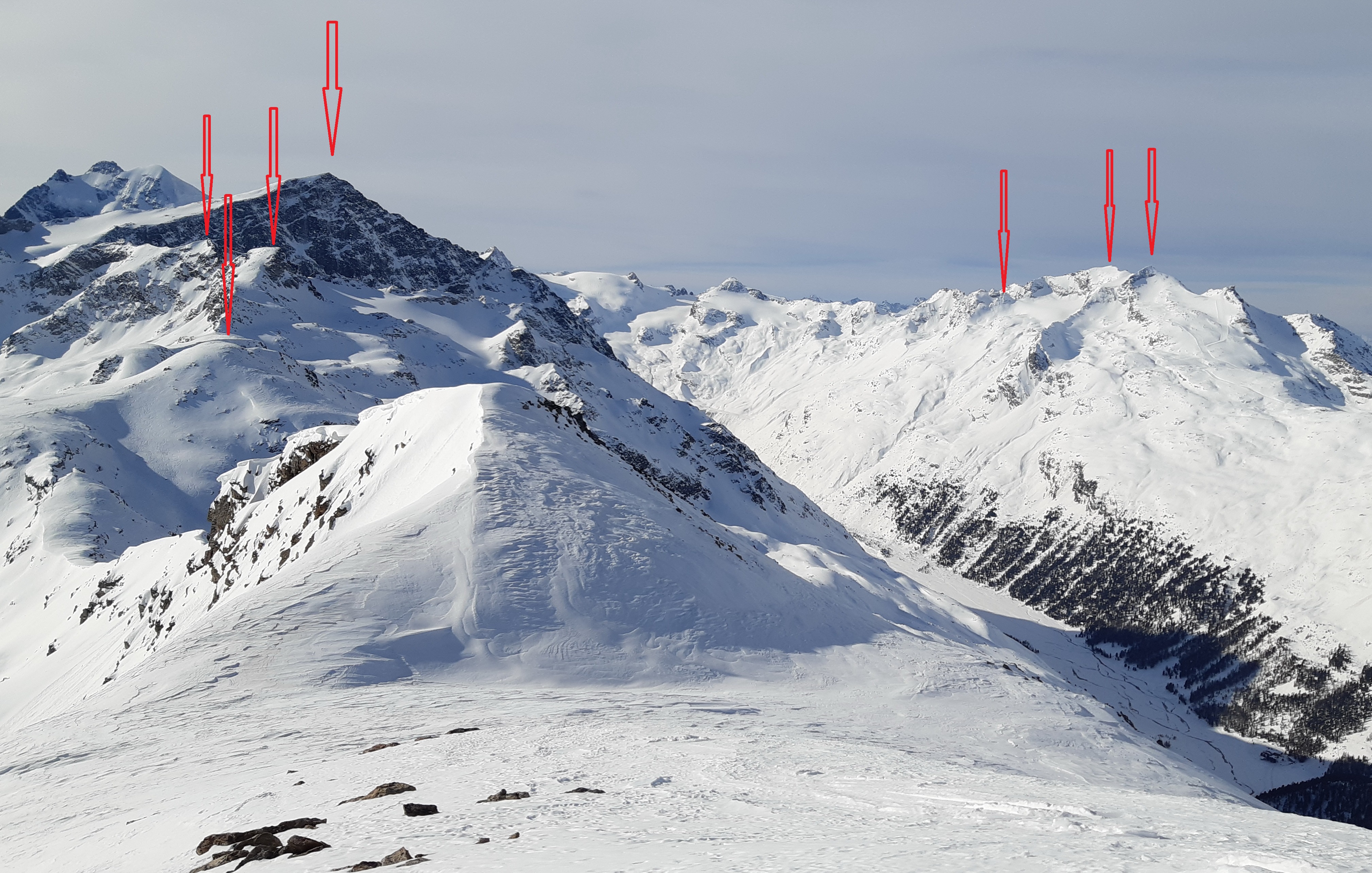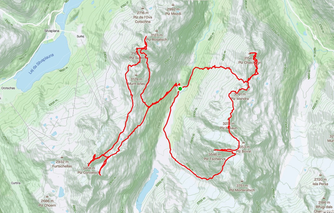 Piz Tschierva, dva vrcholy Misaunu, Mandra, Chalchagn, Chatscheder*, San Gian, Surlej, Corvatsch, Murtel, Gr.Gendarm