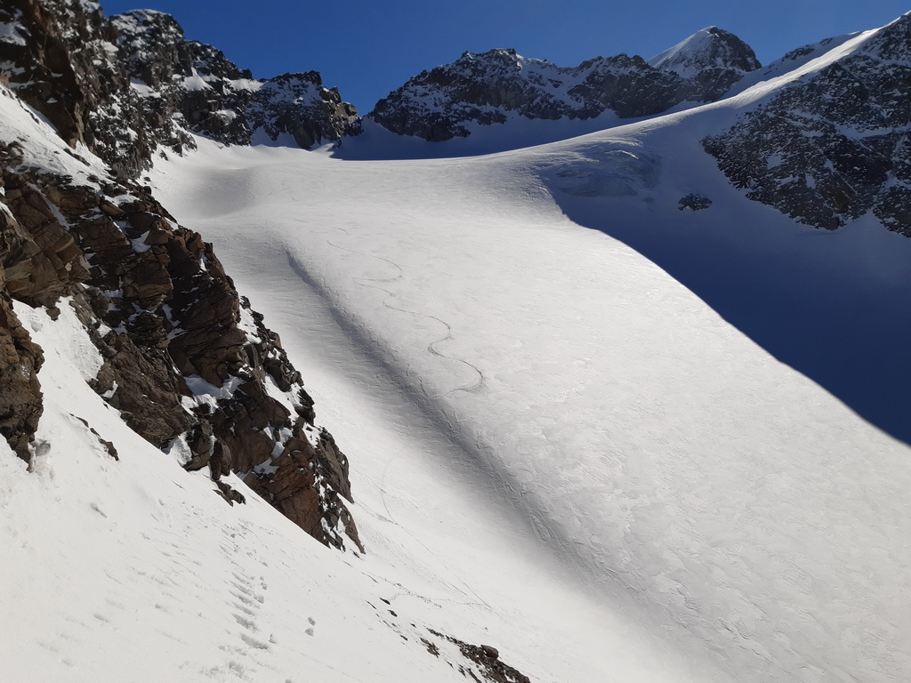 Prejazd ľadovcom. Z tohoto miesta som mal rešpekt. Aj kvôli tomu som si to v lete ešte raz prešiel a študoval odhalené trhliny. Našťastie je to parádne zasnežené a tvrdé. Prefičím rýchlo po okraji.