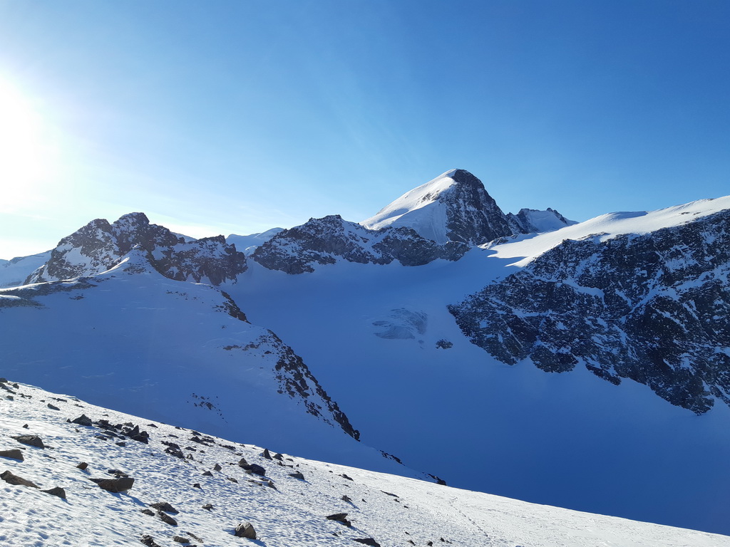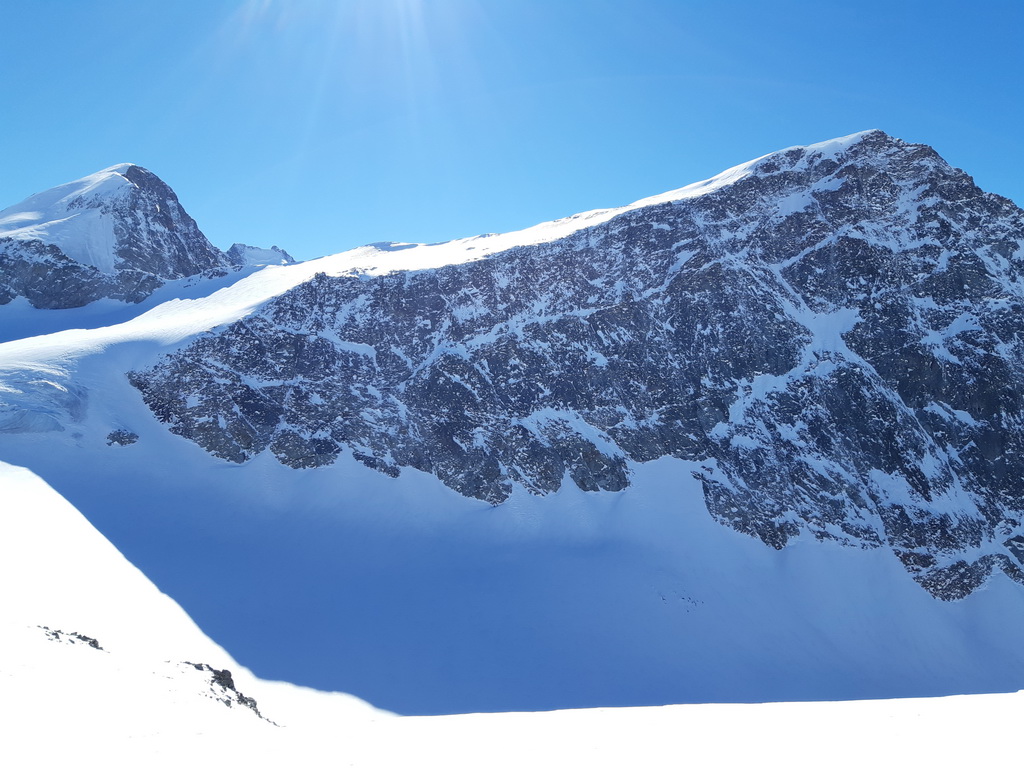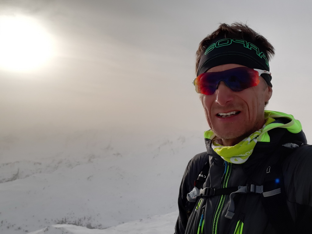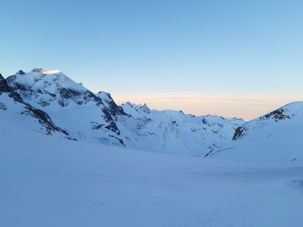 Je tvrdšie a ľadovejšie ako by som čakal, pri výšvihu na rameno Tschiervy dávam dokonca mačky. Na vrchole som pomalší ako predvčerom - asi o 10 minút. Nálada po zlej noci a bez kávy nič moc, začína migréna, kávový gel s kofeinom a sústredím sa na ďalšie kroky.