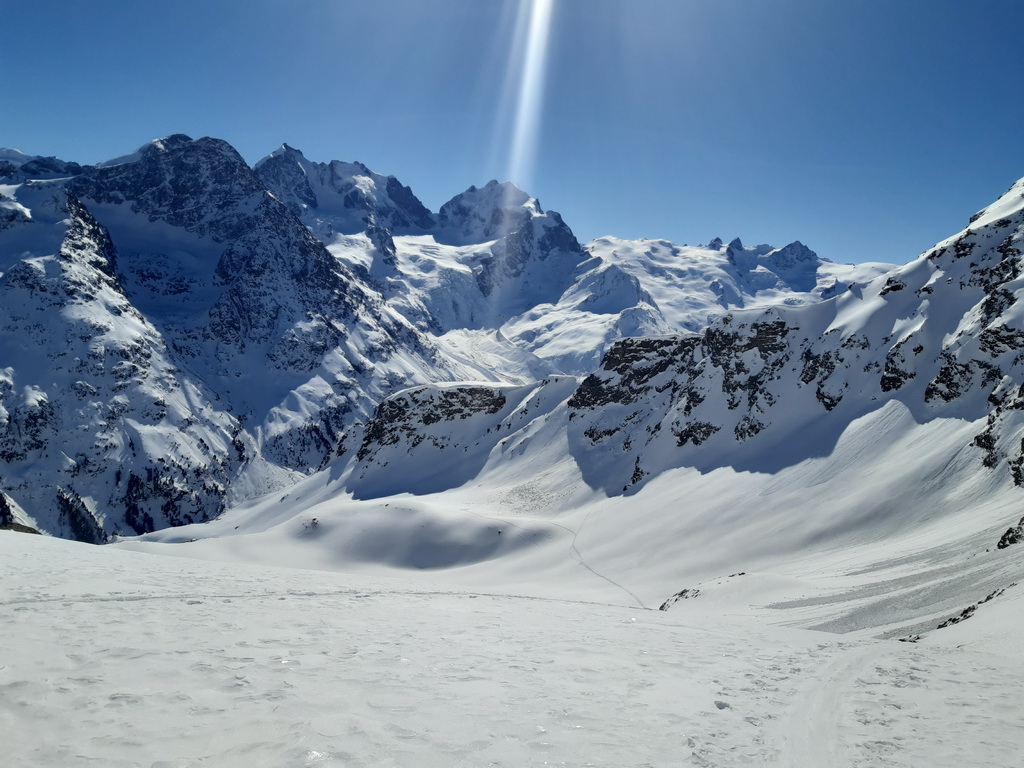 Traverz popod Munt Arlas. Vydýchnem si. Ten fakt, že akurát dnes nezasvietilo asi po týždni slnko a nenatopilo ľadové svahy, ma stál kopec síl a času. Na druhej strane keby svietil oscar naplno, potreboval by som oveľa viac vody. Tá bola ale v aute pripravená.