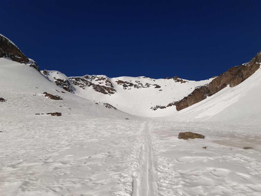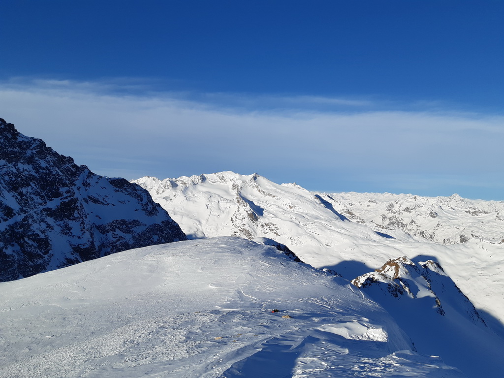 Chalchagn. Tvoriaci sa závoj jemných mrakov cloní slnko a nedovoľuje svahu, natočenému presne na slnečnú stranu, zmäknúť. Podšmykuje v zľadovatenej stope, dávam haršajzne, miestami ich ani nezaborím do ľadu a lyže ostávajú vo vzduchu...