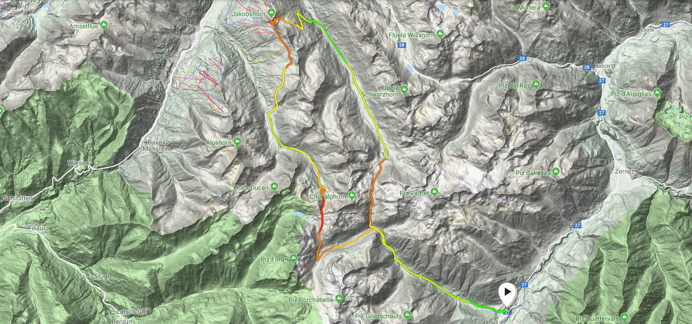 Po chvíli študovania mapy som zistil, že záverečný úsek z Moonsteinu do Filisuru sme už s kamarátmi išli. Odkaz na report nájdete dole. V každom prípade ma lákalo ísť si to prejsť celé, ale na začiatku sezóny som nemal chuť sedieť v aute počas vzácneho voľného dňa ani hodinu naviac. Rovnako ma lákalo aj konečne spoznať bajkové sedlá Scaletta a Sertigpass, a tak som nad mapou vymyslel toto.