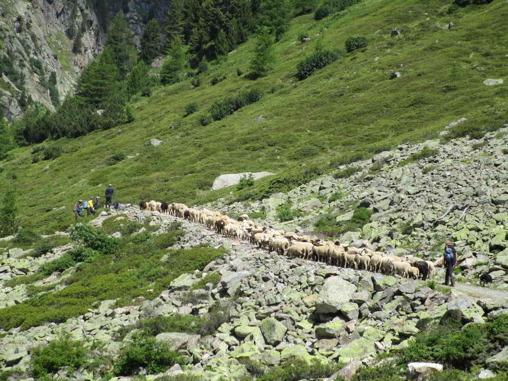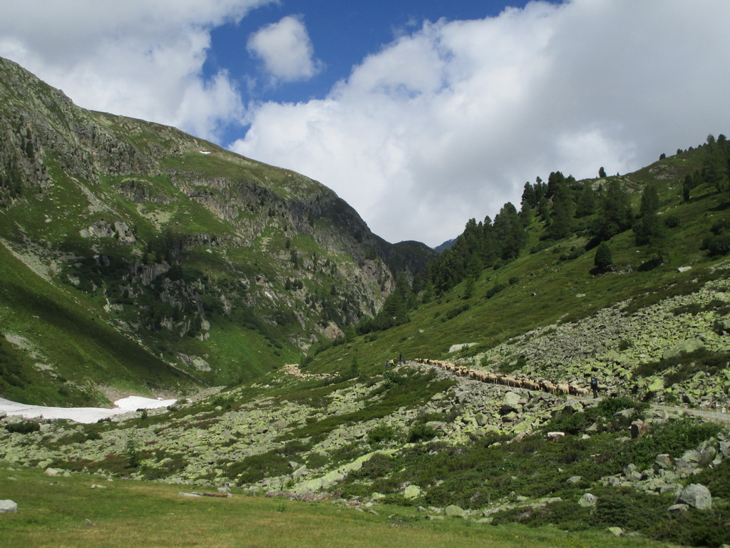 Na začiatku, v stúpaní dlhou, ale krásnou Val Susauna, som sa opäť dostal do nečakaných problémov. Cesta bola zatarasená pomaly postupujúcimi ovcami smerujúcimi hore na pasienky. Stratil som asi pol hodiny. Čakanie som využil na predčasný obed: Snickers a tyčinka :)