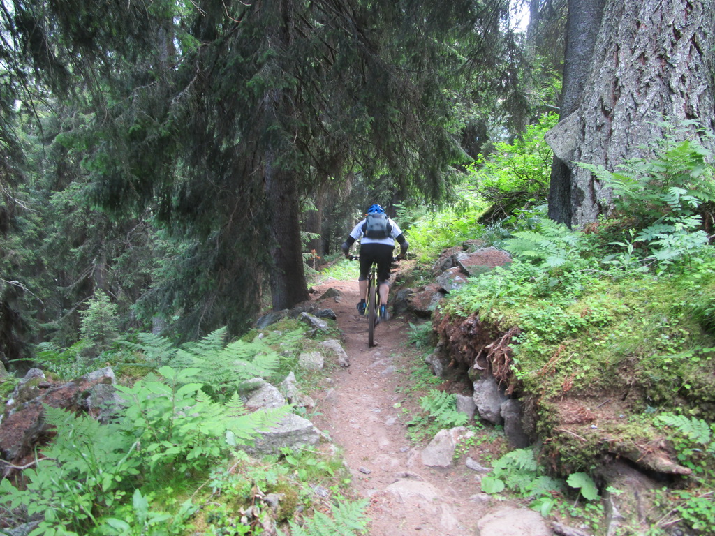 Posilnený rozhodujúcou dávkou energie na dnešný deň začínam zjazdovať slávnym Epicom. Stretávam bajkerov, ale rovnako aj chodcov. Pribrzďujem, nikoho neskopnem z chodníka, som ohľaduplný... Sú to všetko dôchodcovia a asi ani nevedia, po akom klenote kráčajú. Jazdenie to je luxusne pekné. Aj pasáže v lese sú nádherné. Rozhodujem sa nefotiť, a zakrátko som dole v doline pri dedinke s názvom Sertigdorfli (Sertigdedinka)