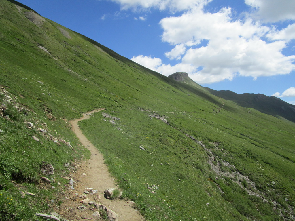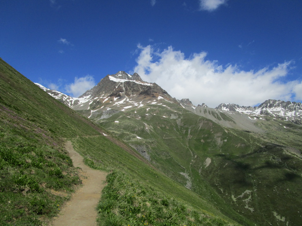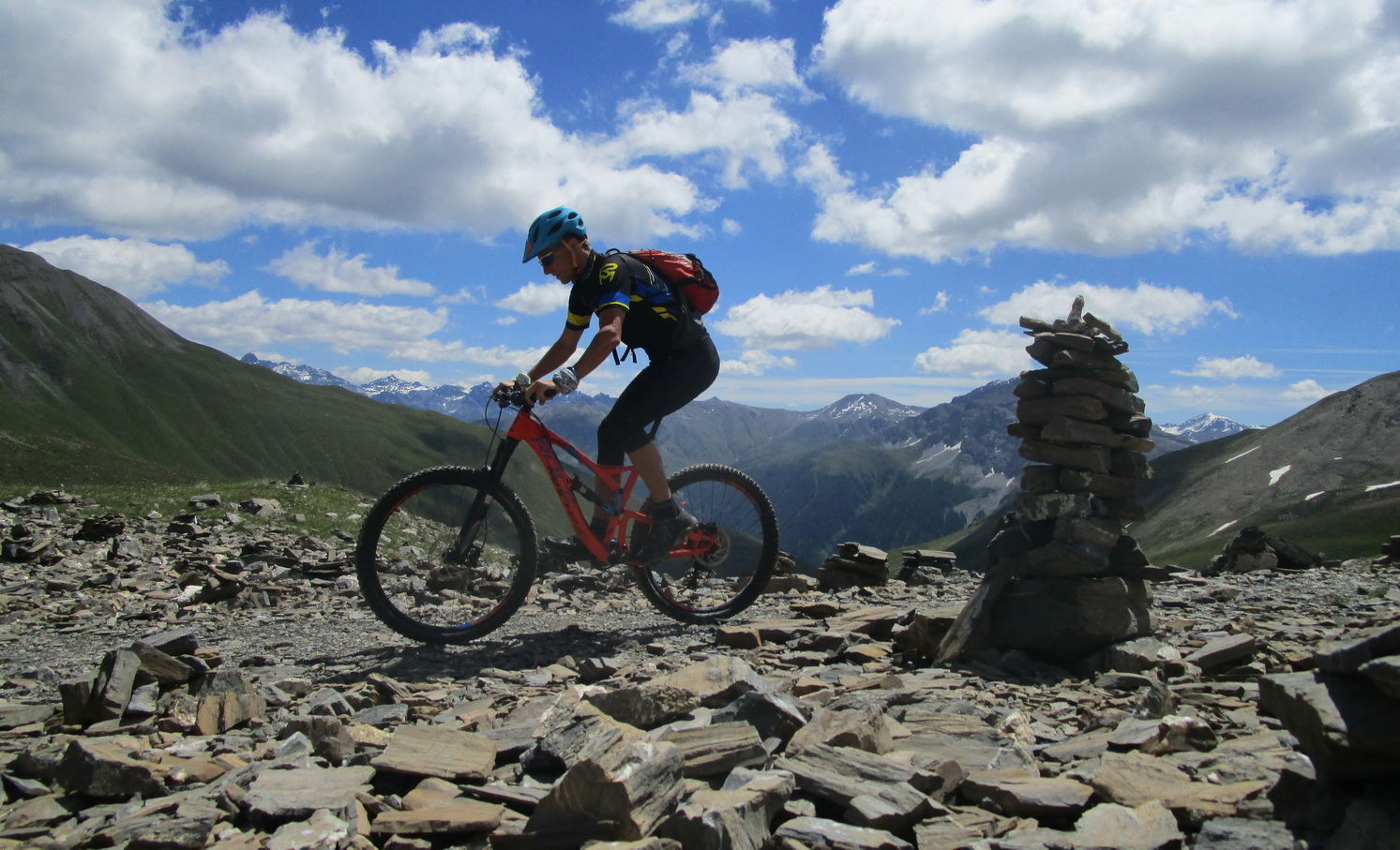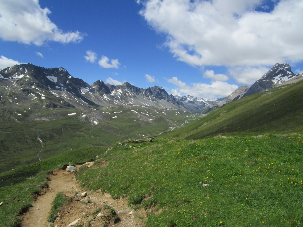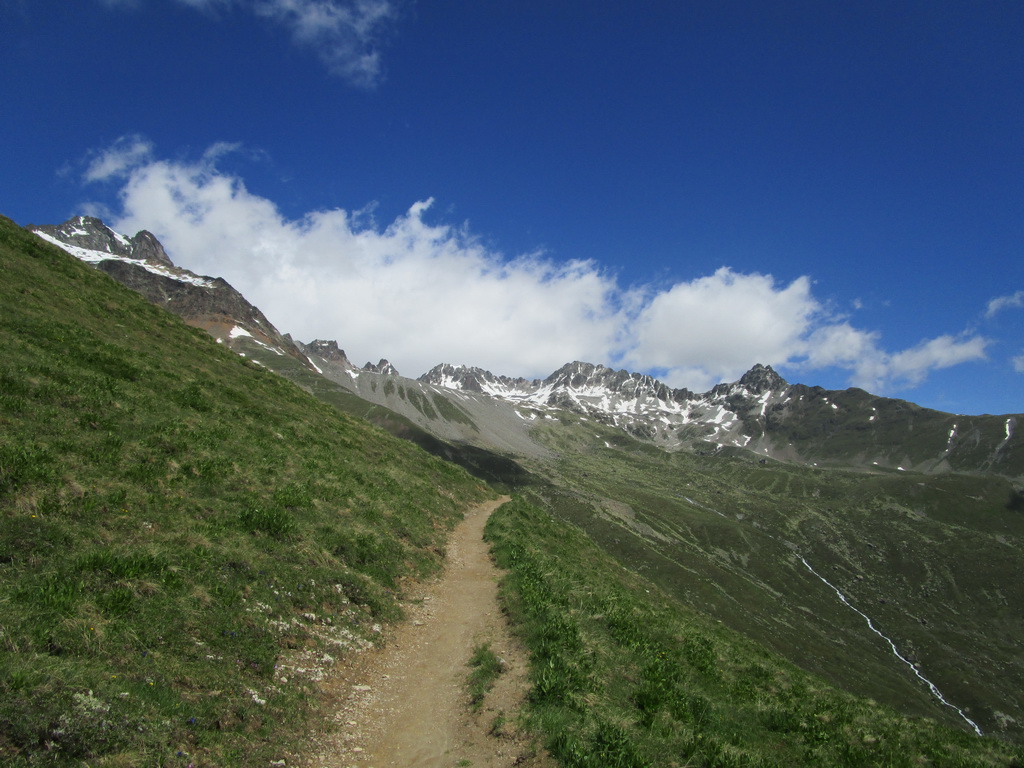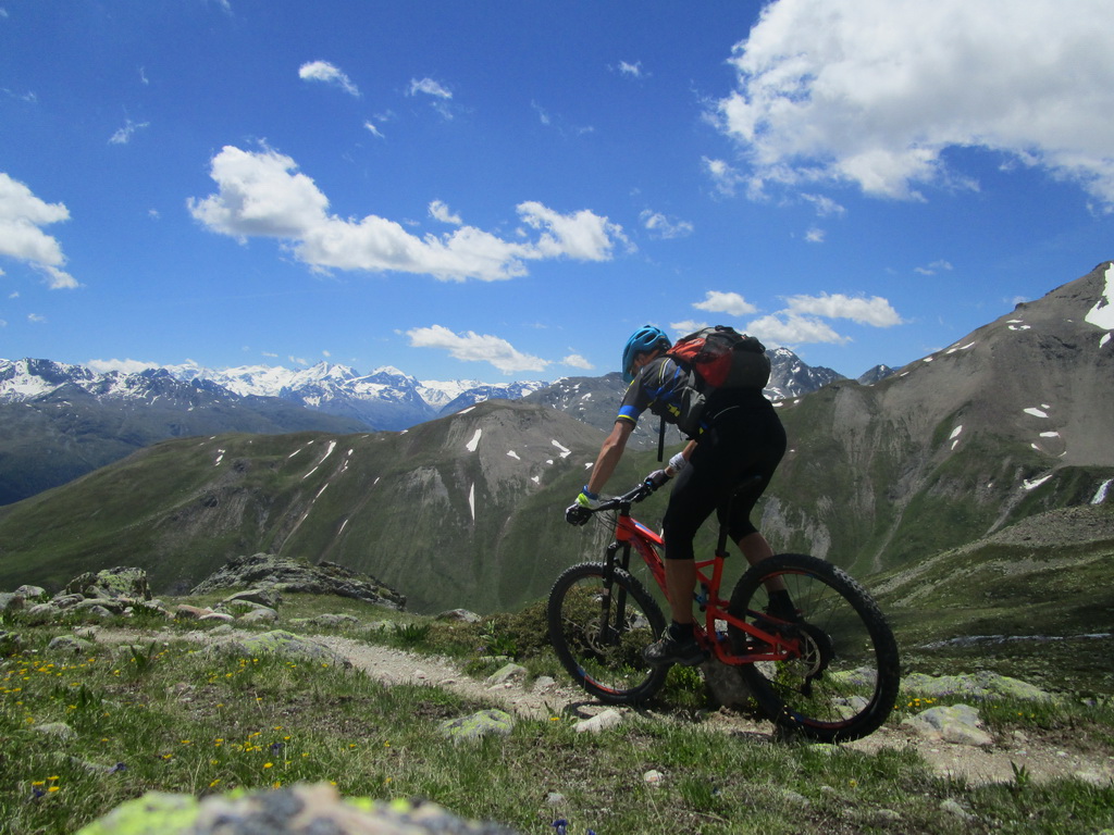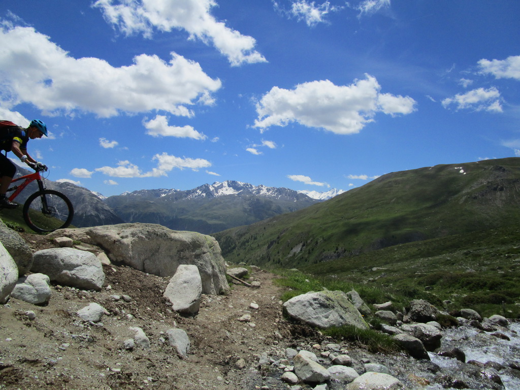 Ešte pred dosiahnutím najvyššieho bodu stúpania odbočíme na turistický chodníček smer Es-cha hutte. Po krátkom tlačení sa dostaneme na traverzový chodník vedúci zo sedla Albula. Ním pokračujeme striedavo v sedle bajku s občasným zosadnutím až do sedielka, kde sa nám otvorí výhľad na Val d'Es-cha a masív vrcholu Piz Kesch. Odtiaľto pokračujeme jazditeľným traverzom až ku suťovisku, ktoré býva zastavané množstvom skalných mužíkov.