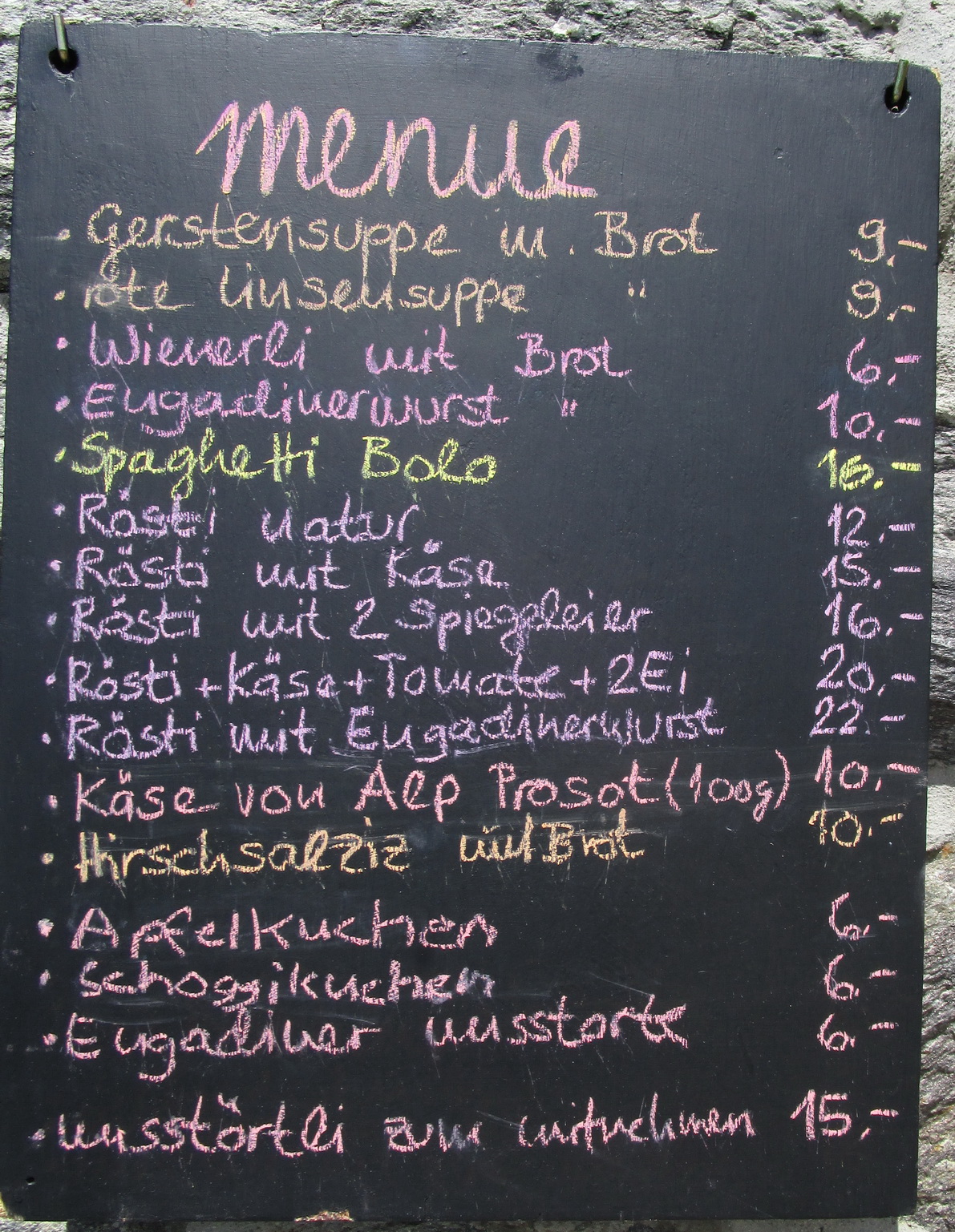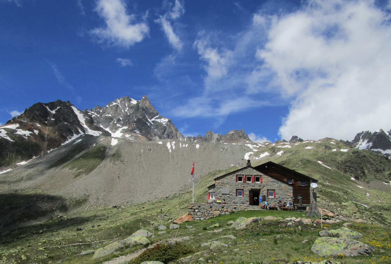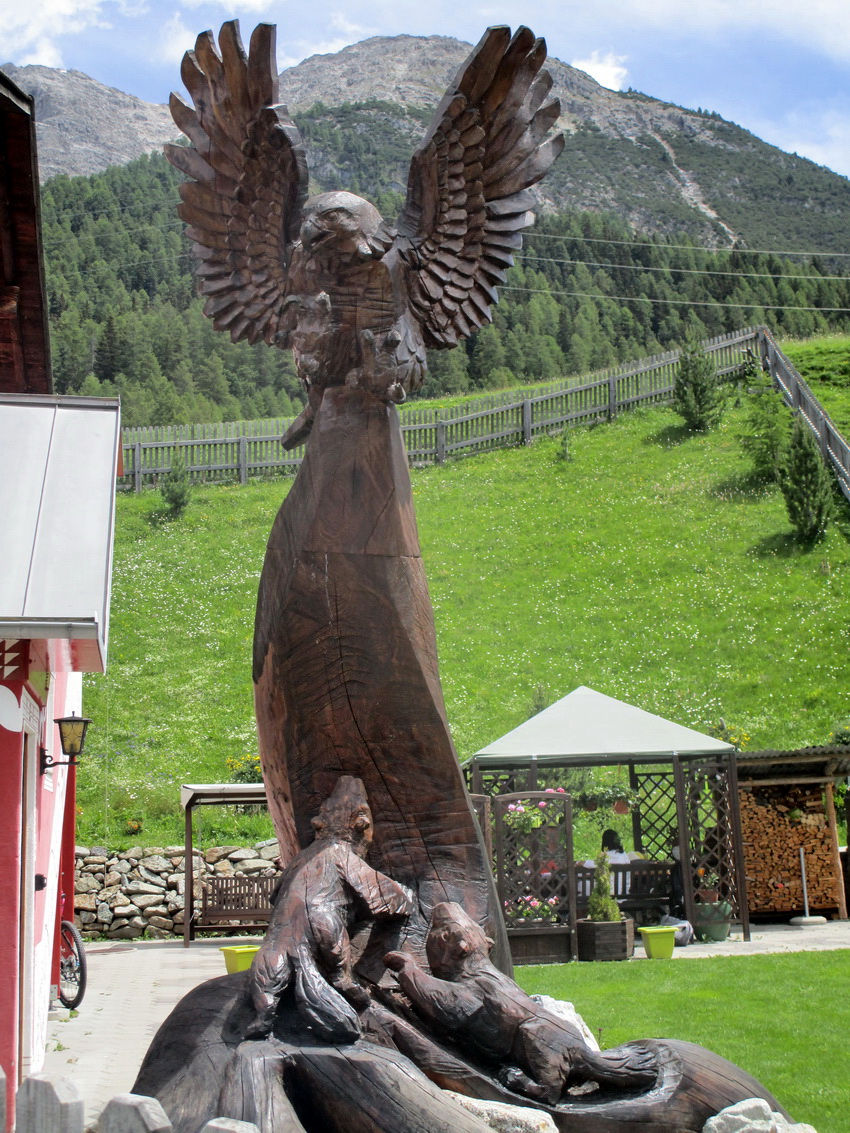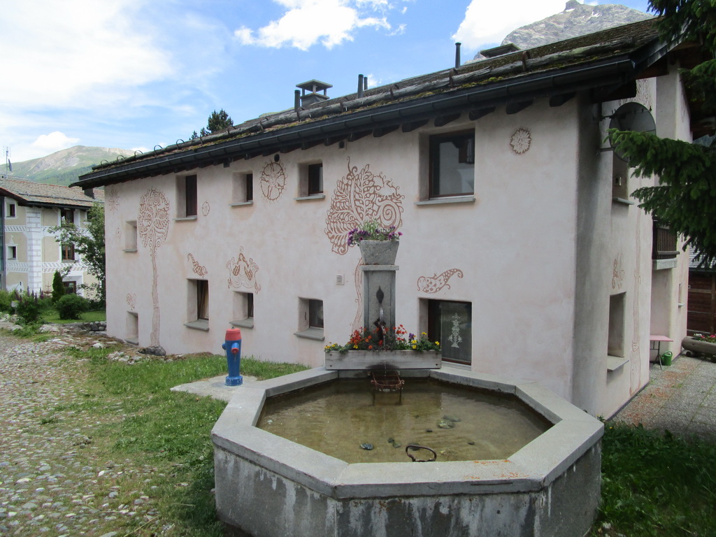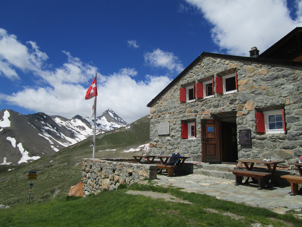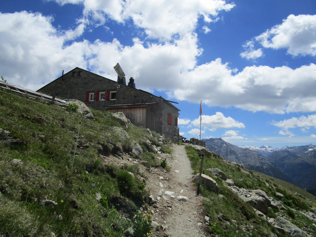 Tu je križovatka turistických chodníčkov. My pokračujeme ďalej traverzom až ku chate Es-cha. Na niekoľkých miestach je potrebné kvôli veľkým kameňom na chvíľu z bajku zosadnúť. Na chate sa oplatí dať si pauzu. Z terasy sú výborné výhľady na Berninské Alpy a okolie (jedálny lístok s cenníkom v galérii).
