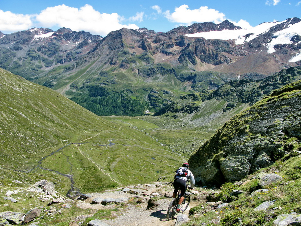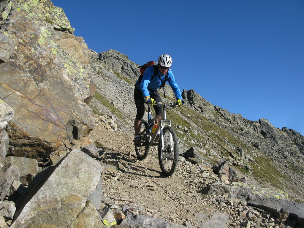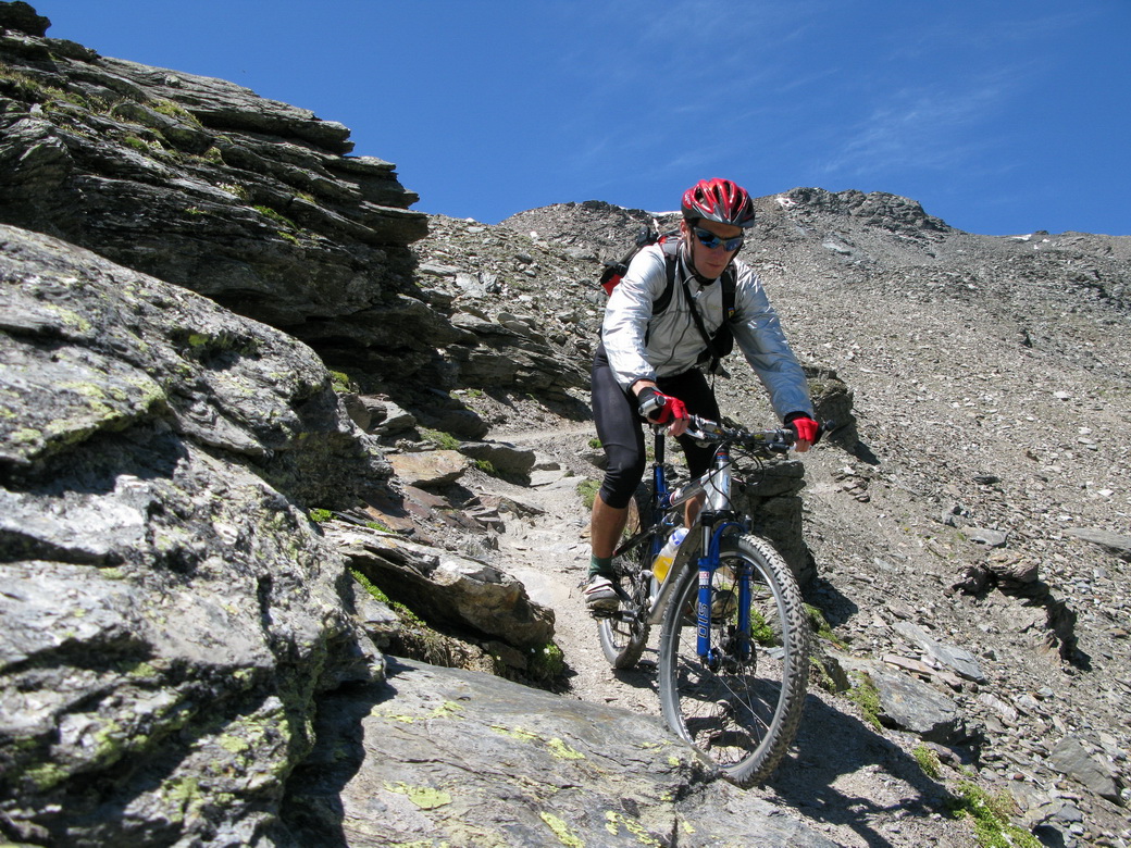 Nie som však nijako nadšený, že musím fotiť stále len seba a preto využívam každú možnosť odfoťiť aj niekoho iného. Tejto fotke sa nemec Rainer veľmi potešil, keď som mu ju poslal v plnej kvalite. Stretli sme sa večer vo Val Mora, mali sme spoločnú cestu, tak sme išli ďalej spolu. V závere stúpania sme sa vynorili z tieňa a ja som začal cítiť šancu na dobrú fotku. Šliapol som do pedálov, trochu som mu ušiel, rýchlo som vytiahol foťák a cvak. S tepom okolo 180 som ho rýchlo vyfotil. Muselo to vyjsť na prvý pokus, večer o ôsmej sme už mali obaja dosť a na nejaké pózovanie veru nebol čas.