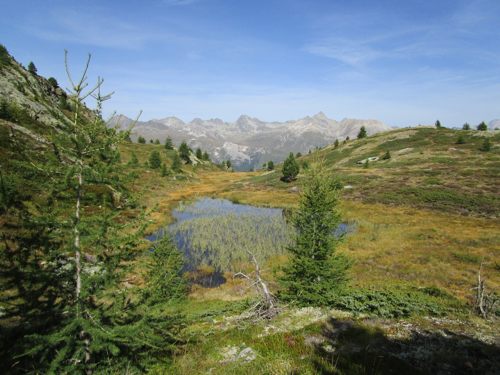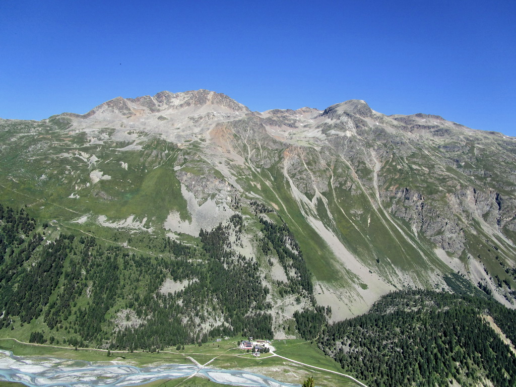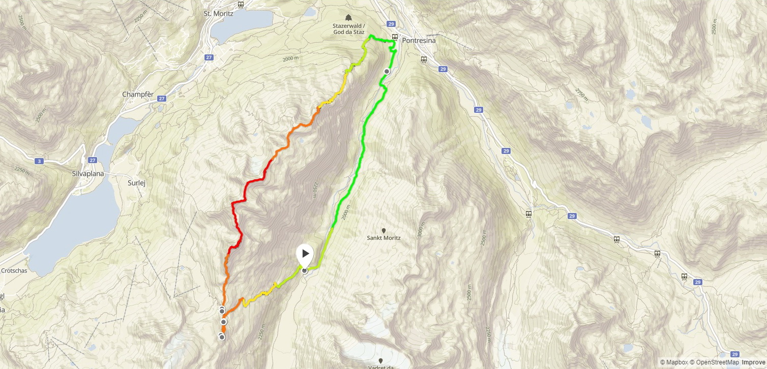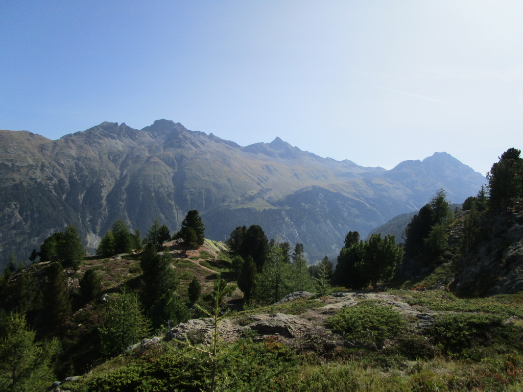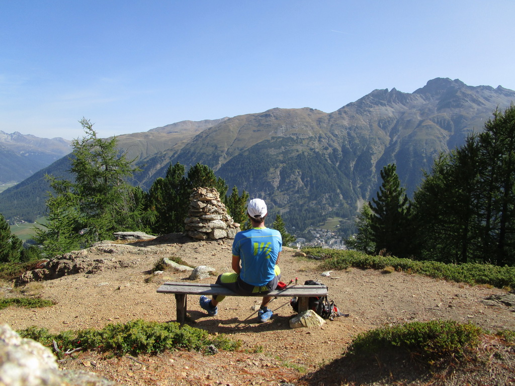 Pred Pontresinou som v prameni dočerpal tekutiny. Chystal sa teplý deň a bolo mi jasné, že na hrebeni kam sa chystám možnosť doplniť tekutiny nebude. Najprv ma čakal značkovaný chodníček serpentínami hore ku vyhliadke na hornej hranici lesa nad Pontresinou. Veľmi pekné miesto, ostatne asi ako všade naokolo...