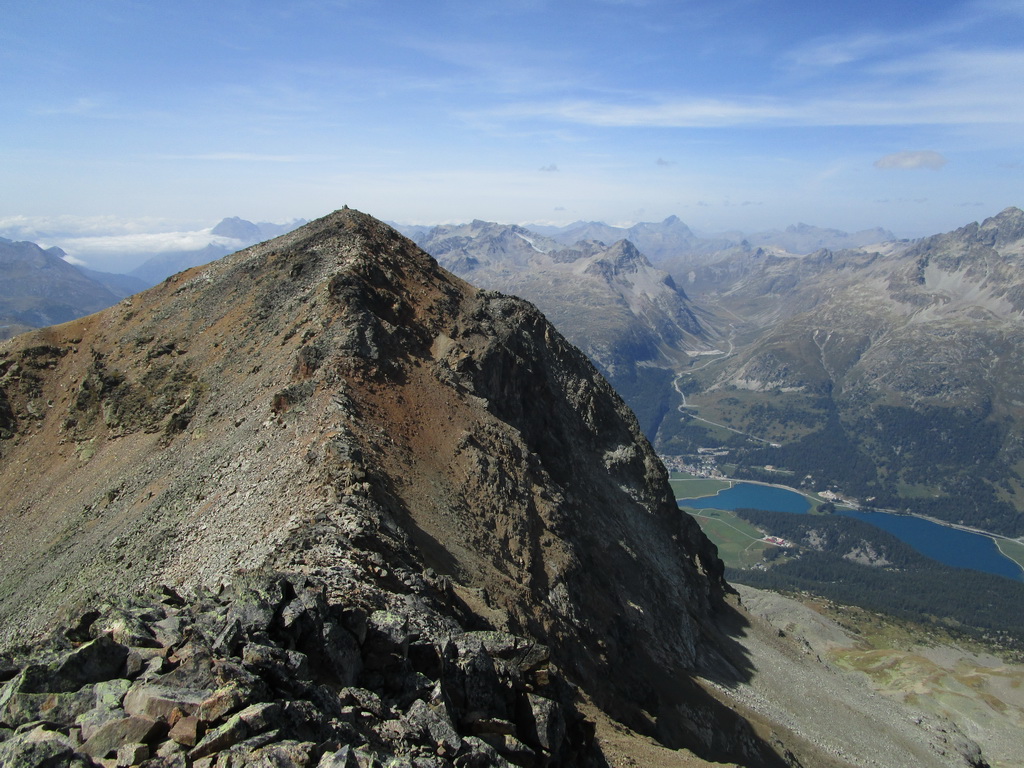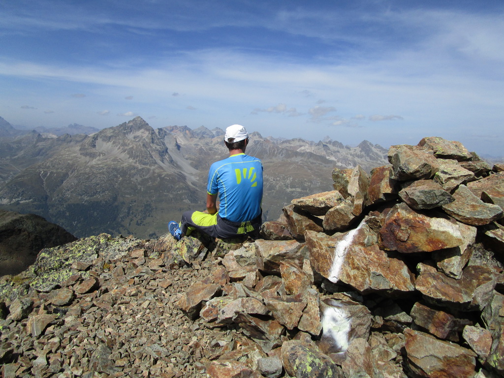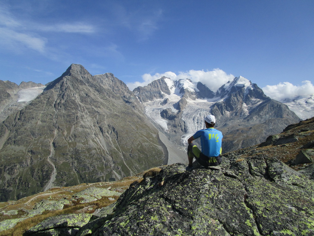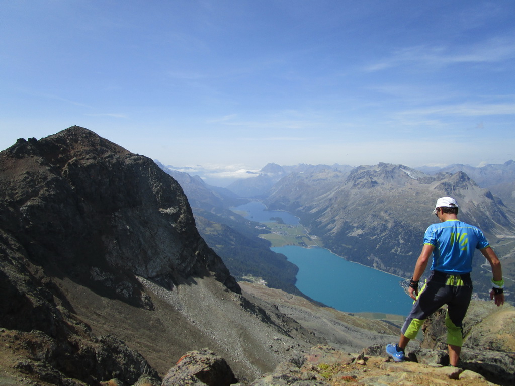 Na Piz Mezdi stretávam pár ľudí. Od Moritzu sem vedie značkovaný chodník. Sú to prví a zároveň poslední ľudia na hrebeni. Pokračujem cez Piz Rosatsch. Krásna expozícia ponúka výborné možnosti fotenia na samospúšť. Dnes to hojne využívam. Mojím cieľom nie je bežať a bojovať o každú minútu. Rýchle úseky presunu striedajú fotopasáže, kde pobehujem medzi statívom a pózovaním...