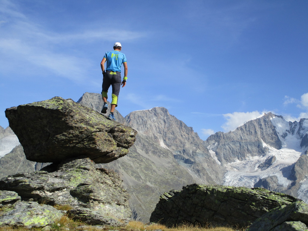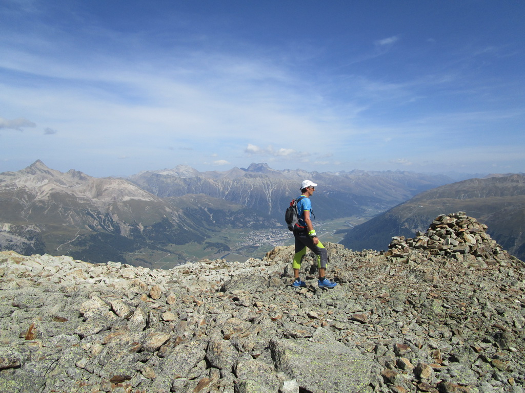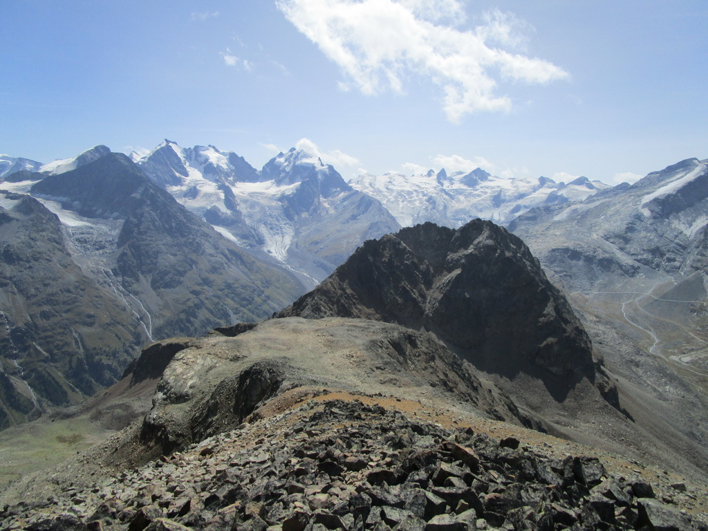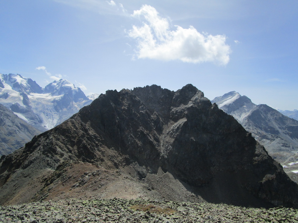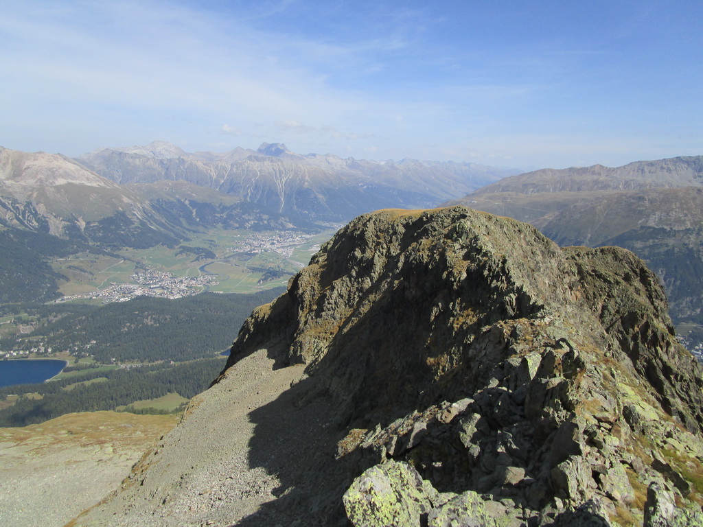 Na Piz Mezdi stretávam pár ľudí. Od Moritzu sem vedie značkovaný chodník. Sú to prví a zároveň poslední ľudia na hrebeni. Pokračujem cez Piz Rosatsch. Krásna expozícia ponúka výborné možnosti fotenia na samospúšť. Dnes to hojne využívam. Mojím cieľom nie je bežať a bojovať o každú minútu. Rýchle úseky presunu striedajú fotopasáže, kde pobehujem medzi statívom a pózovaním...