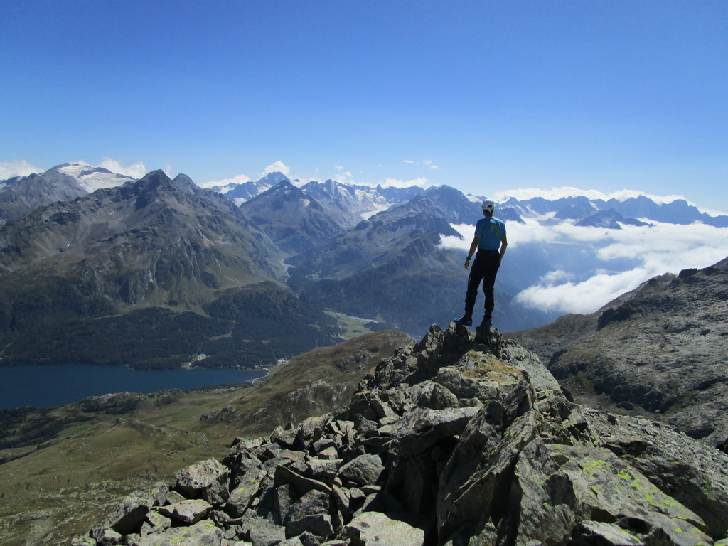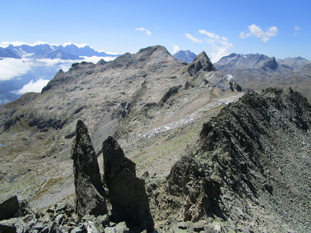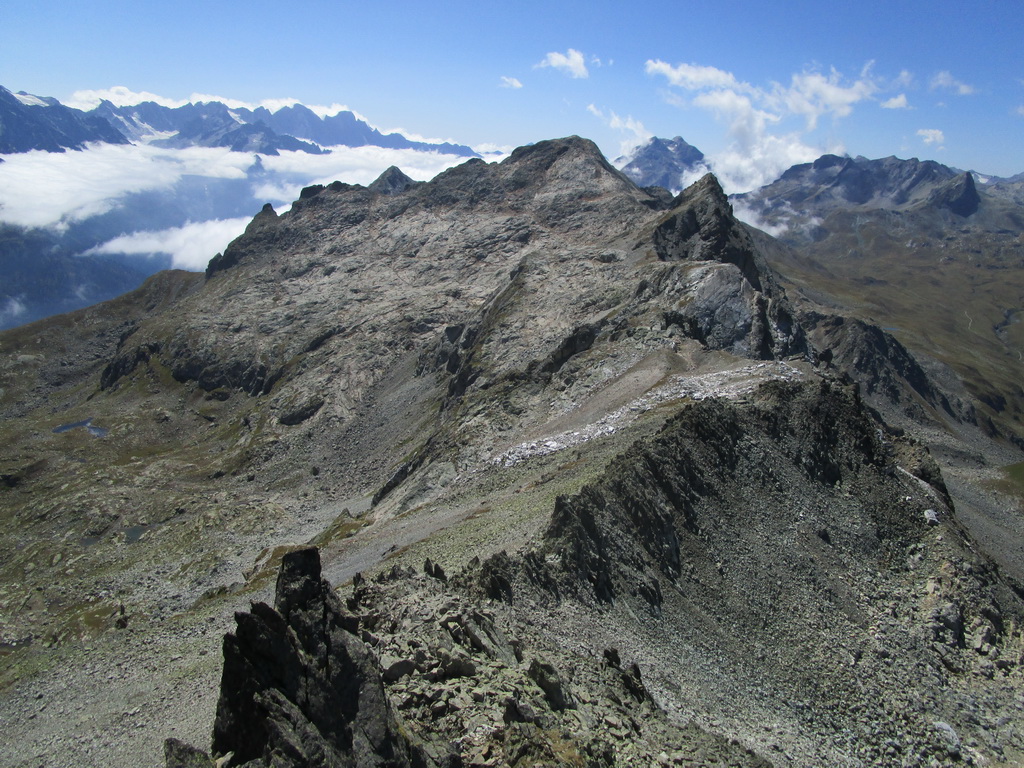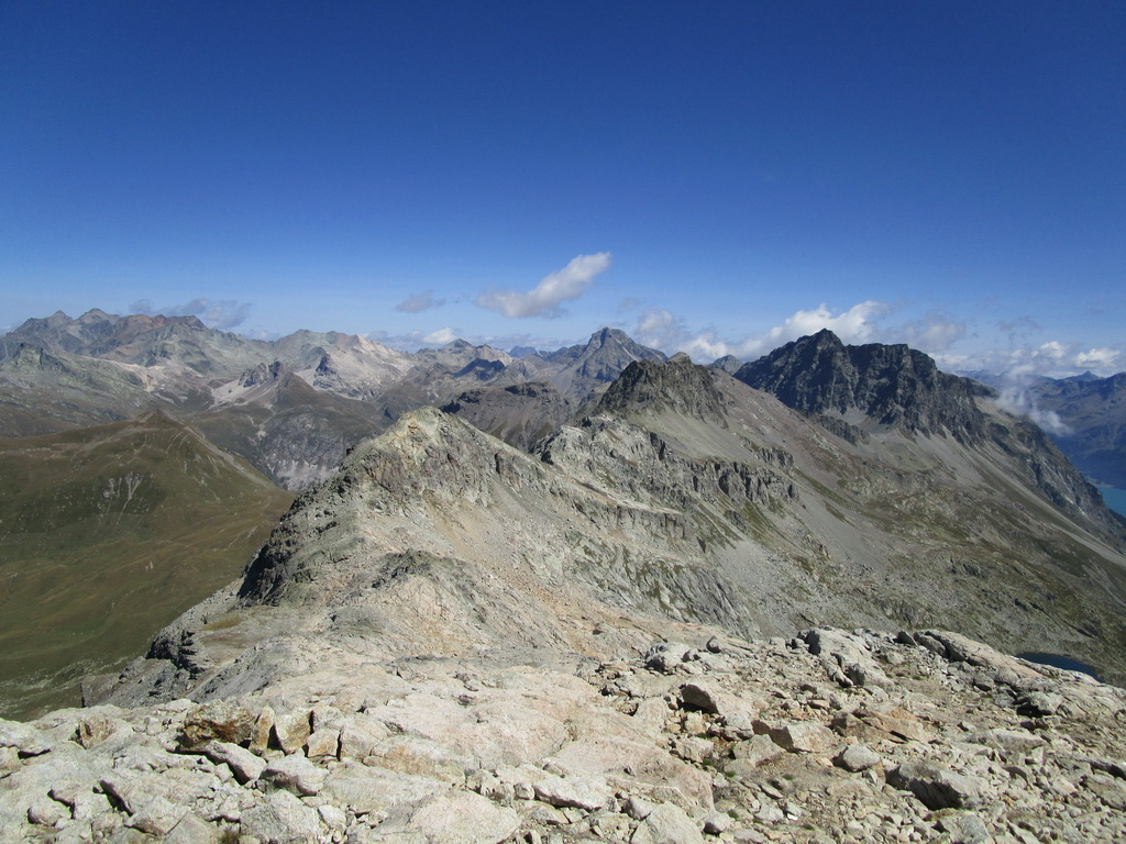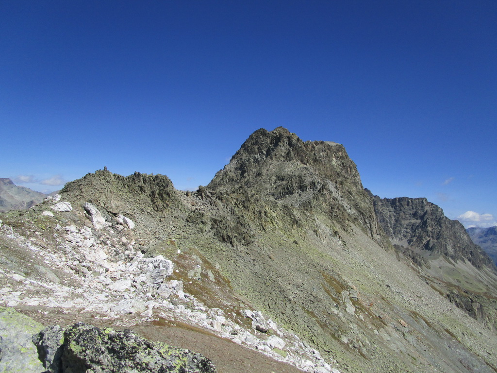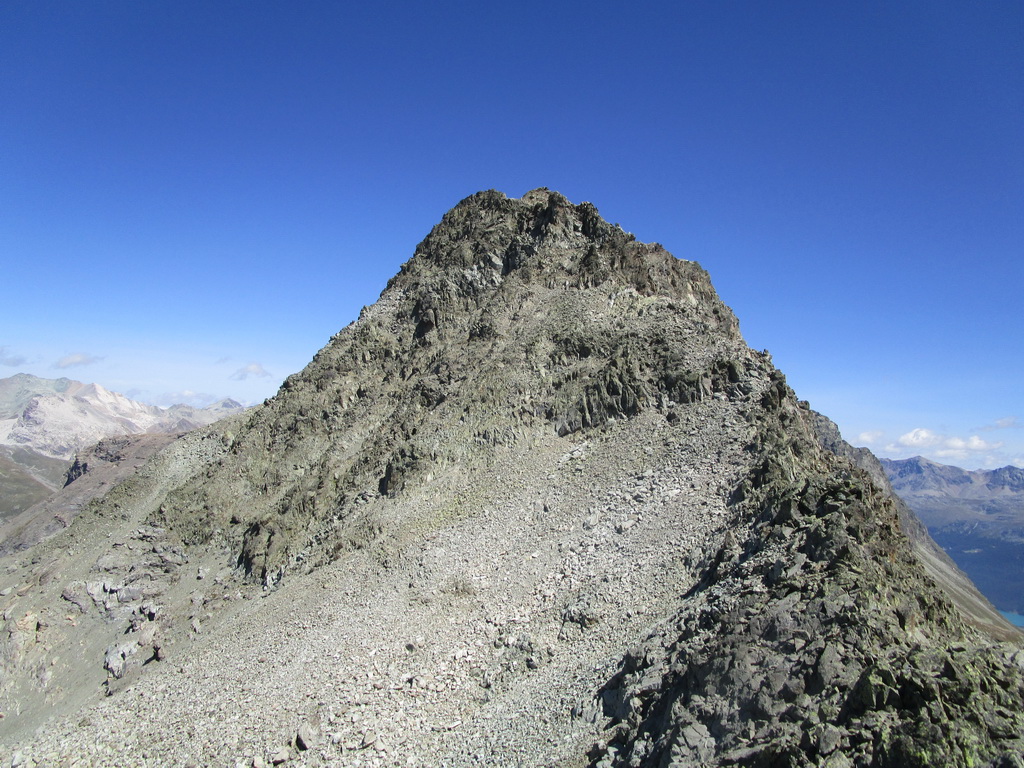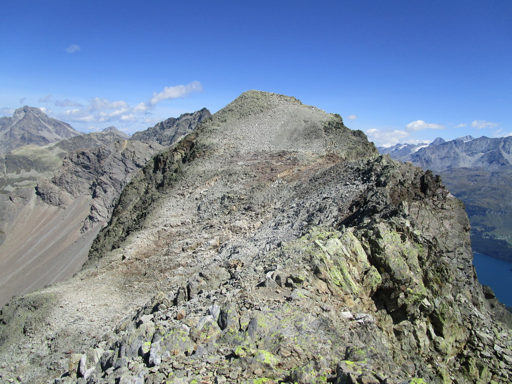 V sedle sa moja púť po značkovaných chodníčkoch na nejaký čas končí. Túto túru som si vyhliadol keď som nedávno stál na Piz da la Margna. Pozrel som sa cez dolinu, zbadal parádny hrebeň a bolo jasné. Vyrážam ku prvej vežičke. O nasledujúcom hrebeni nemám žiadne informácie, o to to bude krajšie.