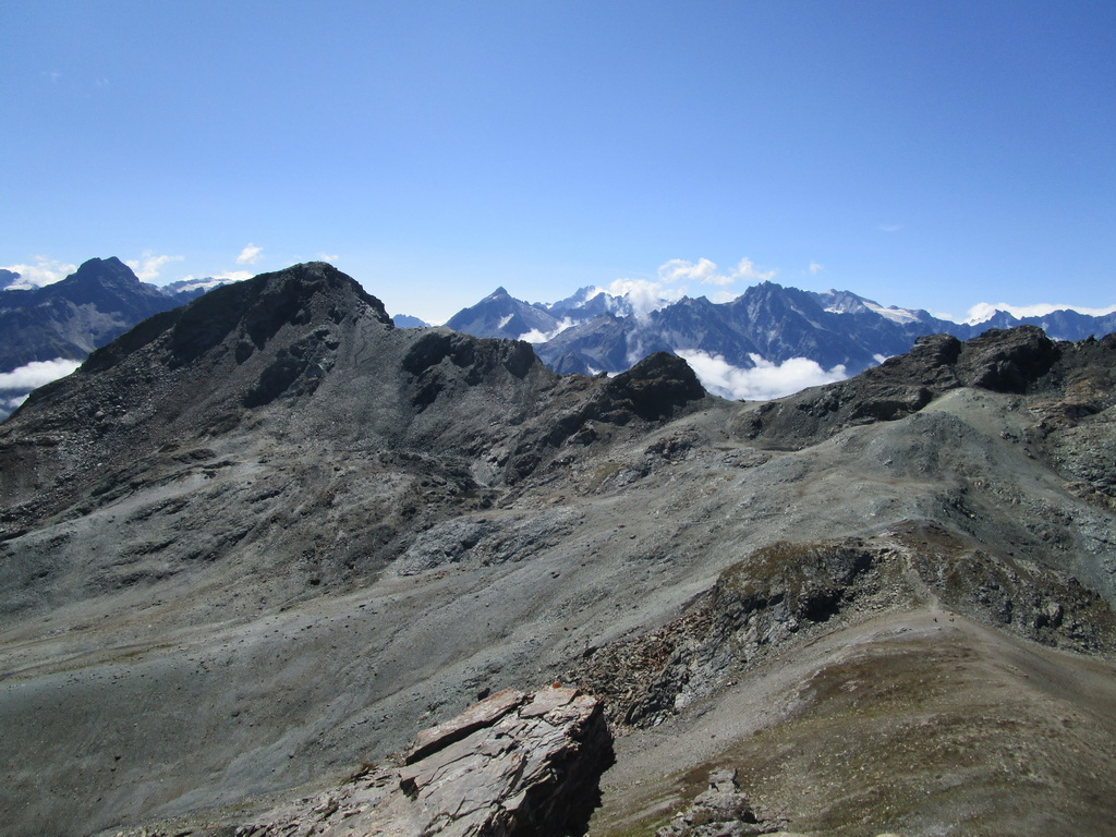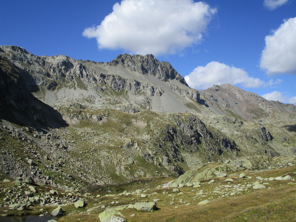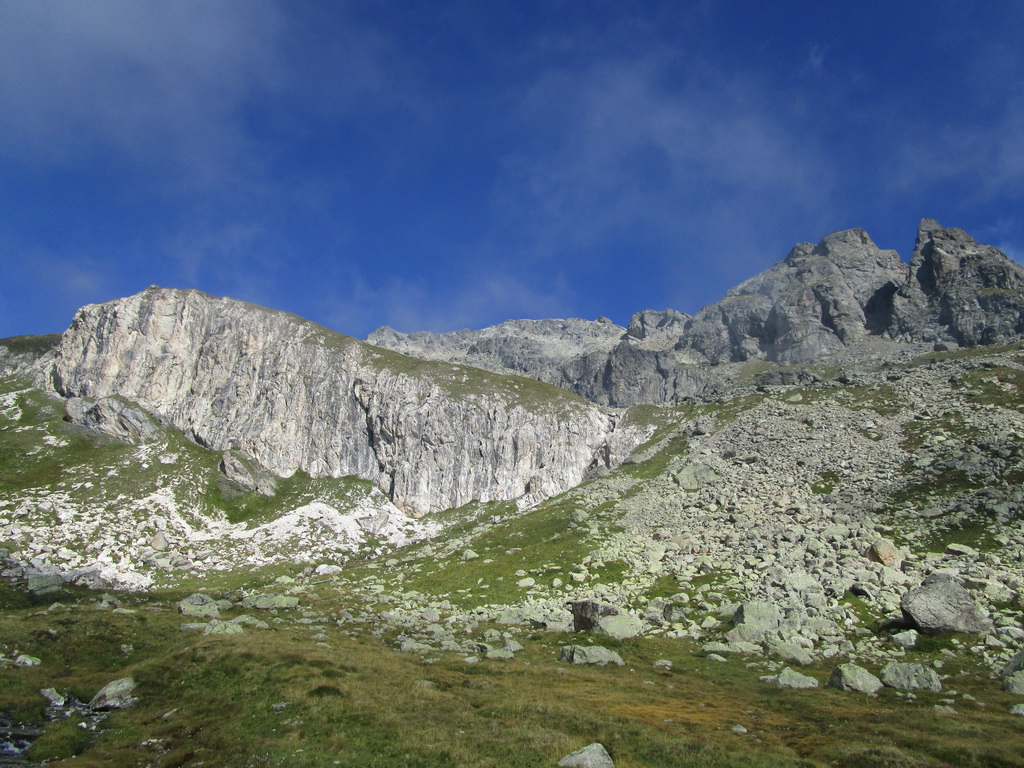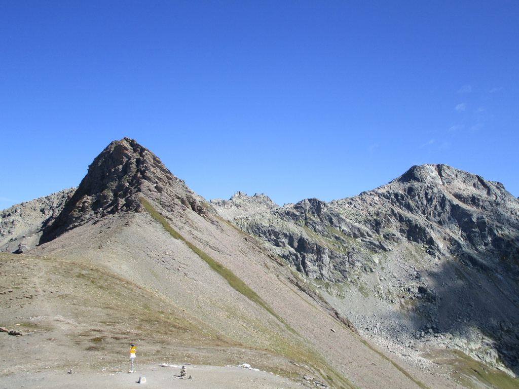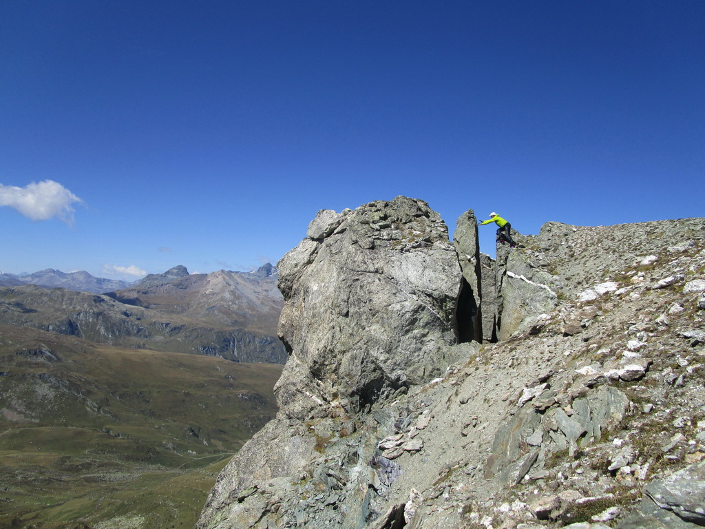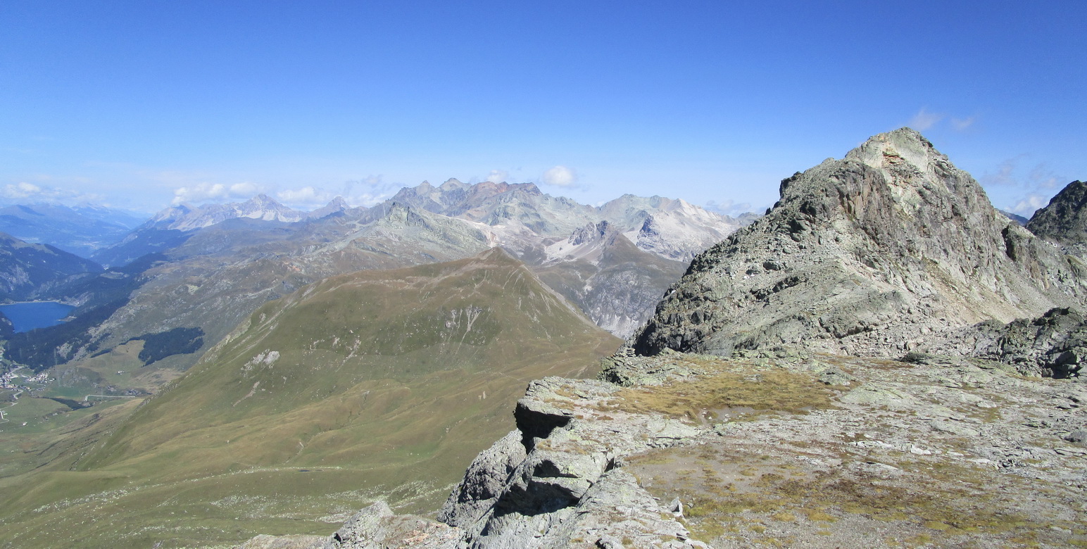 V sedle sa moja púť po značkovaných chodníčkoch na nejaký čas končí. Túto túru som si vyhliadol keď som nedávno stál na Piz da la Margna. Pozrel som sa cez dolinu, zbadal parádny hrebeň a bolo jasné. Vyrážam ku prvej vežičke. O nasledujúcom hrebeni nemám žiadne informácie, o to to bude krajšie.