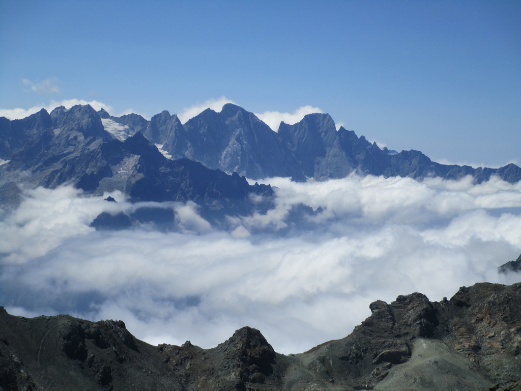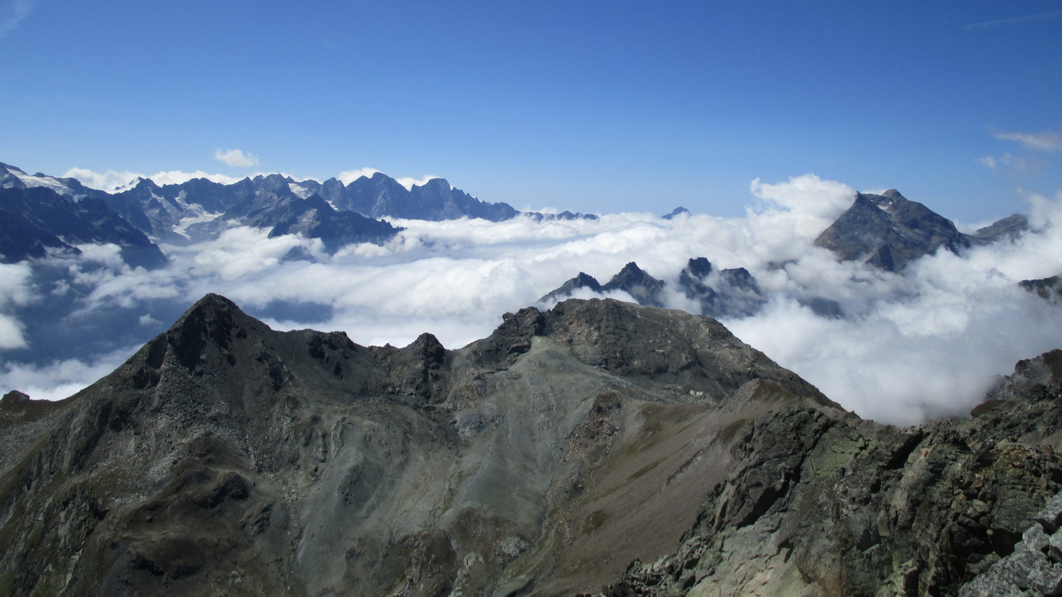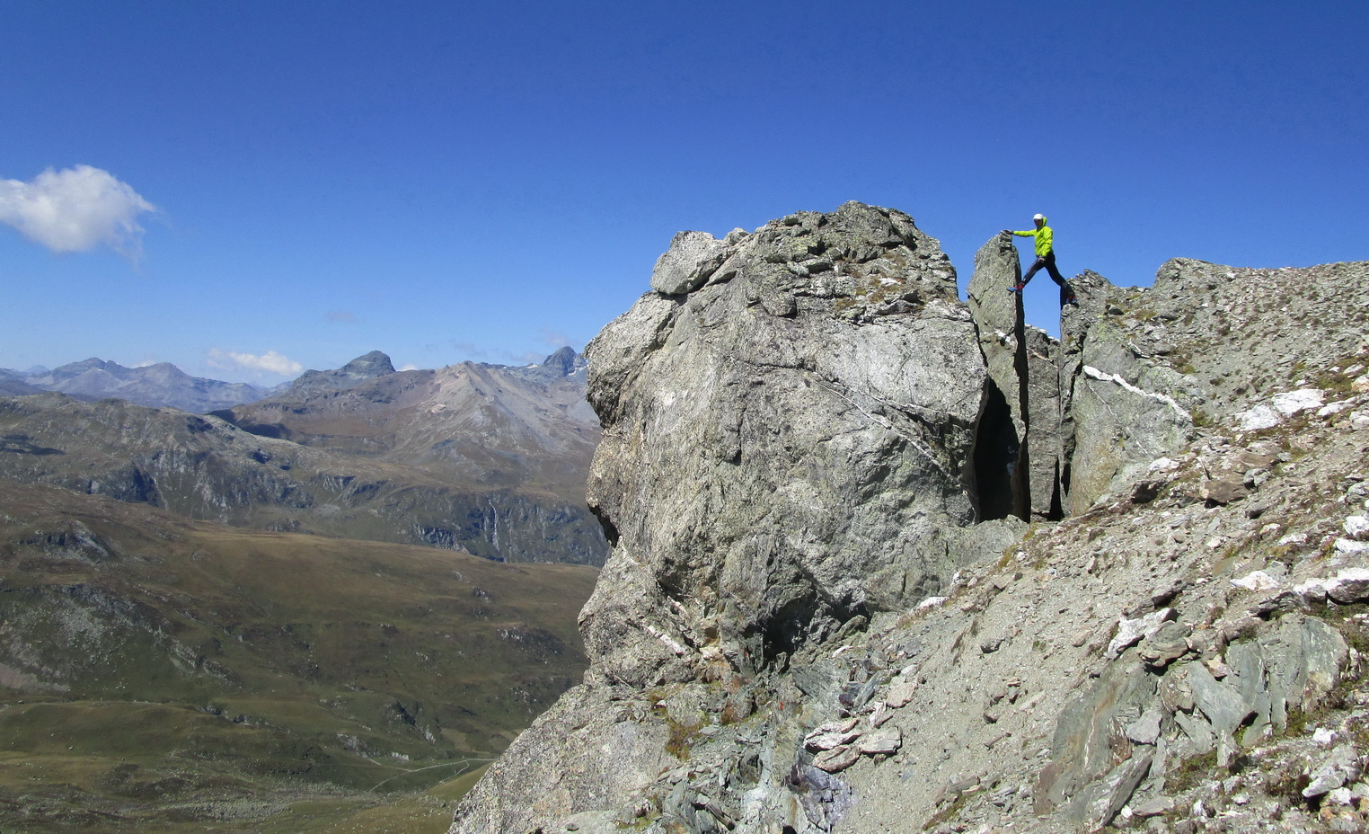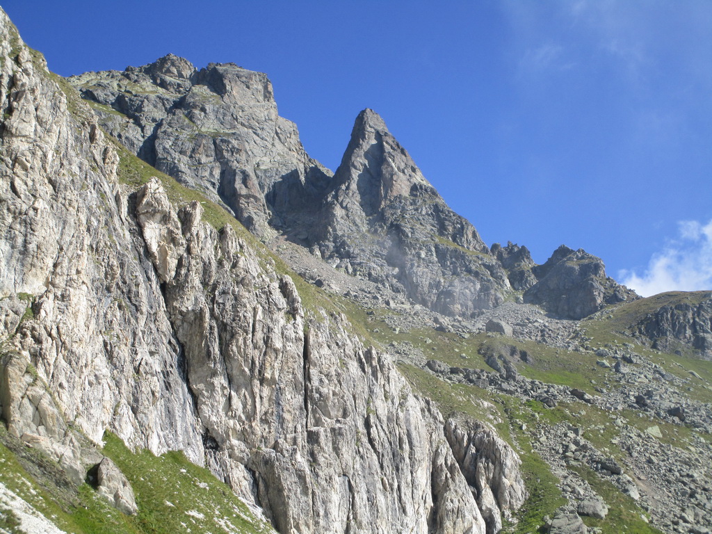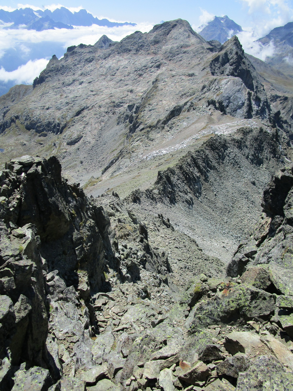 V sedle sa moja púť po značkovaných chodníčkoch na nejaký čas končí. Túto túru som si vyhliadol keď som nedávno stál na Piz da la Margna. Pozrel som sa cez dolinu, zbadal parádny hrebeň a bolo jasné. Vyrážam ku prvej vežičke. O nasledujúcom hrebeni nemám žiadne informácie, o to to bude krajšie.