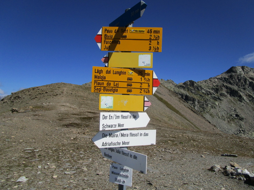 Parkujem na už známom parkovisku pred Malojou v smere od Moritzu vpravo hneď pri ceste, pod kopcom. Odtiaľto štartuje červená značka až na Pass Lunghin. Toto sedlo je vraj jediné miesto v Európe z ktorého odteká voda na všetky tri strany, teda do troch morí: Severného, Stredozemného a Čierneho.