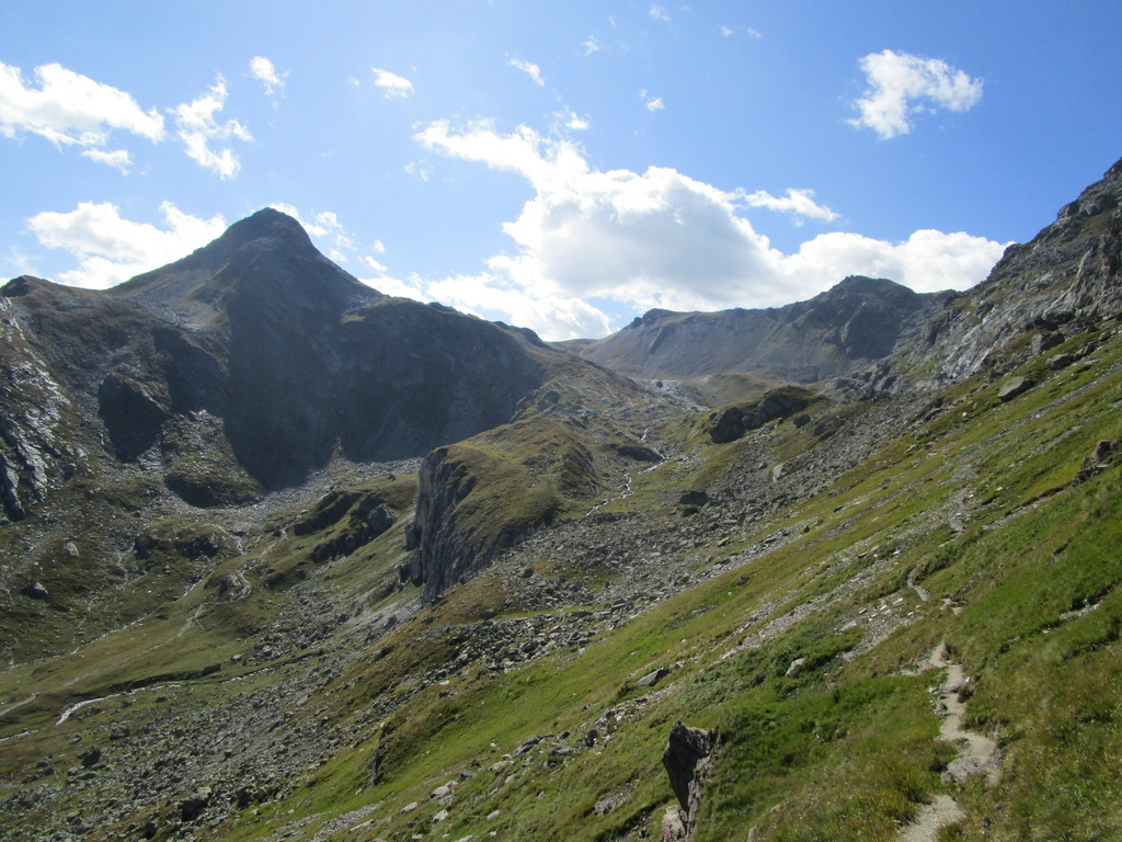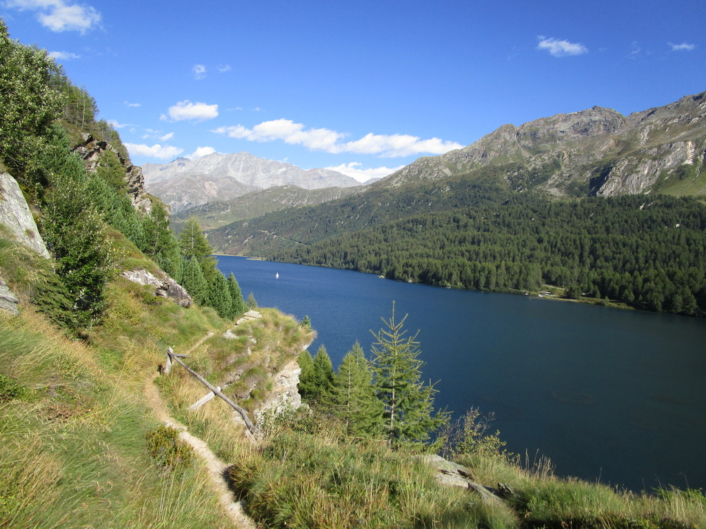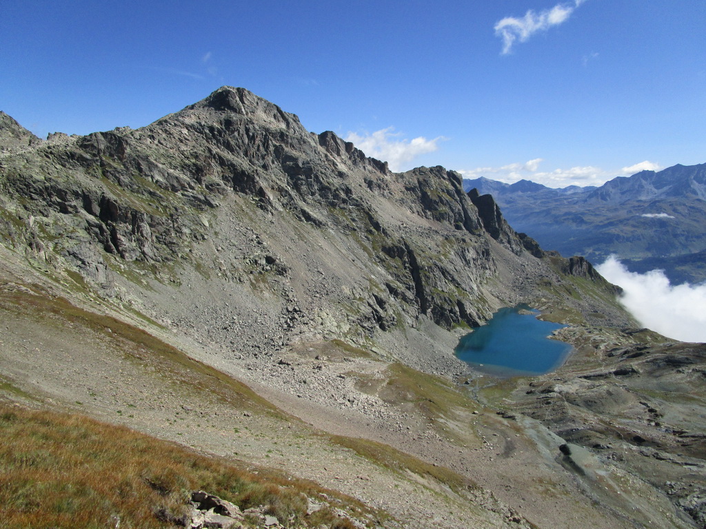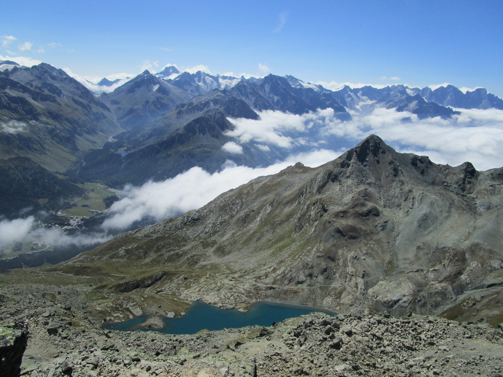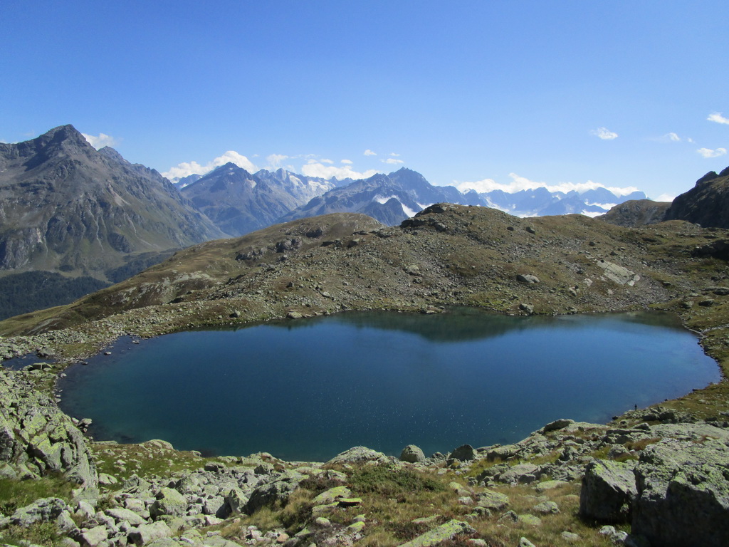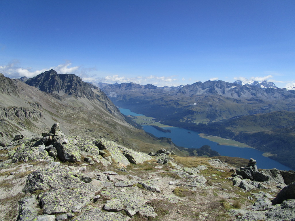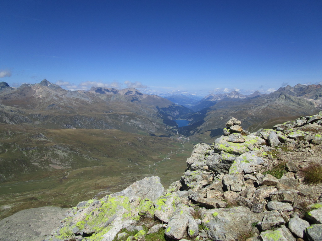 Návrat tou istou trasou pod vrchol. Odtiaľ zbieham dole po suti, napojím sa na turistický chodníček a po ňom sa dostanem opäť ku jazeru Lunghin. Tu uzatváram okruh. K autu dole rovnako po červenej smer Maloja...