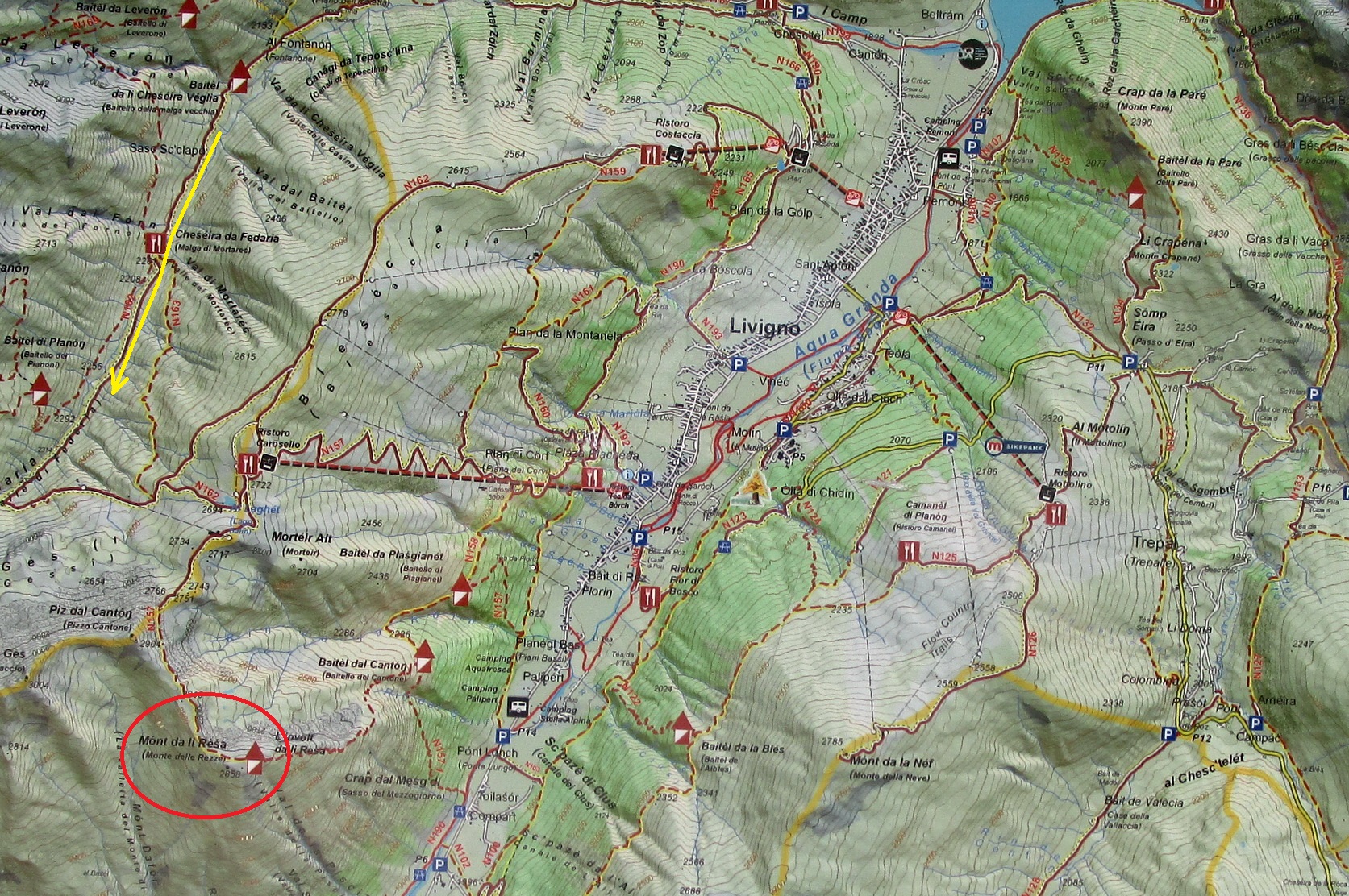 Parking pod Motolinom údolná stanica je veľký a bezplatný. Pitná voda. Záchody neďaleko. Občas tu stretnem auto s evidentnými nocľahármi. Odtiaľto vyrážam po cyklotrase do ústia Val Federia. Dolinou vedia strmá asfaltka ktorá asi v polovici doliny sa zmení na šotolinu. Už v druhej polovici doliny prejdem okolo kravína ktorý popri tradičnom hospodárstve sa venujem zároveň turistom a ponúka nejaké občerstvenie. Prefrčím okolo a mierim si to do záveru doliny. Vľavo zhora sa tu dole vynára pekný trail vyrobený špeciálne pre MTB ja však idem rovno ďalej. Budem stúpať po šotoline ktorá sa neskôr zmení na zjazdovku.