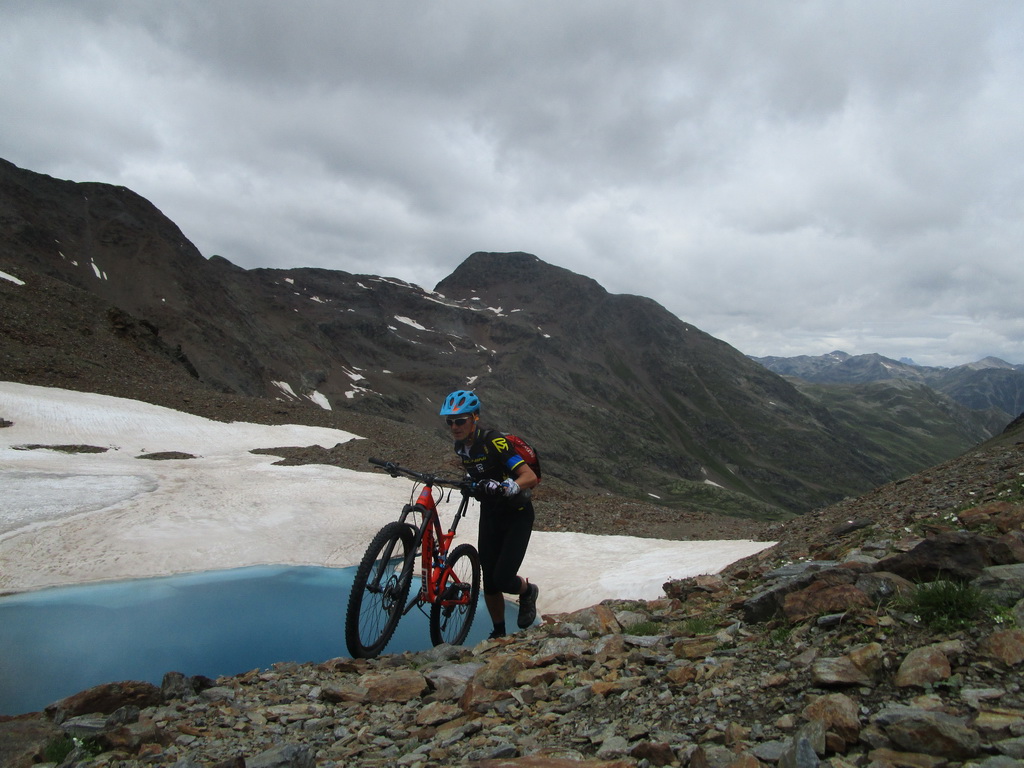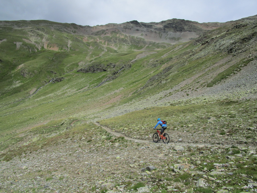 Zjazd zo sedla na druhú stranu netrvá dlho a musím zosadnúť. Začína najnepríjemnejšia časť túry. Ťažko vytlačené výškové metre schádzam peši vedľa bajku. Bohužiaľ úsek je úplne nezjazdný. Na bajk naskakujem opäť až kus nad jazerom vo val Minestra. Tu už je terén opäť zjazdný. Nachádzam odbočku smerom na traverz pod sedlo Valécia.