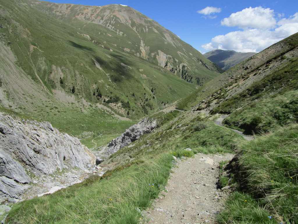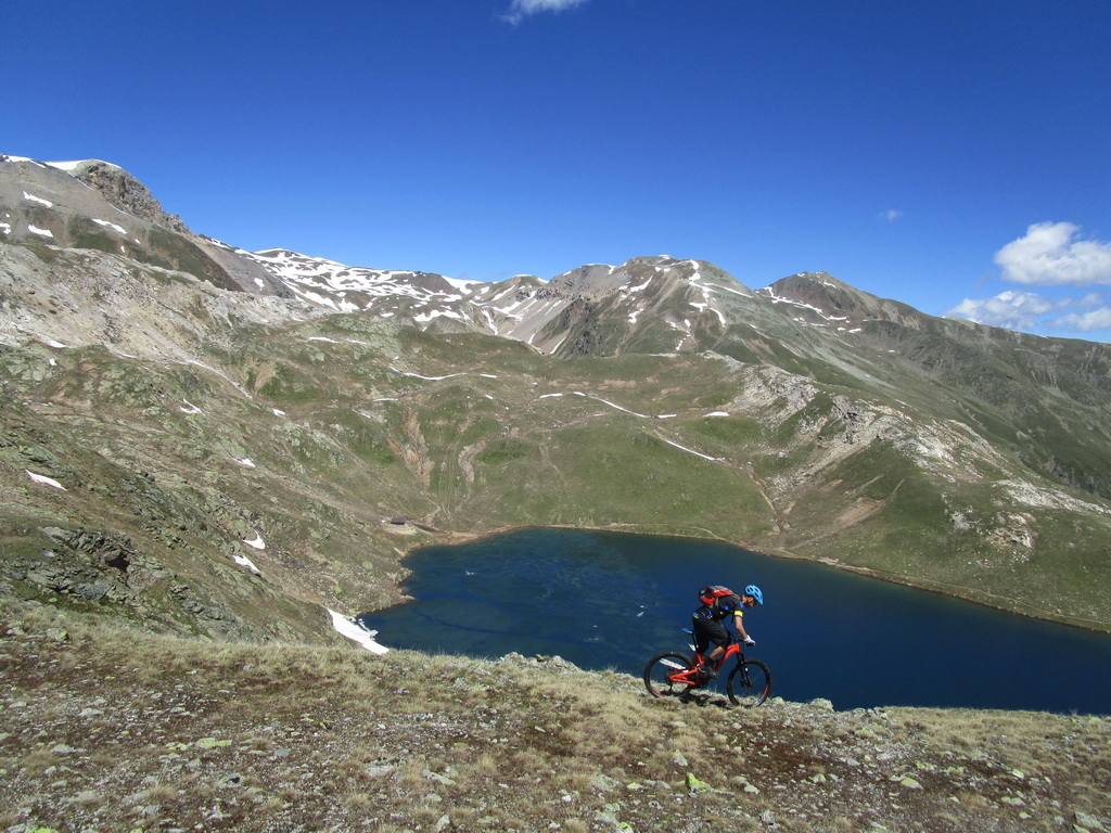 Pri jazere ja bivakovacia chatka, nebol som v nej ale vraj je v tam útulne a je dobre vybavená. Po väčšinou zjazdnom traverze následuje zjazd ku jazeru. Vedie po pravom úbočí pri pohľade zhora. Dostaneme sa až ku miestu kde z jazera vyteká potôčik. Nedajte sa zlákať chodníčkom vľavo dole ale pre nás bajkerov je tu trail vedúci viac vpravo. Následuje úžasný zjazd. Krásne serpentíny, všetko zjazdné ale ťažké. Keď sa po dlhom zjazde dostanete na štrkovú cestu v dolnej časti doliny, budete už aj možno radi že si ruky oddýchnu.