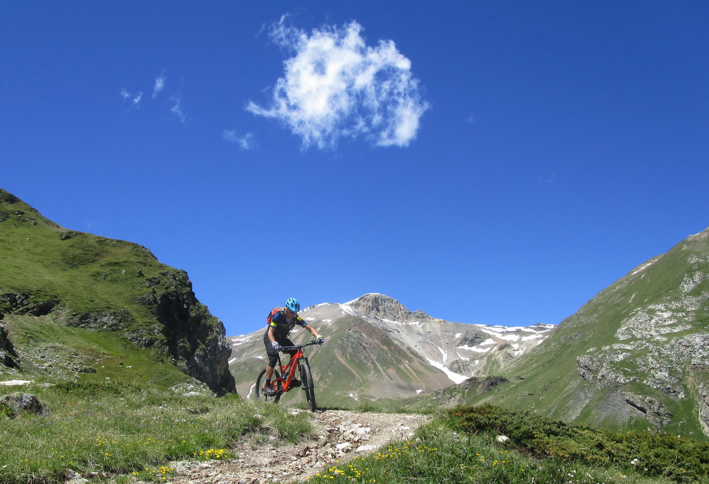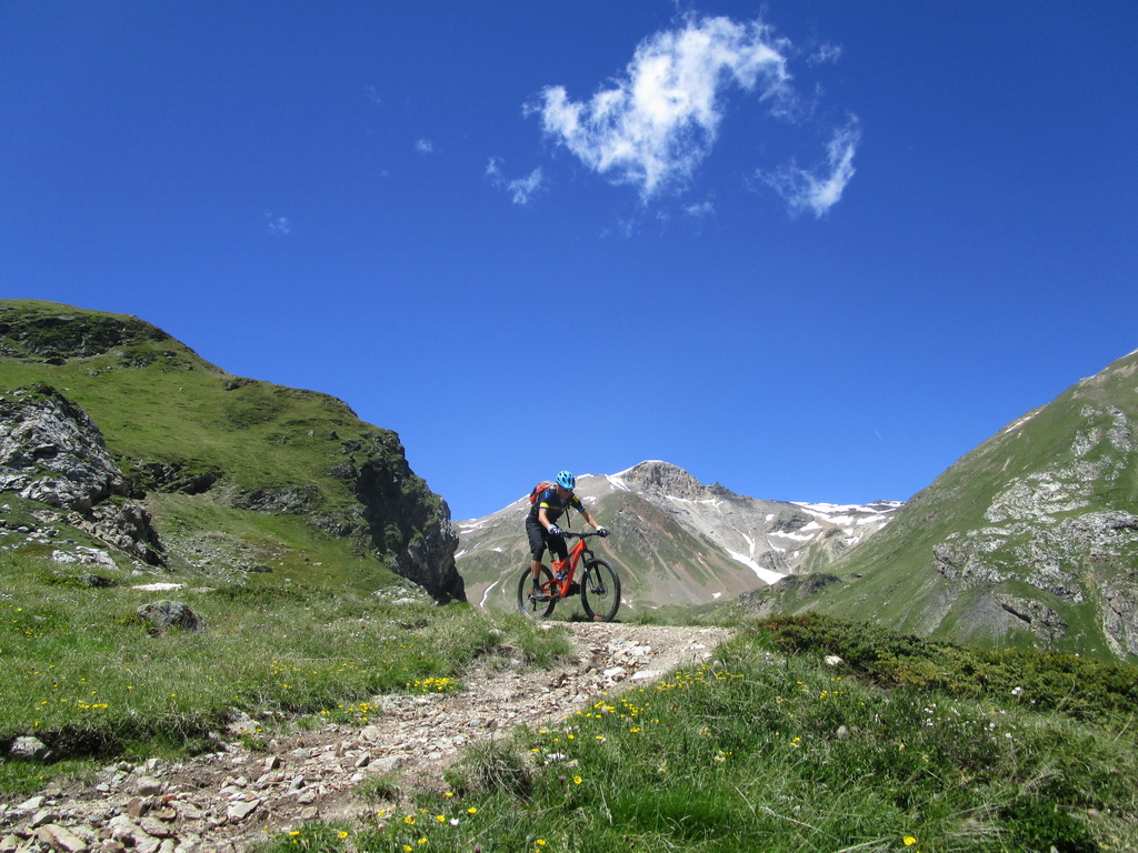 Valle del Monte - je dolina tak trošku mimo hlavného ruchu ale stále v bezprostrednej blízkosti Livigna. Aby sme sa dostali na začiatok zjazdného trailu bude tentoraz potrebné tlačiť - stojí to určite zato. Pre zokruhovanie tejto túry z Livigna je potrebné dostať sa do sedla La Stretta (2465m.), ktoré sa nachádza na hranici so Švajčiarskom nad asfaltovou cestou v stúpaní na Forcola Livigno.