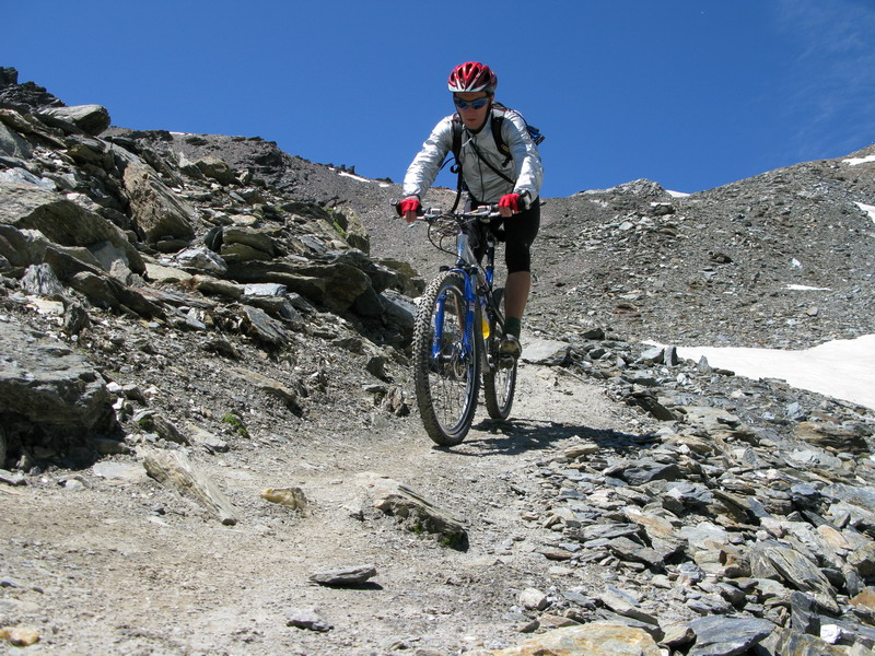 Hore v sedle na vás budú turisti pozerať, že "kamže s tým bikom"? Nenechajte sa vyviesť z rovnováhy, a s úsmevom sa popri biku vydajte kráčať dole. Prvých pár sto metrov jednoducho treba bike zniesť a potom to začne. Nádherný zjazd dlhou dolinou, hore ešte občas prerušený nezjazdnými pasážami, vás dovedie až do Martelltalu.