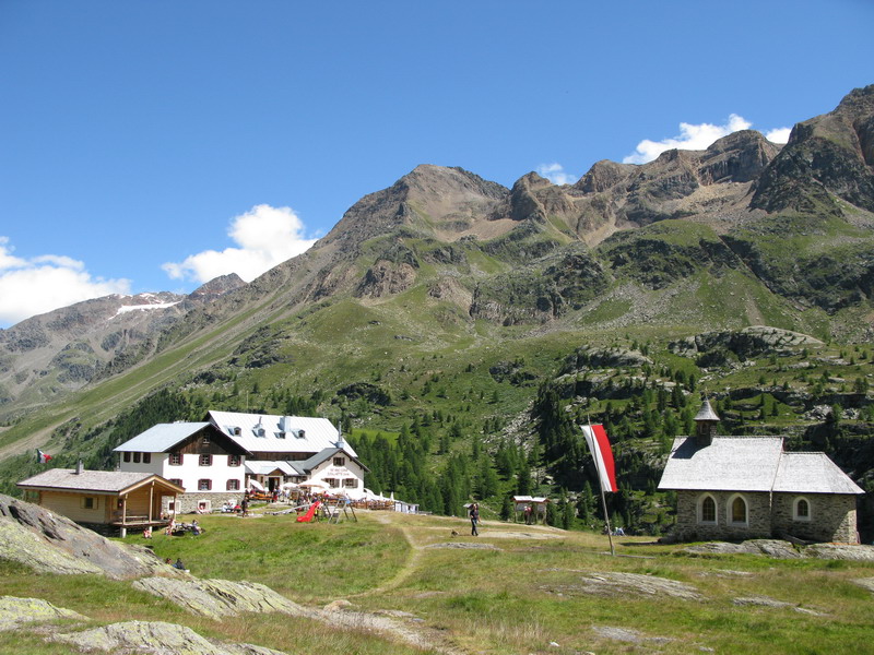 V závere doliny chodník prechádza popri vysokohorskej chate Zufallhütte. Tu som sa zastavil občerstviť sa a pokračoval po peknom a ťažkom chodníku dole, na rázcestí asi 1 km pod chatou si môžete predĺžiť zjazd odbočkou vpravo. Pri budove staršieho a odstaveného hotela však odporúčam napojiť sa už na cestu. Ja som totiž skúšal ísť ďalej po turistickom chodníku, ale viac som tlačil ako jazdil. Priehrada sa síce dá obísť po štrkovej ceste sprava, ale potom sa po priehradnom múre vráťte na hlavnú cestu. Ja som v očakávaní dobrého zjazdu pokračoval po chodníčku č.36 a moc sa mi to nevyplatilo. Aj napriek pár pekným úsekom som zase viac tlačil ako jazdil. Vzhľadom na dĺžku a náročnosť celého okruhu je lepšie v Martelltali už moc nešpekulovať a pustiť sa jednoducho dole po hlavnej asfaltke.V závere doliny treba odbočiť na Morter, tam vás už značky navedú na cyklotrasu vedúcu dolinou Vinschgau. Tu sa po peknej cestičke (bez áut), vedúcej popri rieke a obklopenej hustou zeleňou, dá dostať až do Pradu (dobre značené). Odtiaľ začína už spomínané stúpanie do Suldenu cez dedinku Gomagoi (začiatok stúpania na passo Stelvio).