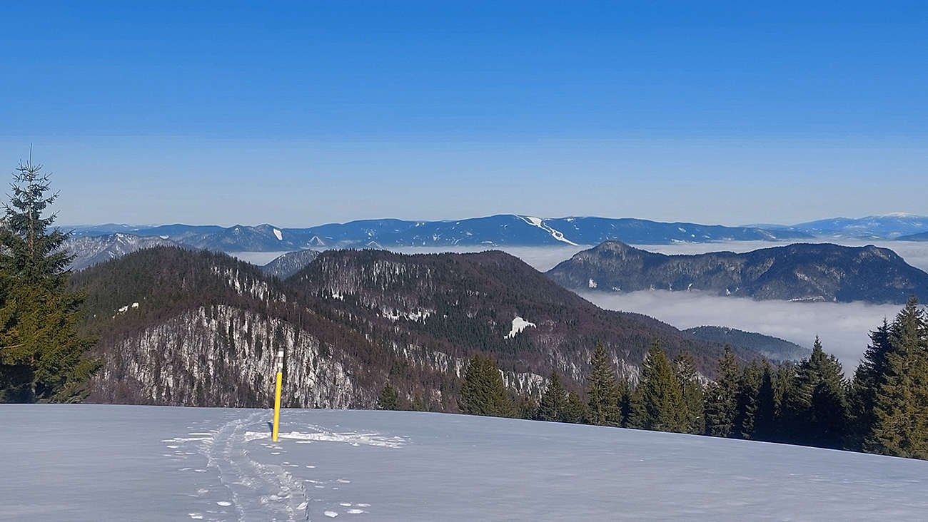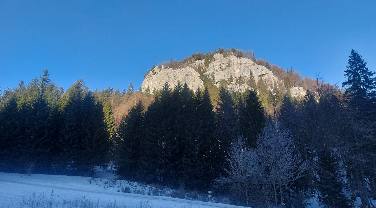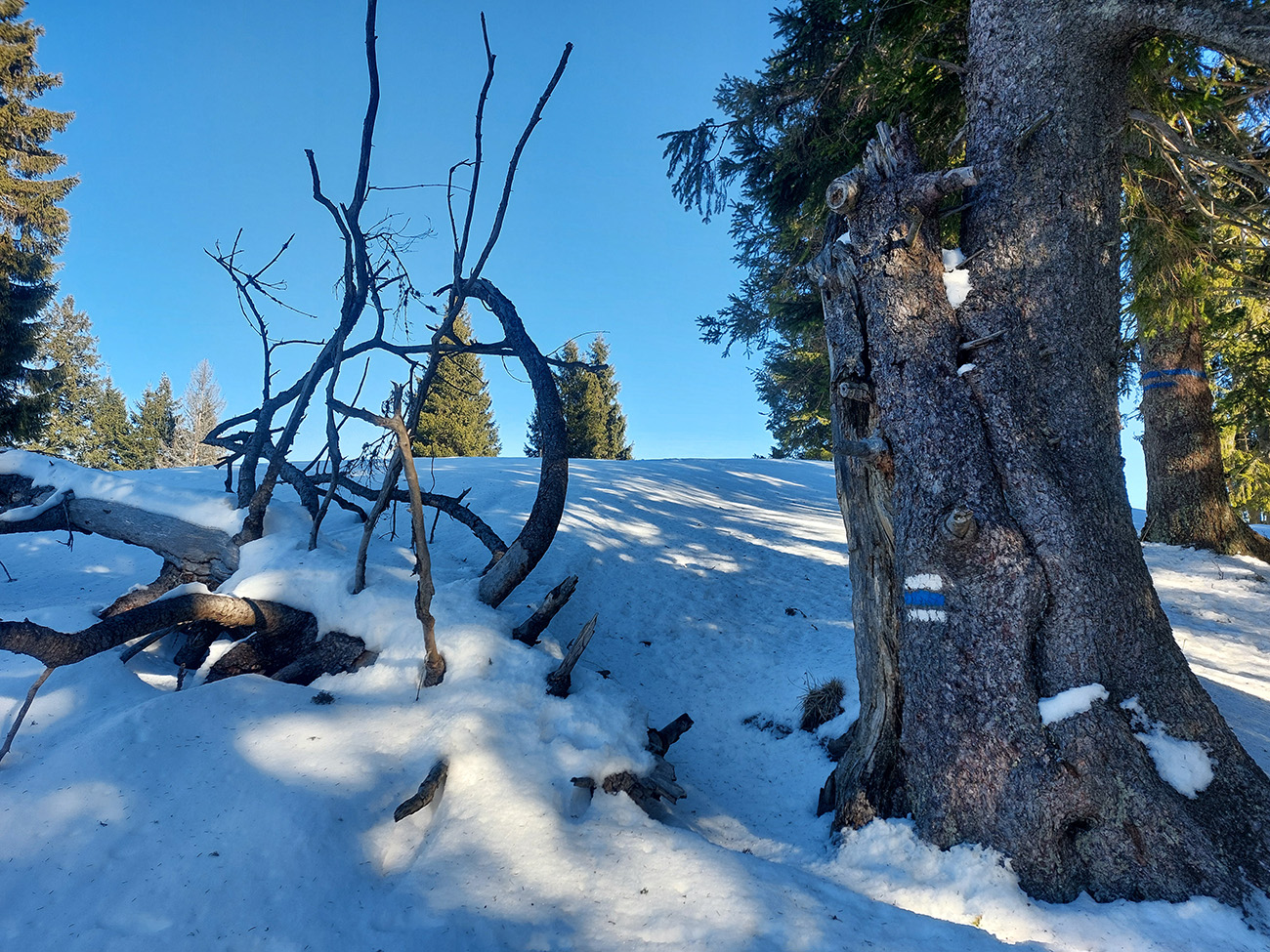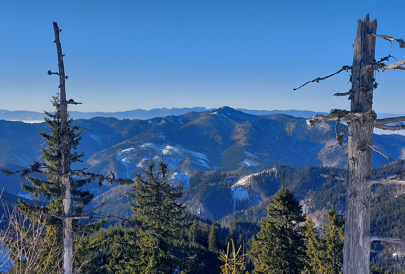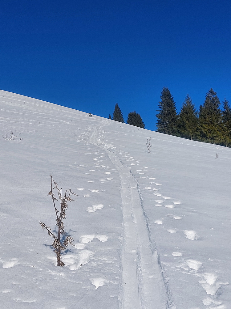 Čas pokročil, vlak nepočká, tak už len dole – ale pekne slušne, pod Vtáčnik po cyklotrase. Tá tiež vyleštená do ľadova, predtým v traverzoch pod Šiprúňom dobré snehy aj stopy, hrebeňovka minimálne po Smrekovicu by bola komfortná. Akurát na tých vždy vyfúkaných lúkach pod Šiprúňom skoro nebolo kade preraziť. Nooo tak sa po tráve išlo, a čo?