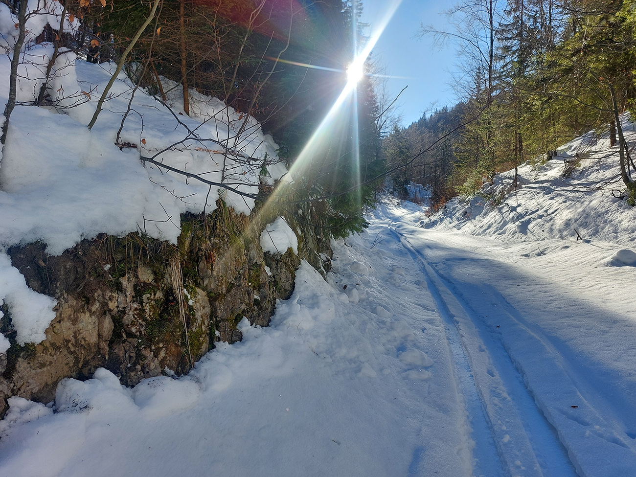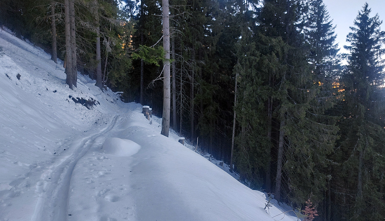Na križovatke v doline som ušiel doľava, bol som zvedavý, koľko sa snehu odtopilo v traverze lesom na tom strmom južnom svahu. No, je to tam LTT, ale tiež udupané, tak aj to málo zatiaľ stačí, aj na opatrný zjazd:
