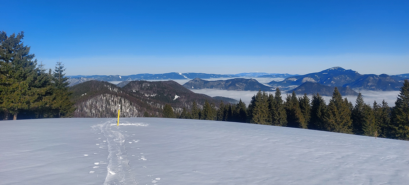 Potom už som si mohol vybrať, kade – po rozľahlých lúkach cez horizont do záveru doliny Bystrého potoka, popri smerovníku Pod Tvarožným grúňom. Na začiatku luxusná stopa, potom nosná kôra. A tie výýýýýhľady!