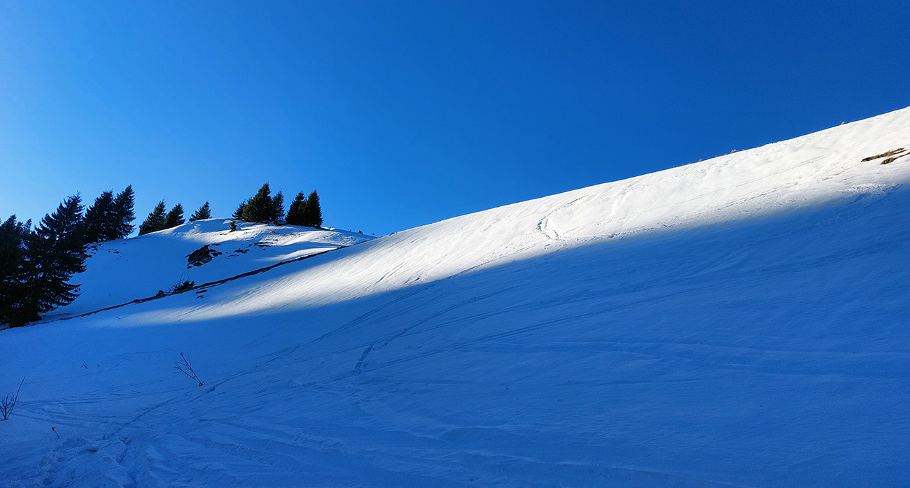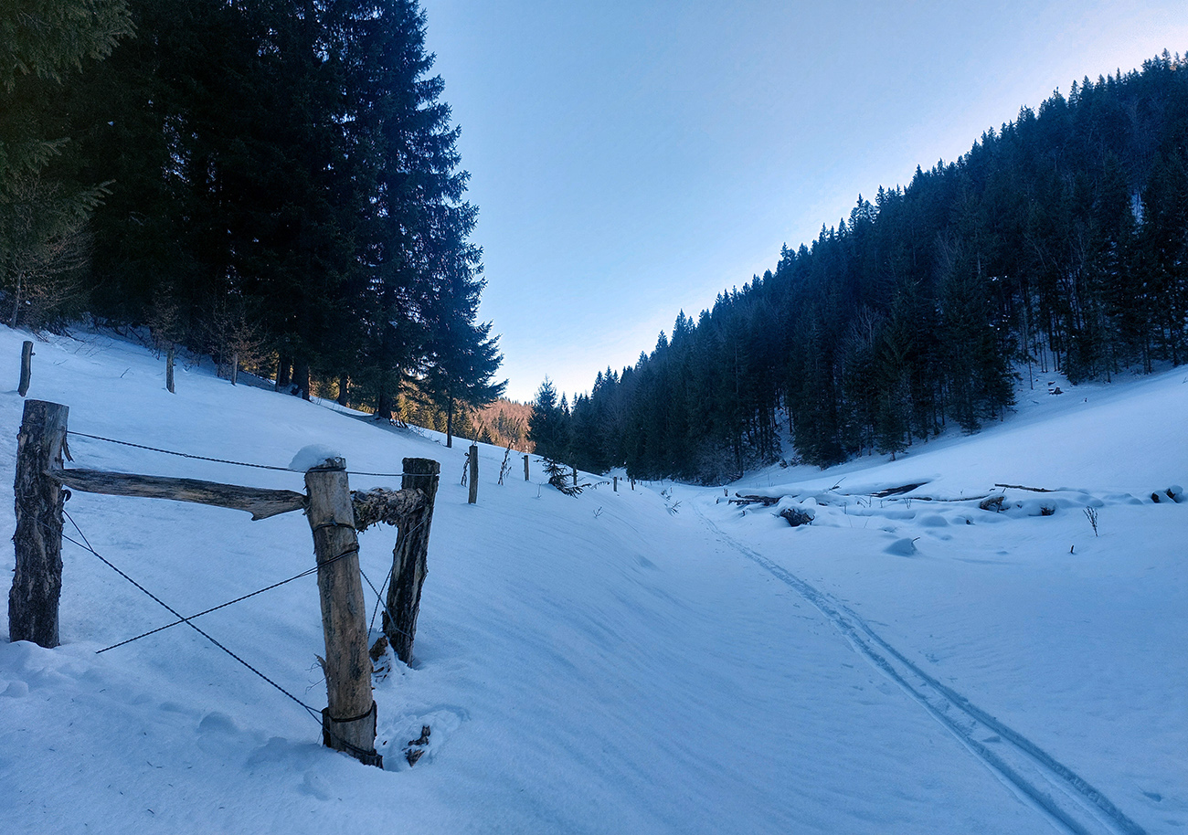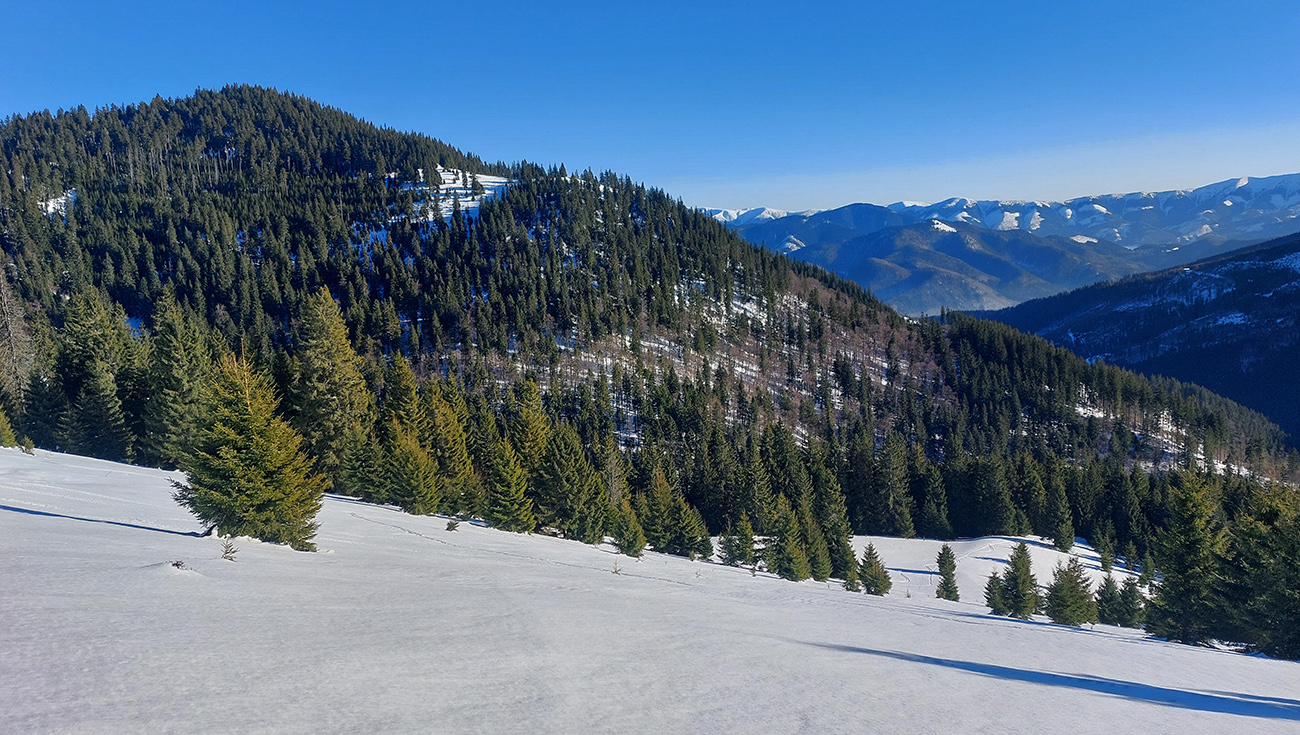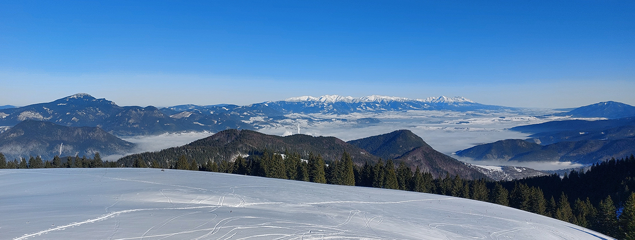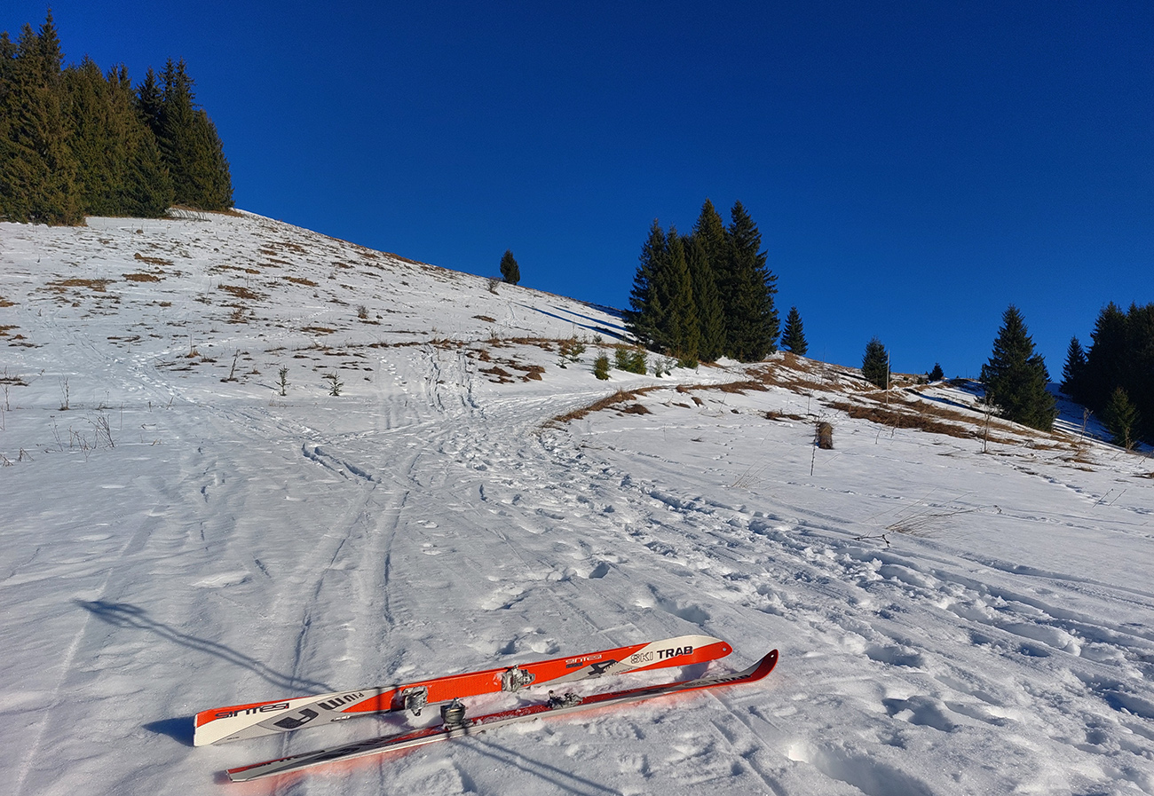 Pretože snehová nádielka z prelomu rokov po oteplení poriadne zamrzla a lyžovanie vo voľnom teréne nie je žiadna slasť, vymýšľal som niečo, kde by som sa mohol šúchať celý čas, najlepšie bez častého odliepania pásov. A tak som vymyslel toto – v „jadre výletu“ sklonom skôr bežkársky terén, lenže pod lyžami buď ľad, alebo sa to naopak prebáralo, takže skialpy tento raz vhodnejšie. Jednoduché to bolo: z Hrabova po Medvedej ceste na Vlkolínske lúky, Suchým Hrabovom pod Vtáčnik, traverzom cez záver Čutkovskej doliny a popod Nižné Šiprúnske sedlo na lúky pod Tvarožným grúňom, dole po žltej dolinou Bystrého potoka a s nejakými zachádzočkami a obmenami nazad: