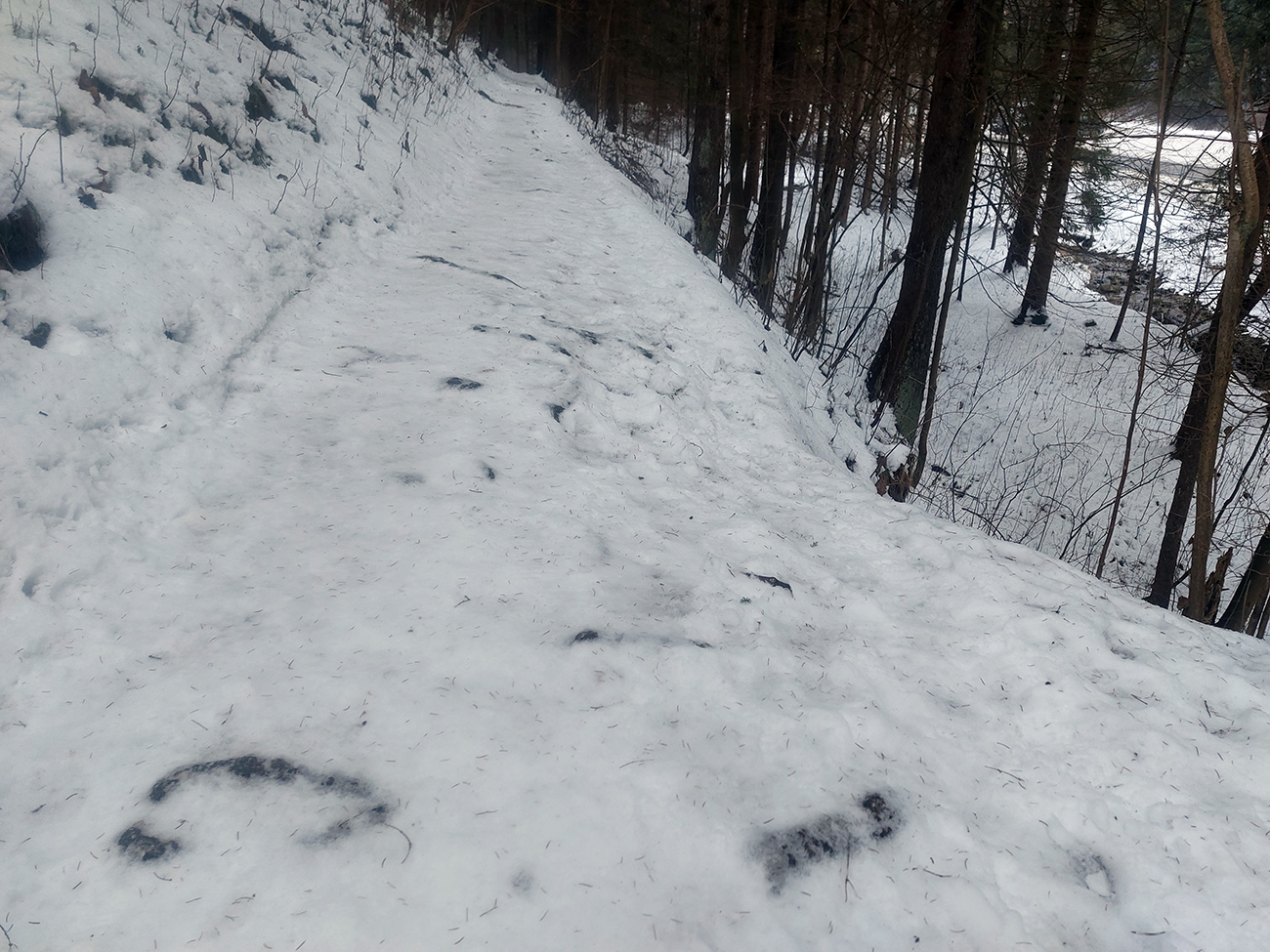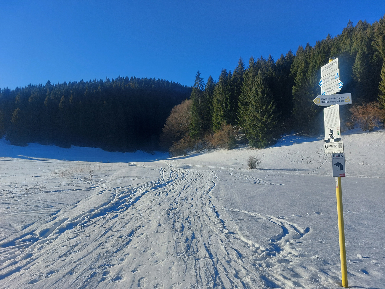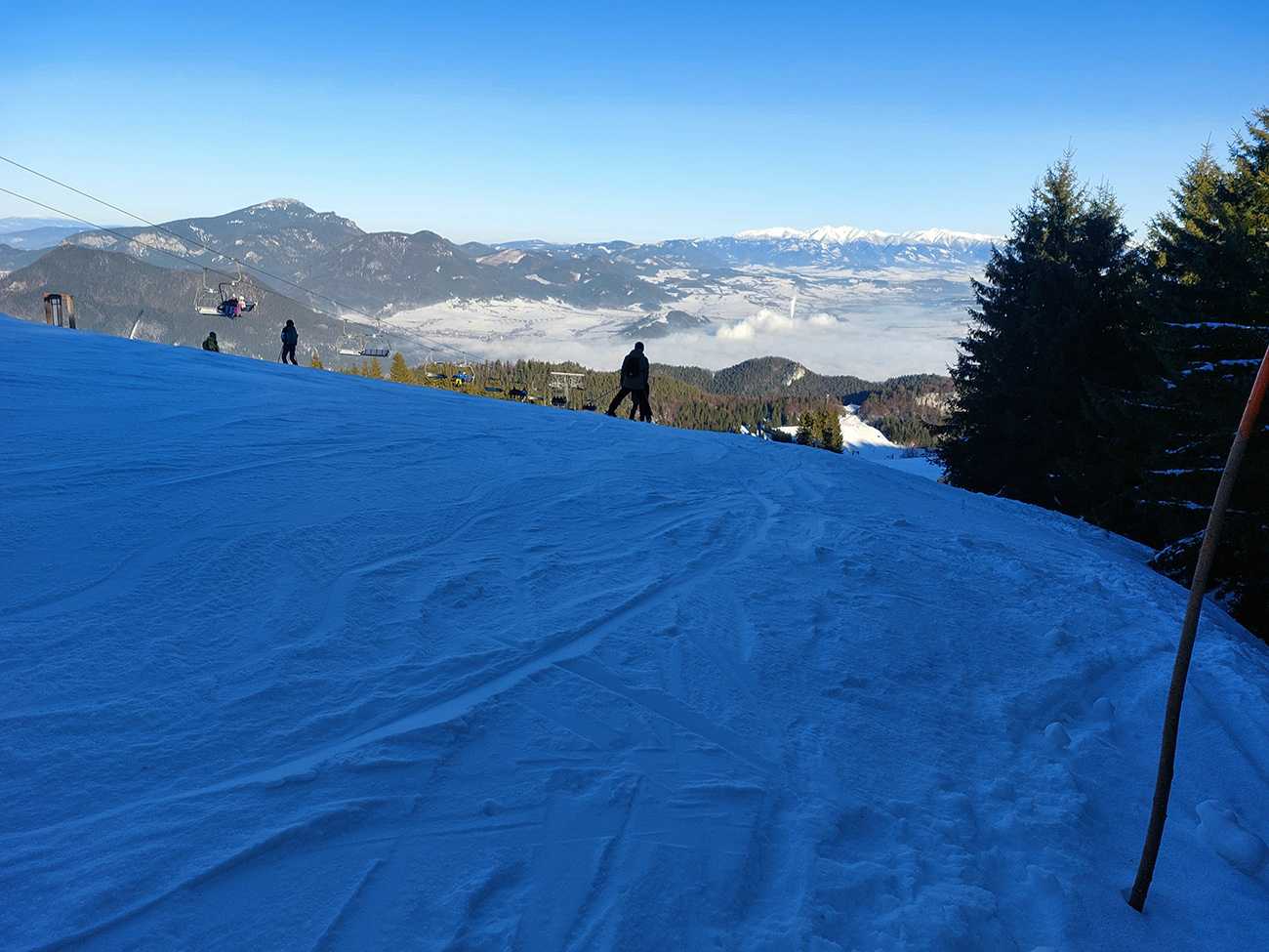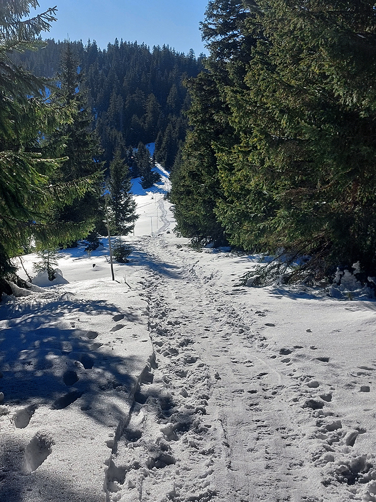 Čiže: sneh državý, zmrznutý, takže na Medvediu cestu som sa vydriapal priamo po cyklotraili popod lanovku. Medvedia cesta vytvrdená skoro na korčule, do ligotava. Smerom dole by to poriadne svišťalo, ale brzdiť nie je problém, pirane vidno.