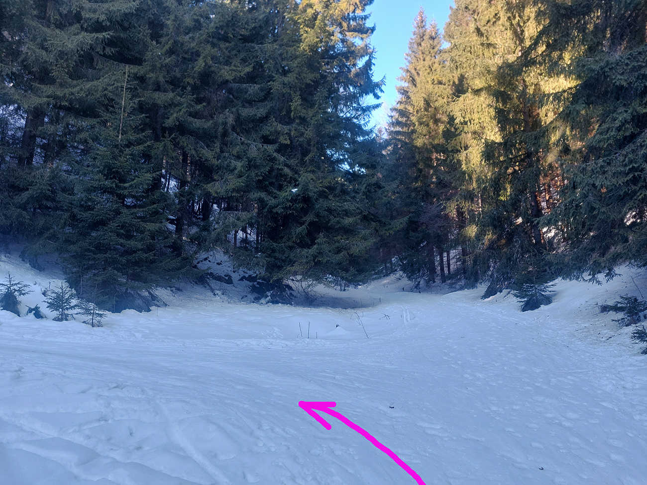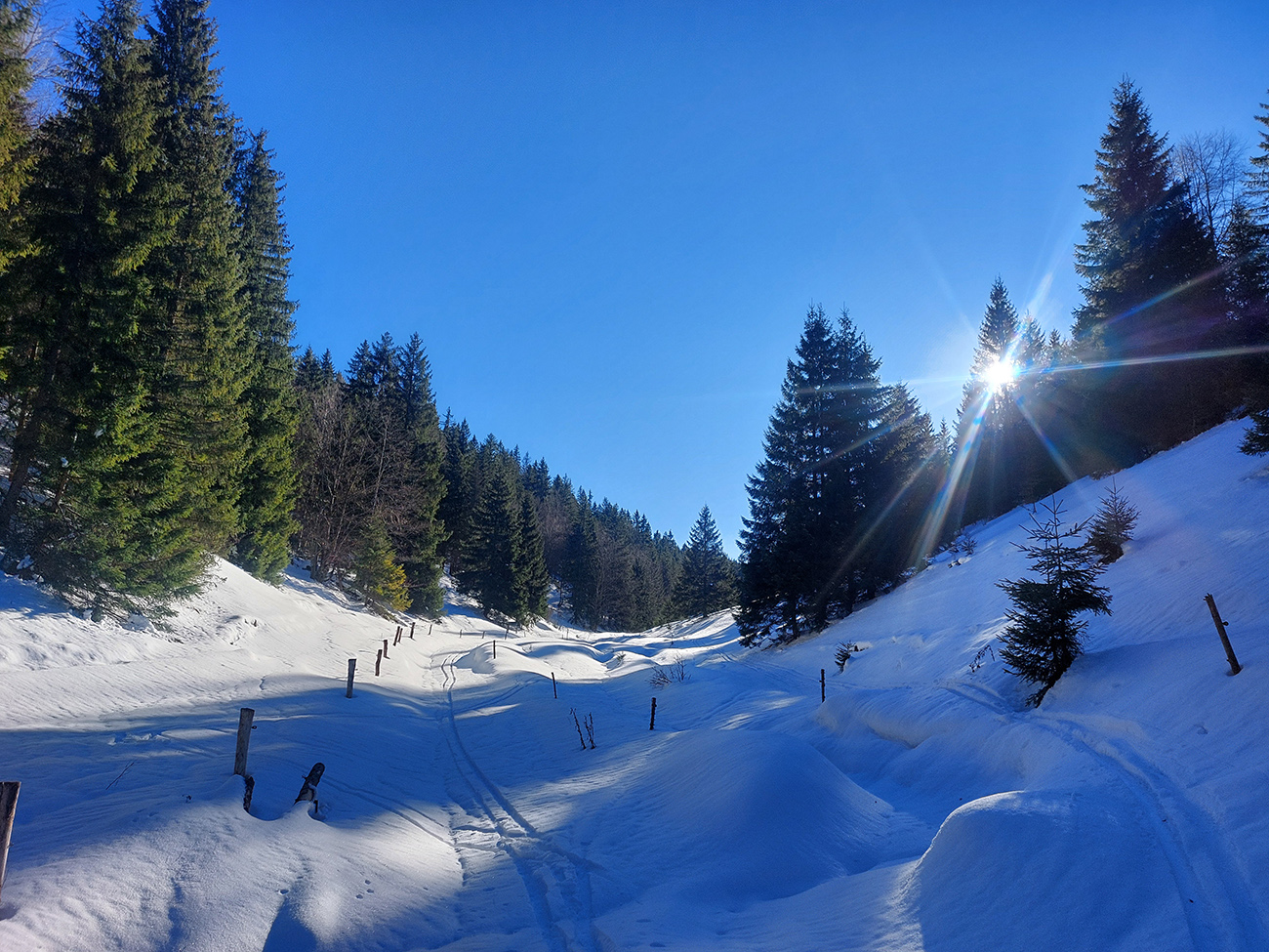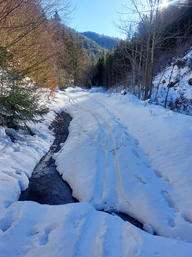 Vyfúkané lúky pod Šiprúňom som teda podišiel zvážnicou cez záver Čutkovskej doliny – tam je snehuuuu doooosť, aj ten potôčik v jame na konci vysnežený parádne. Len na zjazd by to nebolo nič pohodlné – kôrka hnusná a samozrejme je tam dosť úzko.