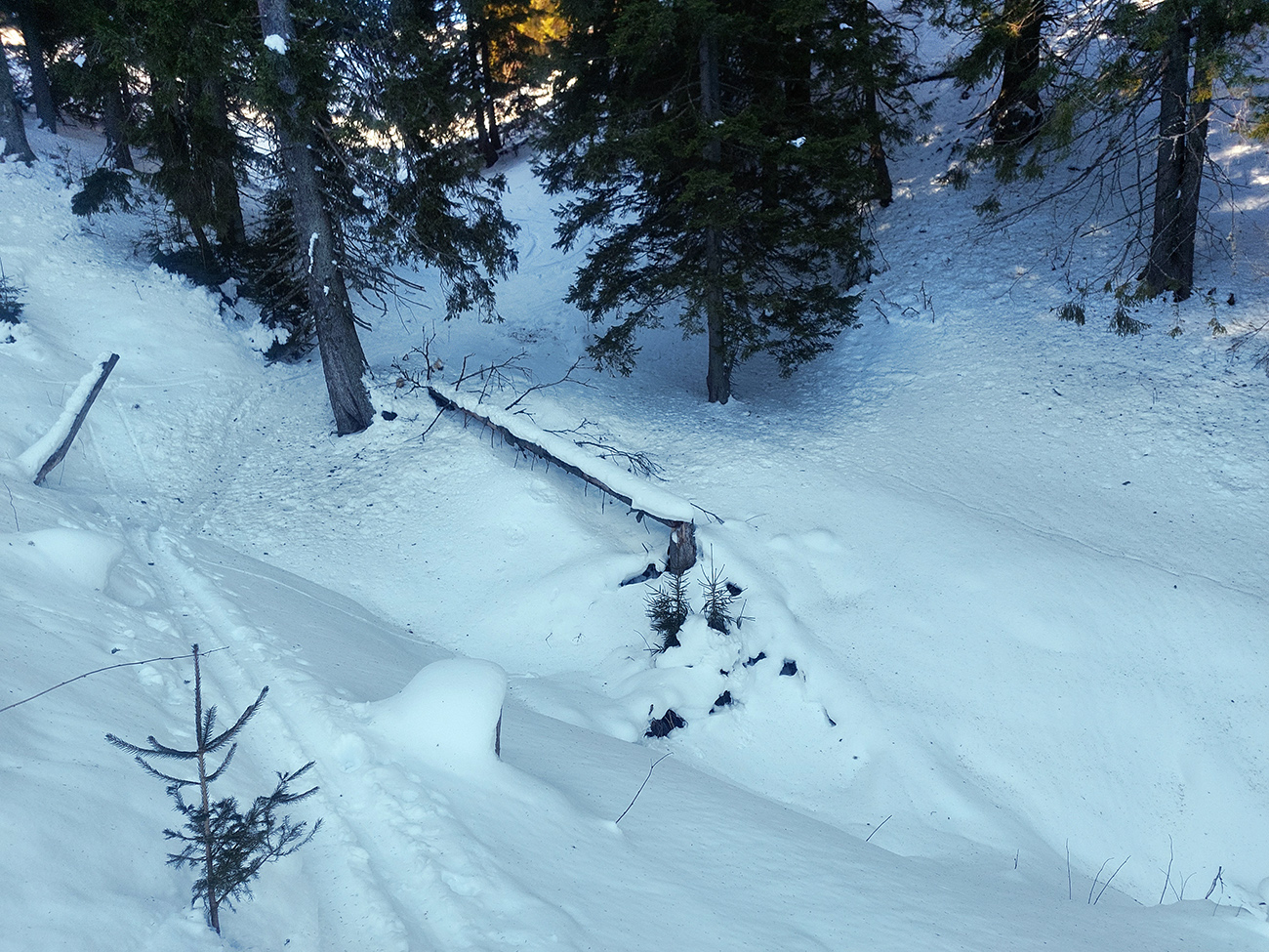 A ešte trochu času ostalo, tak som bol zvedavý na priechodnosť singlíka spod Vtáčnika k vrcholovej stanici sedačky. Aj tam len-tak-tak, na výšľap po tom poloľade to stačilo, smerom dole by bolo treba preniesť: