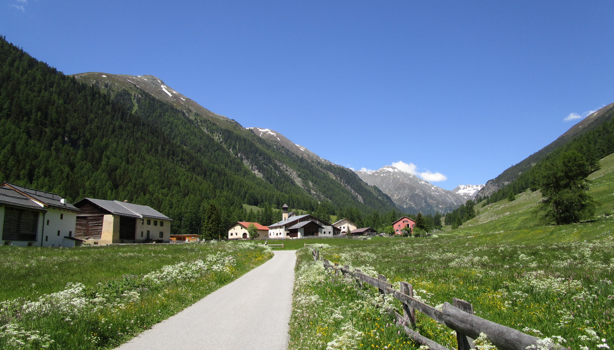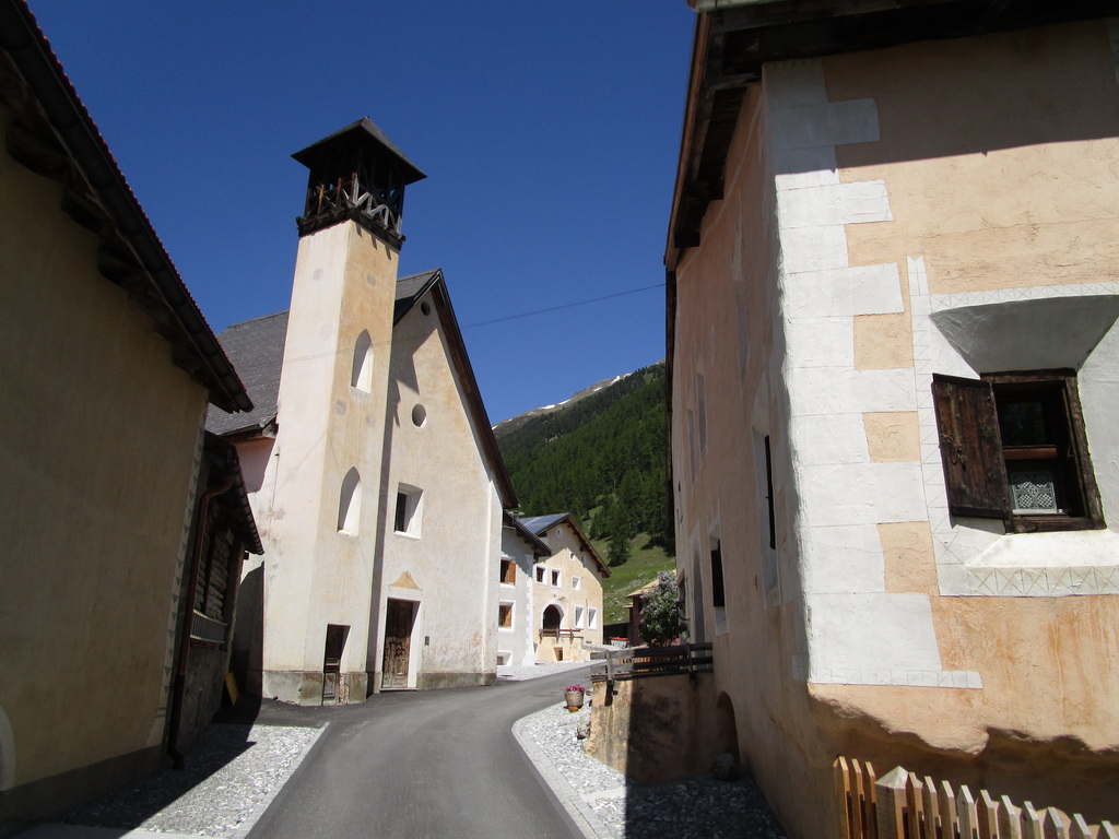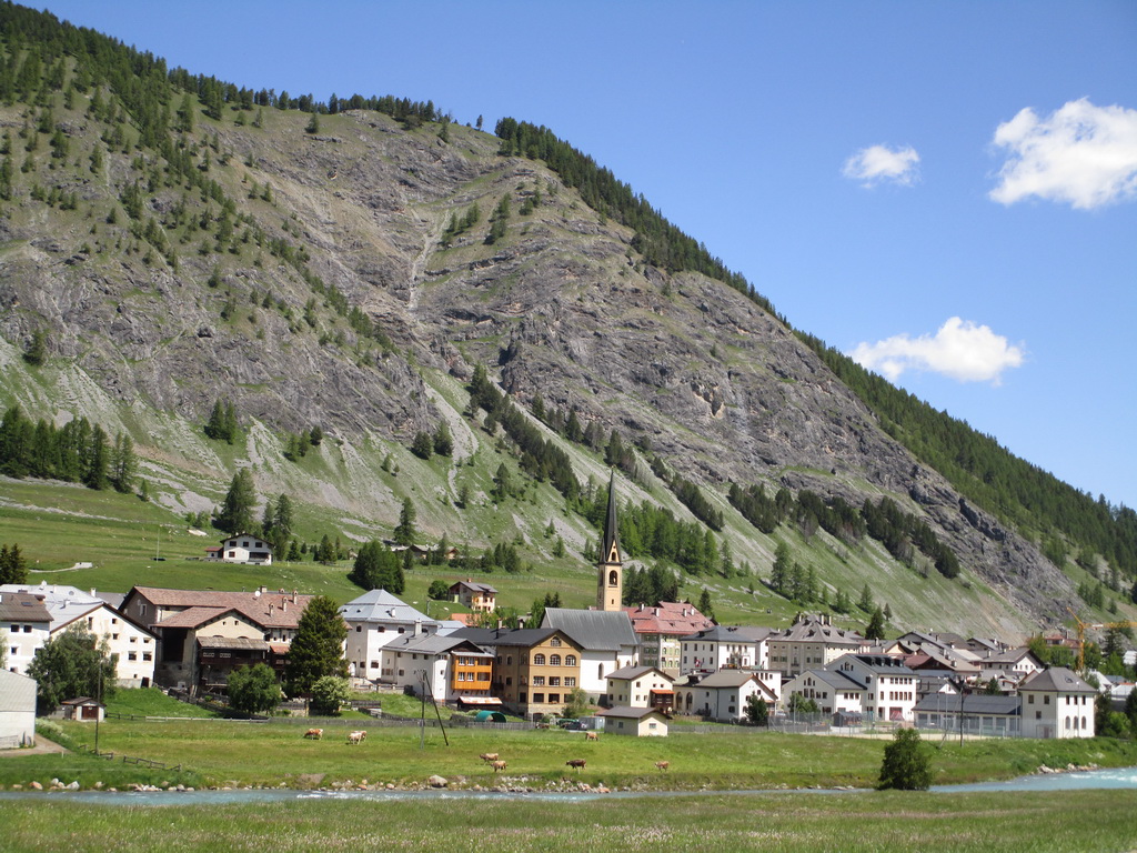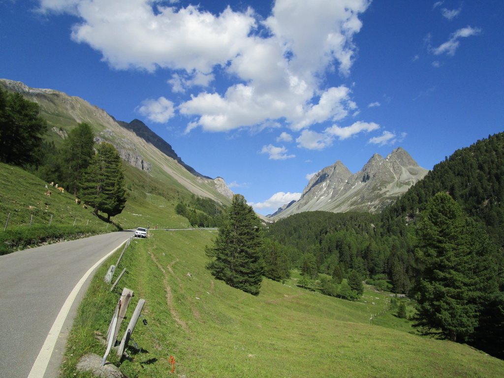 Na tento bajkový okruh vyrážam z Val Rosegu. Však mám pod sebou dve kolesá tak načo používať ešte aj tie štyri na aute. Zjazdujem dole po kvalitnej šotoline (ťažko to definovať, také u nás nie sú) a na asfalt sa pripájam až v Samedane. Čaká ma dlhý deň a tak úsek až po ústie doliny Susauna absolvujem po hlavnej ceste. V osade Chapella sa z nej odpojím a začínam dlhé stúpanie Val Susauna. Najprv asfalt potom šotolina. V závere doliny je výživné stúpanie, pochvaľujem si ale vytuningovaný prevod 32 x 50 a tak to ide parádne.