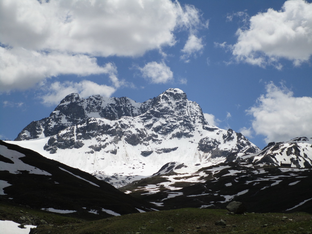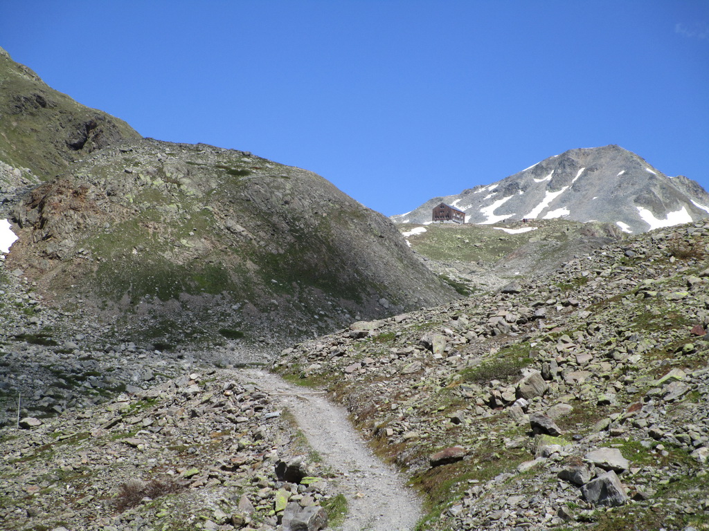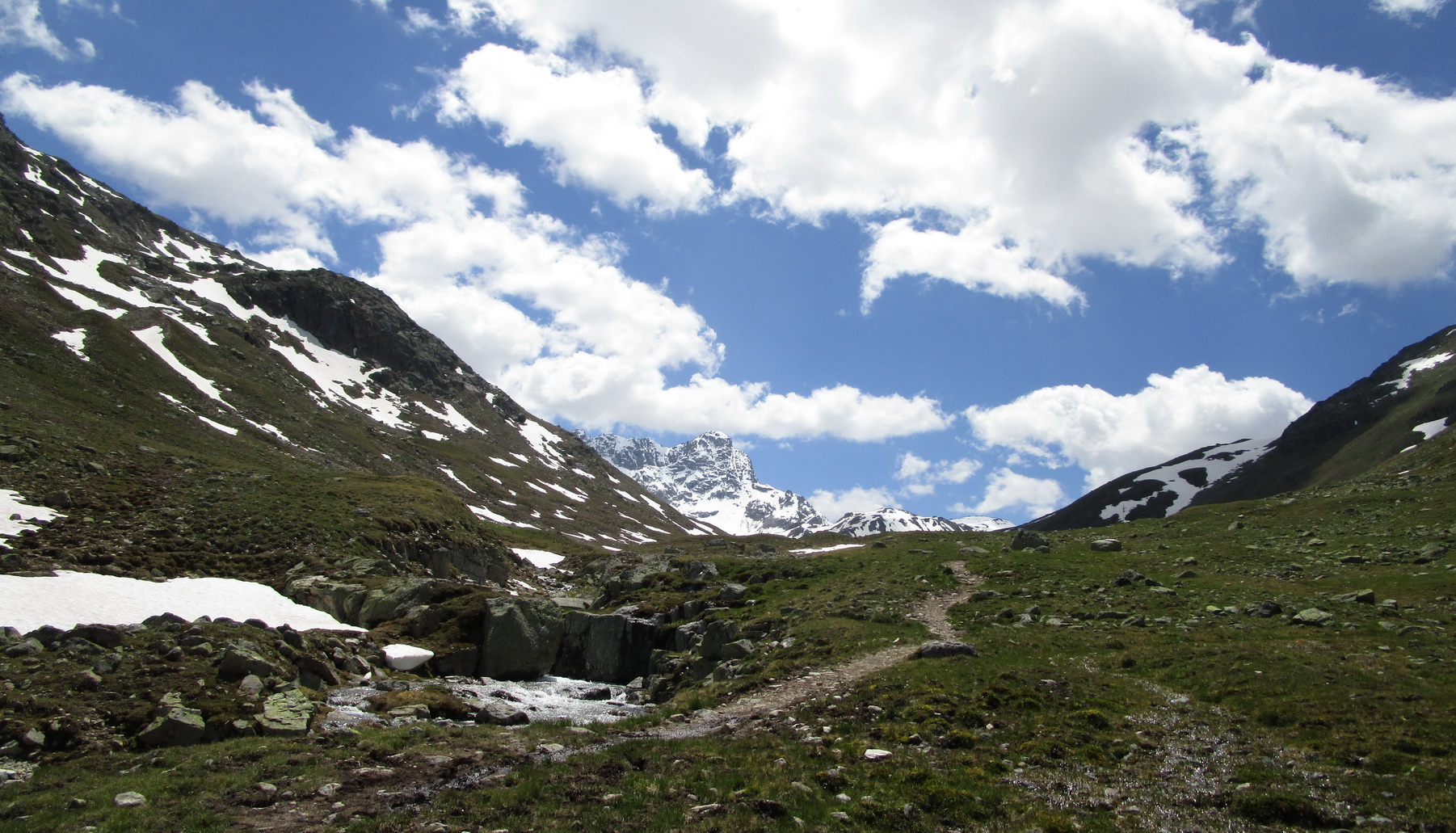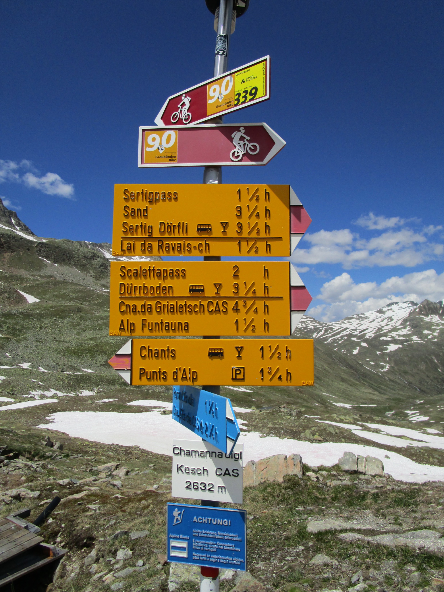 Poznám to tu už z predošlých túr. Vlastne celý okruh som už kedysi išiel ale - opačným smerom. Dnes ma teda konečne prvý krát čaká ten smer správny - okorenený zjazdom z Keschutte do Bergunu. Najprv ale musím vyšlapať hore. Skoro všetko ide v sedle až na záver sa chodníček postaví a aj vďaka snehovým poliam musím trošku potlačiť. Nevadí, pri alpských túrach úplne normálna vec.