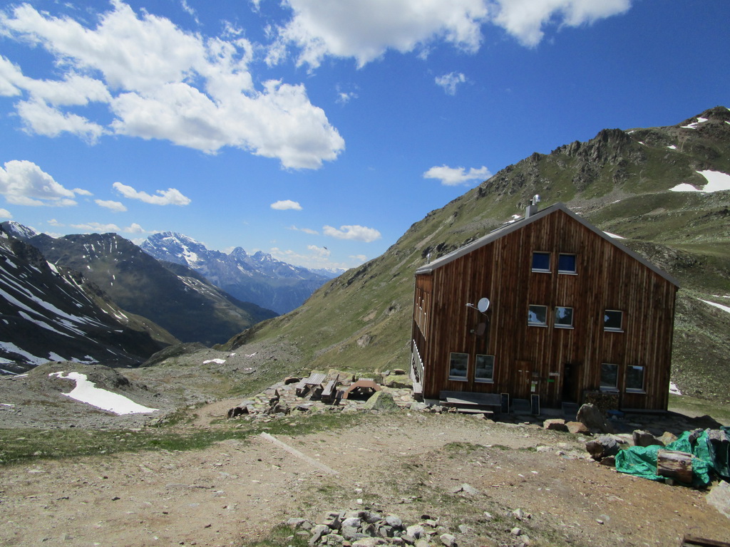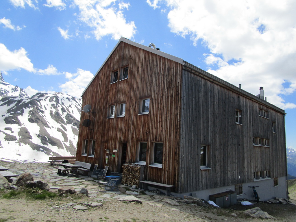 Na chate štyria hostia, dám si nusstorte a polku kolaloky. Posilňujúc sa vychutnávam aj výhľady na dominantu okolia: Piz Kesch. Snehu je na ľadovci ešte dosť ale isto už nebude bohvieakej kvality.