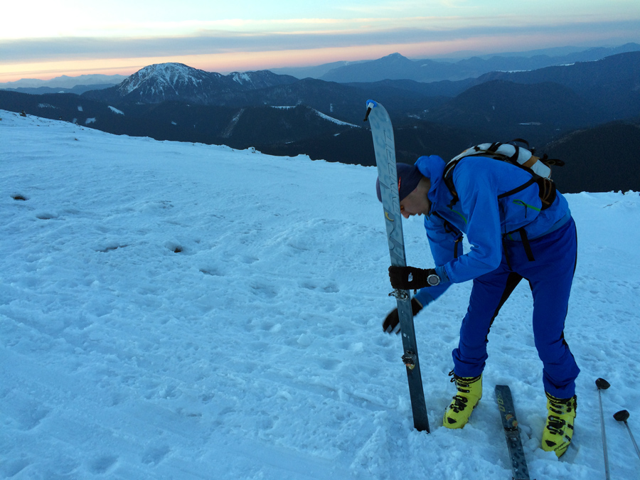 Po dvoch rokoch sme skúsili repete, snehu celkom napadlo, bolo dlho pekne, tak sme plánovali dáko začiatkom marca vyraziť. Cez víkend sme ešte výdatne pochodili a v nedeľu mi Matúš zavolal na Štefáničku, že v utorok by sme mali ísť, lebo sa pokazí. Skúsil som protestovať, ale Aladin ma presvedčil, tak sa išlo. Hlásili teplotu akurát, úplne jasno a bezvetrie. Technické problémy nás zas neobišli a moje viazko sa nedalo zavrieť, lebo to U-čko vypadávalo. Za 5 minút 6 sme hľadali skrutku s rovnakým priemerom, ale širšou hlavičkou, aby zakryla aj U-čko, ale také vraj nebývajú. Tak som kúpil dve také isté ako som mal, že to možno bude stačiť. Matúš tomu neveril, tak mi tam odborne namontoval tri pásky na káble (odborne vraj SK-pásky... SK asi od skialp?) a Matúšov ocino mi na cestu pribalil dáke šróby a podložky. Držalo to riadne.