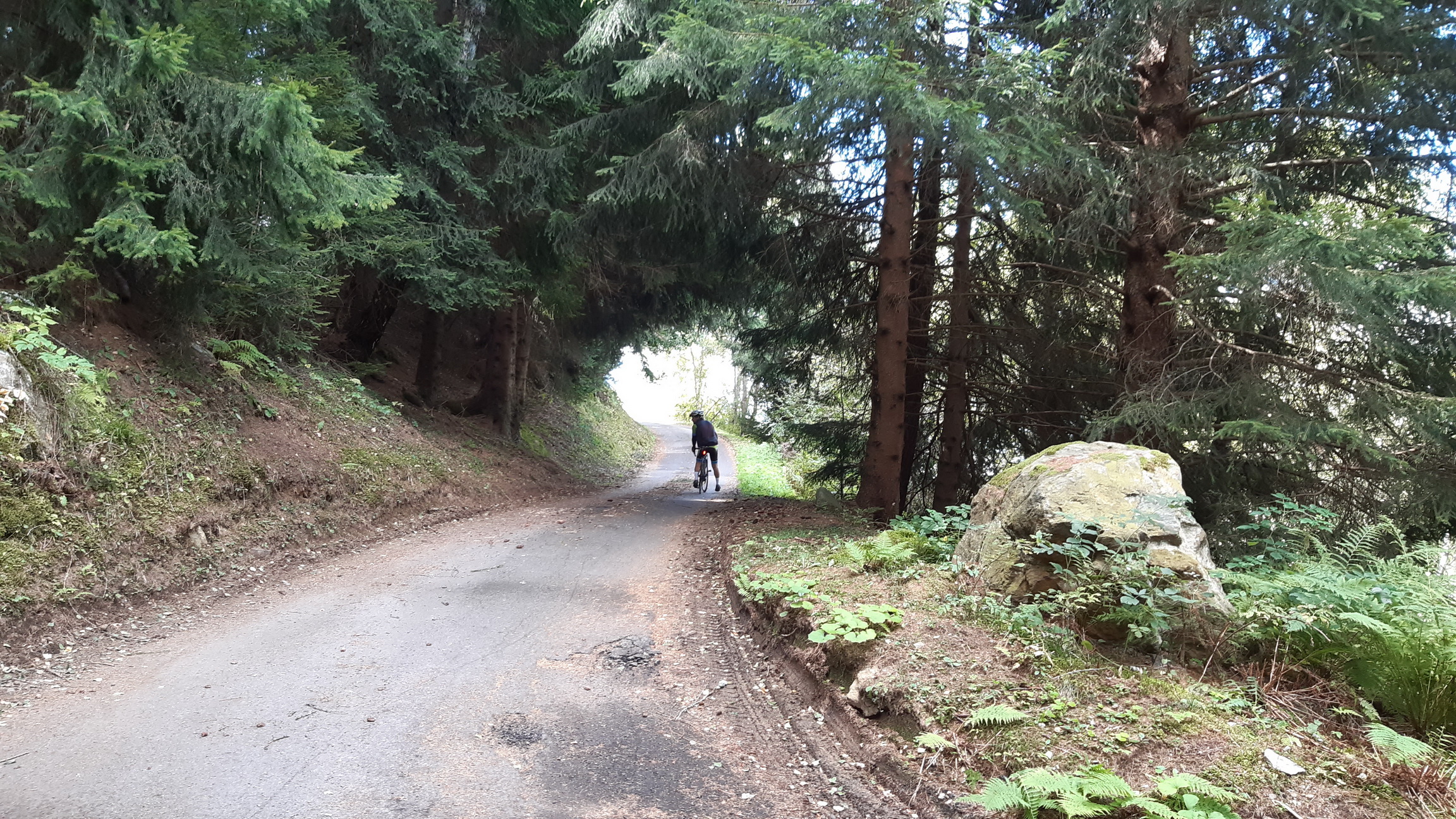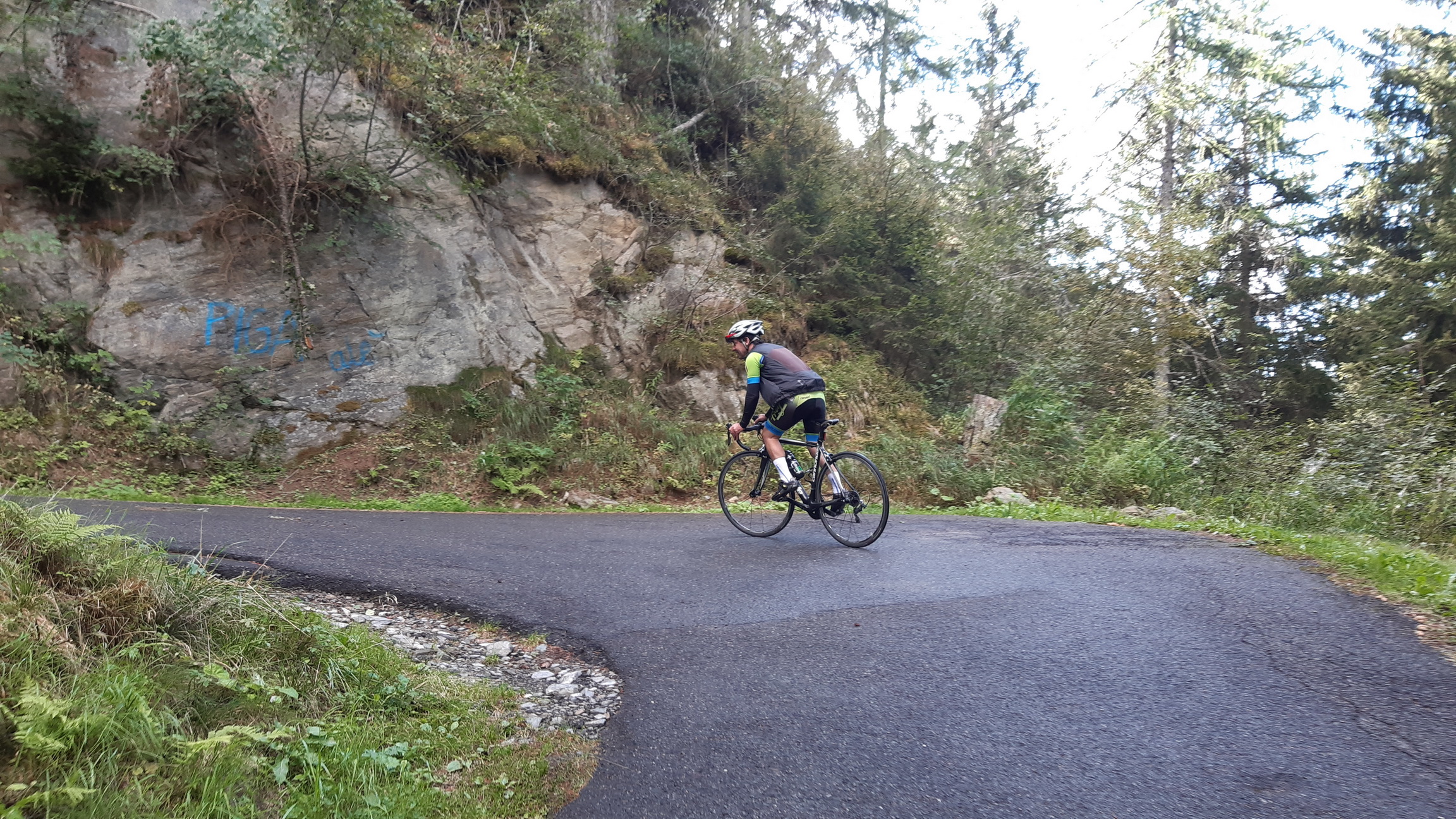 Stúpanie ako dva Sliezske domy za sebou, úzka cestička, neustále serpentíny bez prerušovania rovinkou, kvalitný, miestami nový asfalt, každá serpentína označená infotabuľkou a niečo, čo snáď ani nemôže byť pravda: zákaz vjazdu autám! Toto je passo Guspessa - nenápadné, v hustom lesíku ukryté stúpanie hneď vedľa Mortirola.