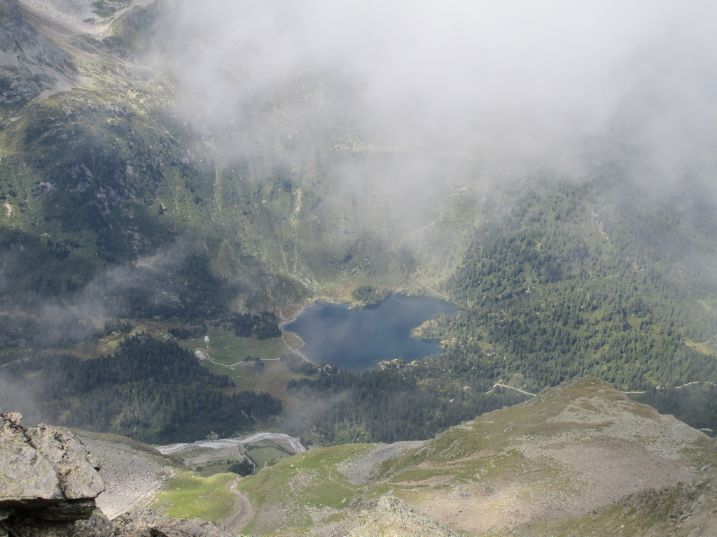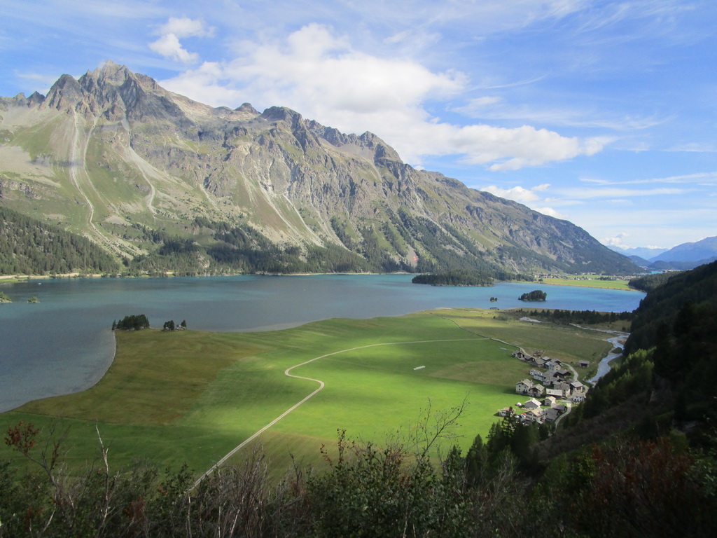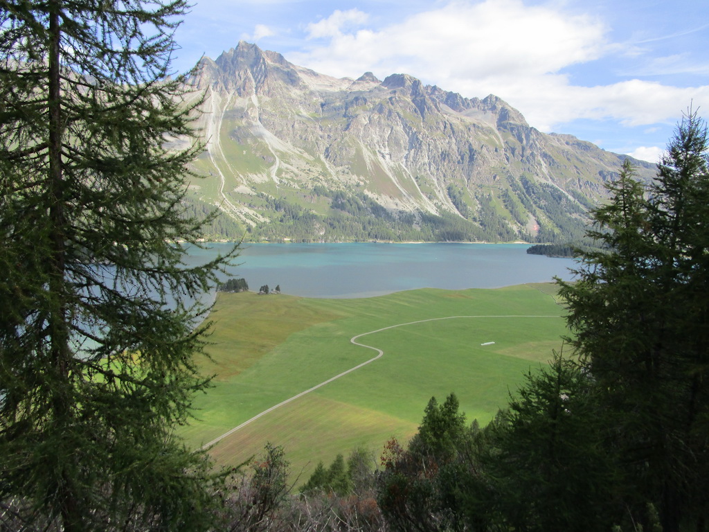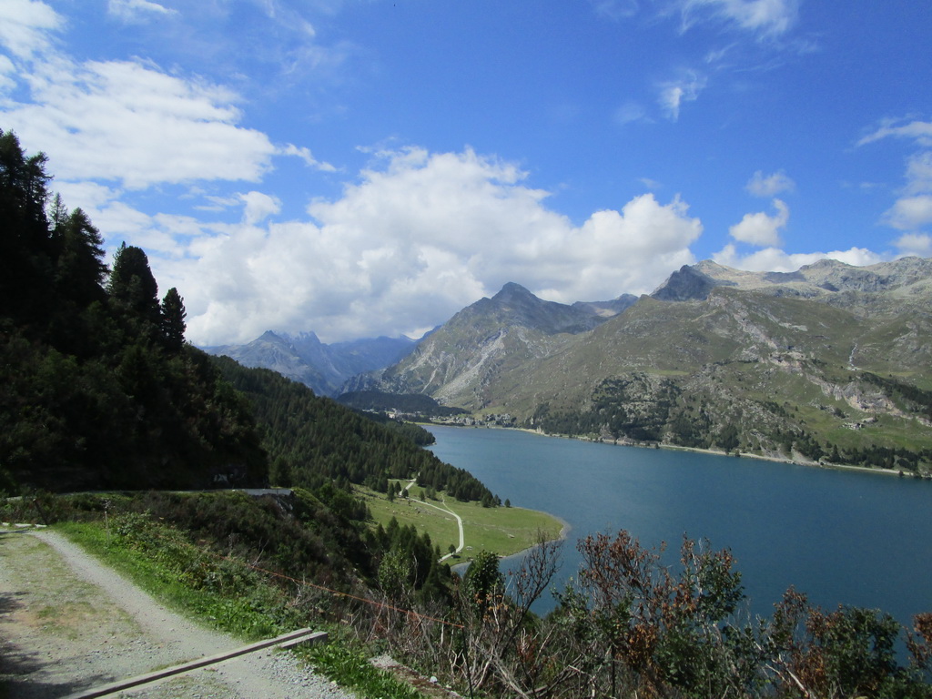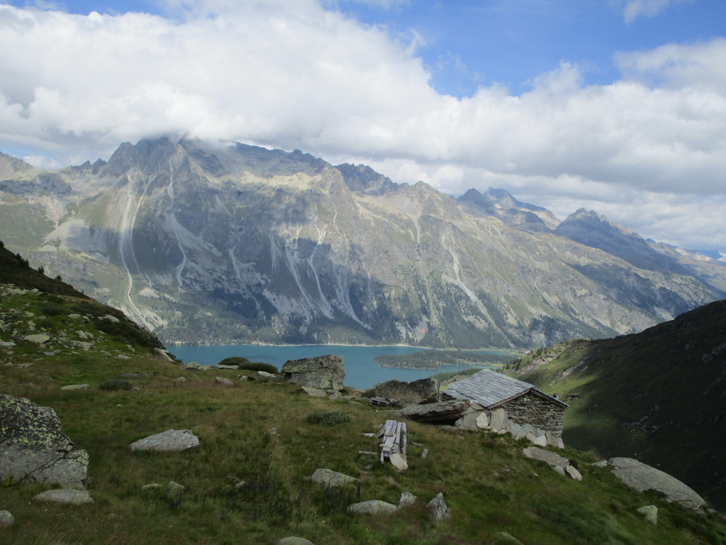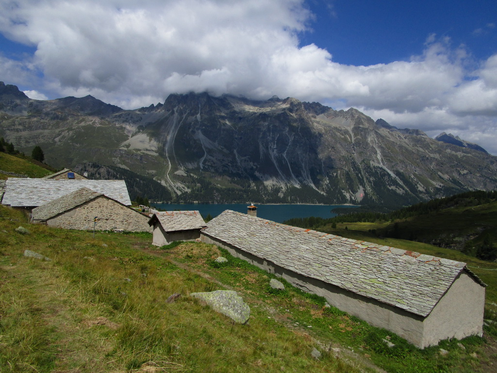 Parkovisko pred Malojou je bezplatné, nachádzam ešte voľné miesto a vyrážam okolo jazera. Po červenej značke prejdem okolo campingu a príjemným lesíkom stúpam traverzom hore. Nad lesom vchádzam do ústia doliny Val Fedox. Tu značka prechádza okolo salašu a za ním pokračuje ďalej už výrazne spustnutá. Vlastne nie je spustnutá iba farbu tu nahradili kamenní mužíci.