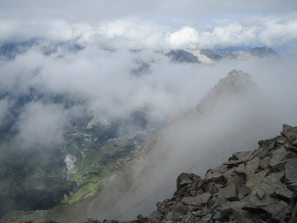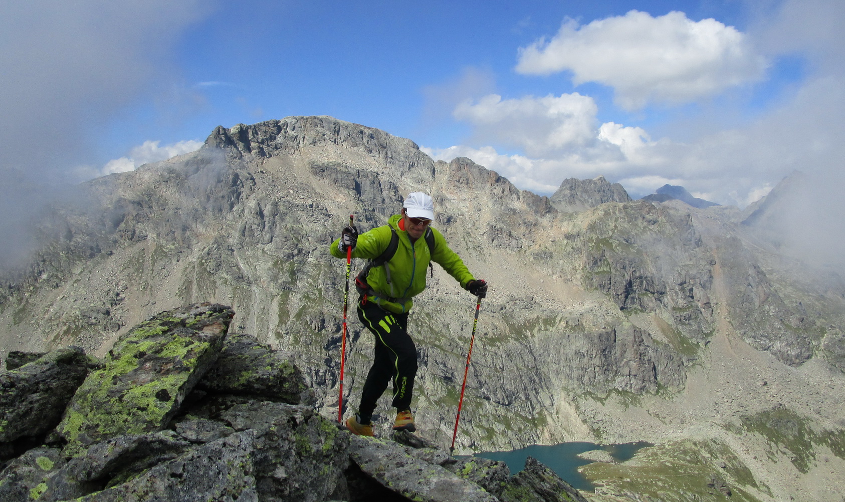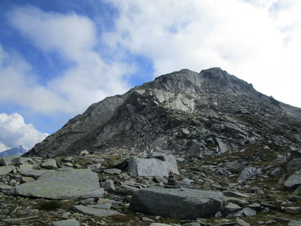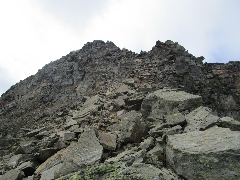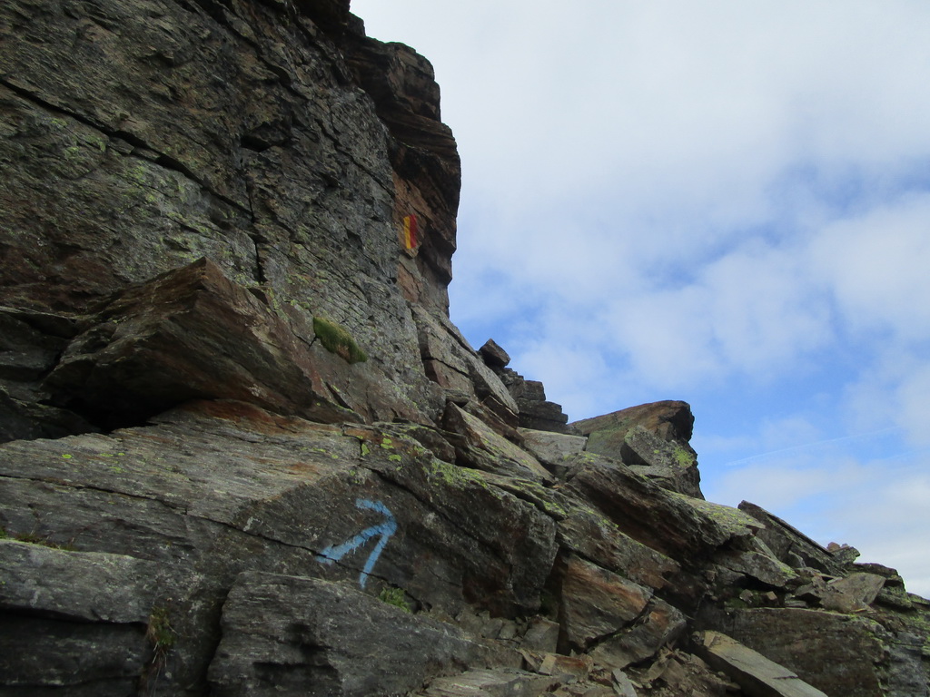 Po dlhom traverze vchádzam do suťového kotla za Margnou. Ním hore a traverz doprava na hrebeň. Nádherné výhľady čiže fotopauza. Najdôležitejšie miesto výstupu je označené šípkou. Prehupnem sa na druhú stranu hrebeňa a ľahko sa s občasným použitím rúk dostávam po hrebeni až na vrchol.