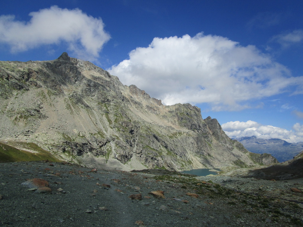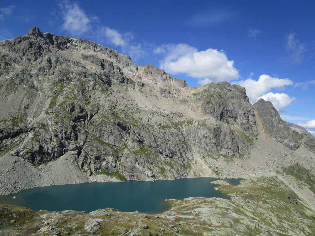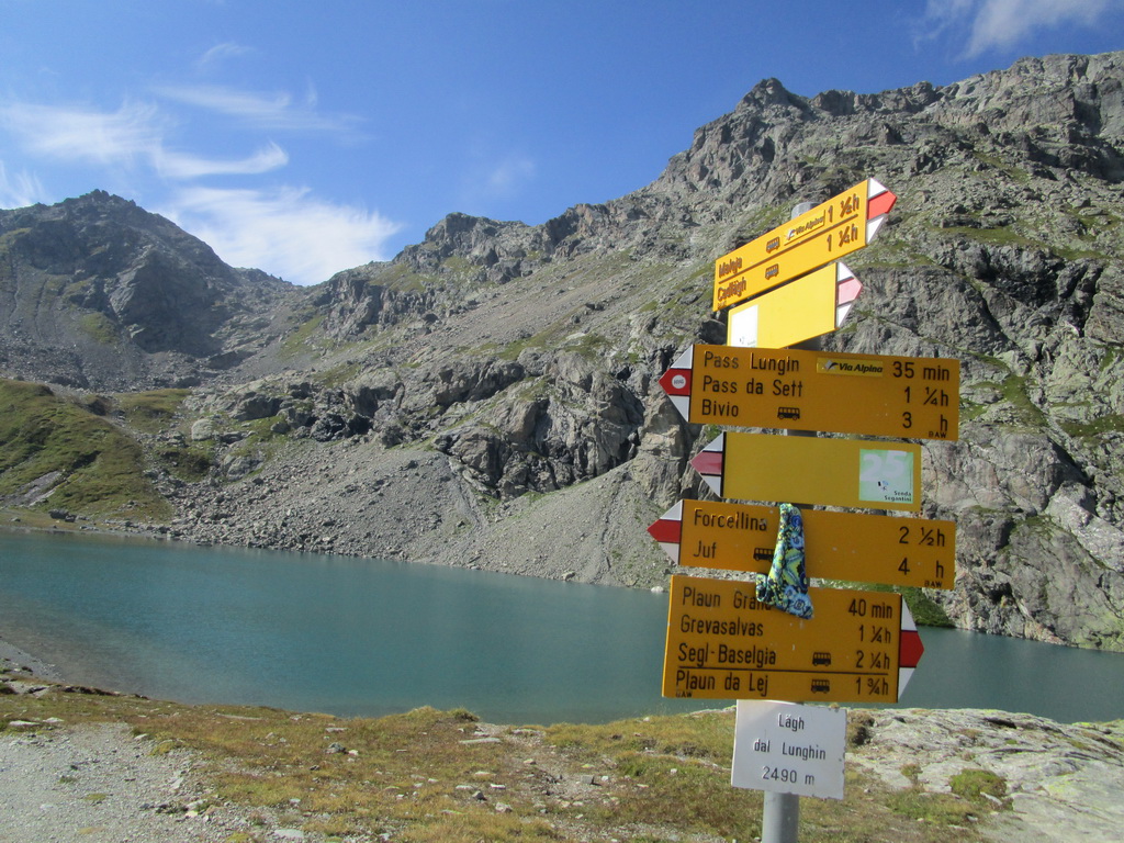 Po návrate na parkovisko si doplním z auta nejaké zásoby a po krátkej pauze vyrážam na opačnú stranu. Pekne po červenej značke rovno hore. Prechádzam okolo krásneho jazera s rovnakým názvom. Kochám sa výhľadmi na Piz Grevasalvas a namierim si to do pass Lunghin. Modrá značka začína až odtiaľto.