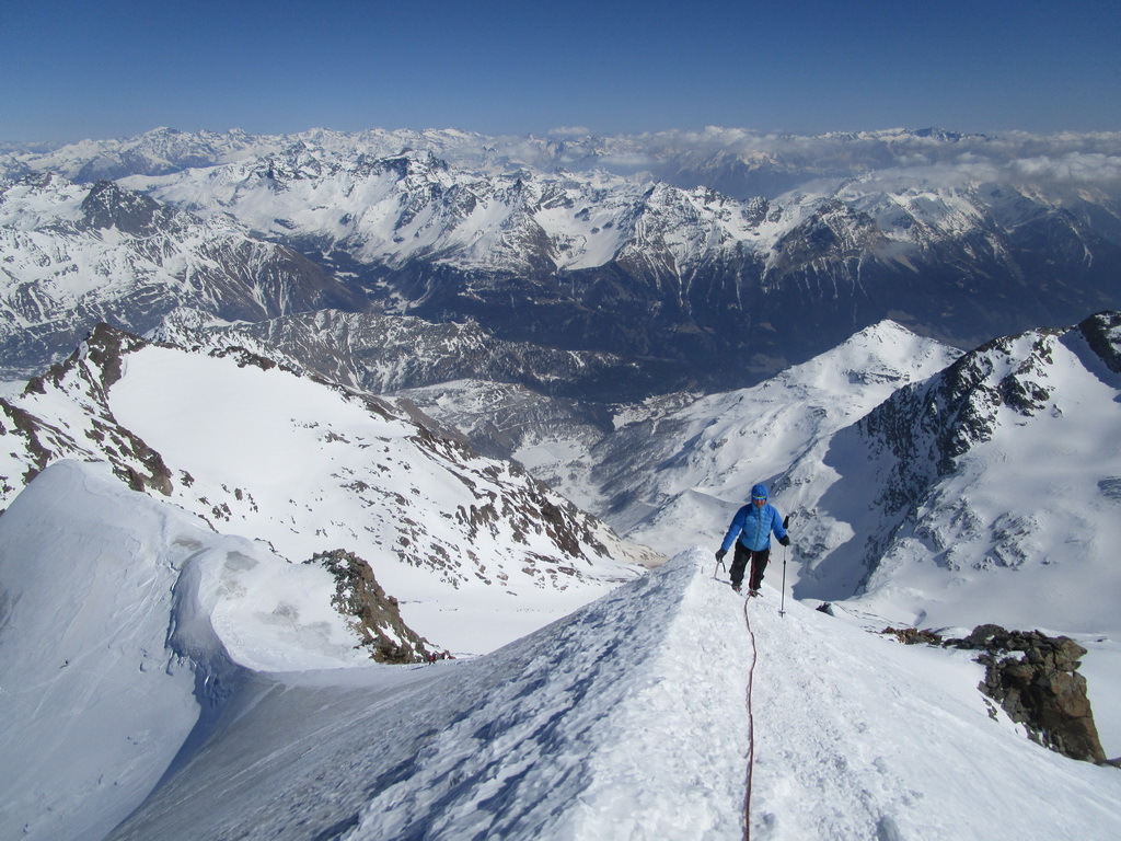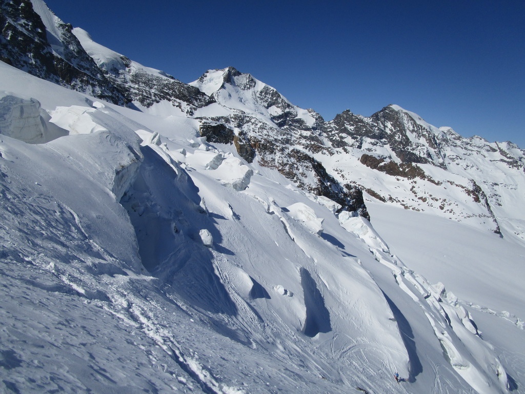 Ďalej ideme opäť na lyžiach. Klučkujeme medzi trhlinami ktoré sa rysujú pod snehom. Prichádzame do sedla pod vrcholom. Ten je celý ľadový iba na hrebeni je nalepený sneh po ktorom sú vyšlapané stopy.