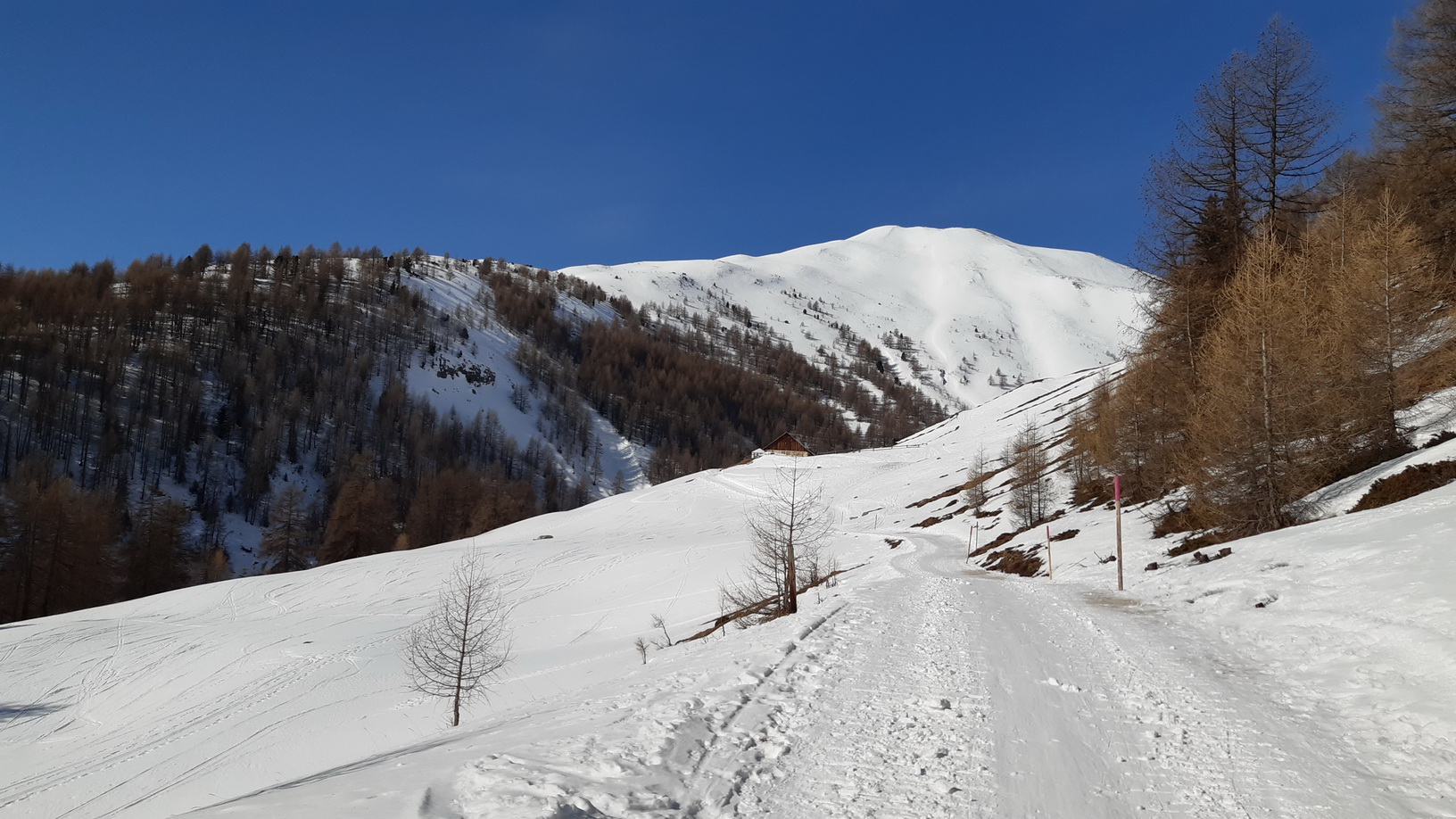 Madulain (1700 m) vlaková stanica, bezplatné parkovisko. Štartujem na lyžiach hneď za prvými domami, aj keď túto zimu je snehu pomenej. Rovnako sa mi pri návrate podarí súvislý zjazd až dole. Najskôr výstup smrekovcovým lesom. Tvrdý firn umožňuje ísť čo najviac priamo hore. Pri Alp Dadour lesík končí a traverzujem do doliny. Tou pokračujem najprv mierne okolo ďalšej usadlosti Alp Dadains až do záveru dolinky. Tu sa terén začína pristrmovať a ja rýchlo naberám výšku po tvrdej, miestami ľadovej stope (haršajzne).