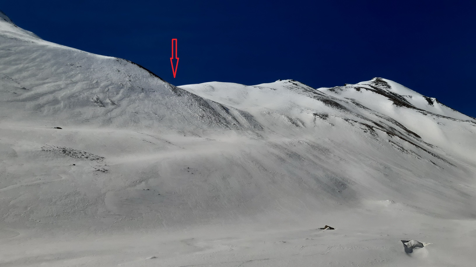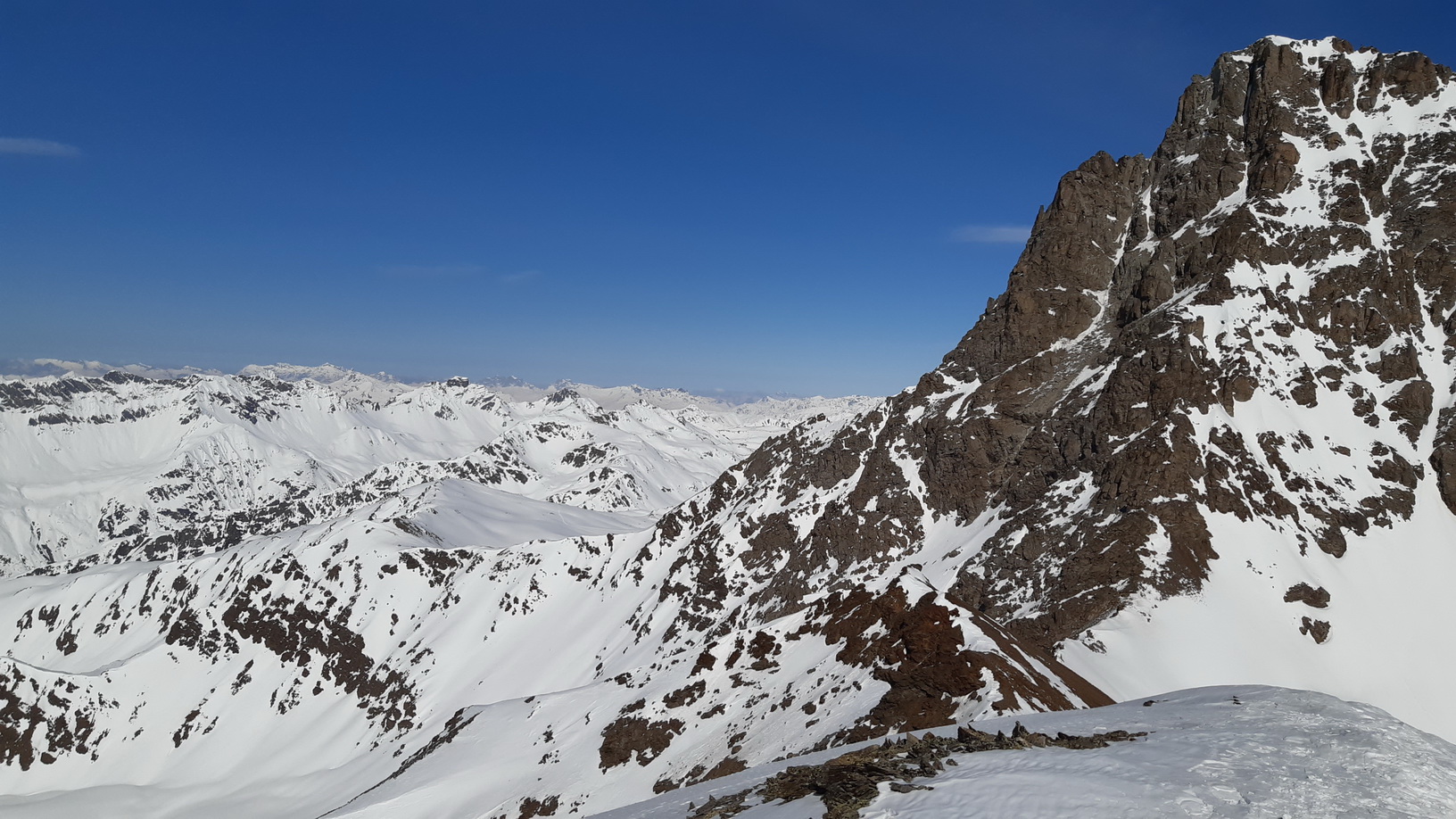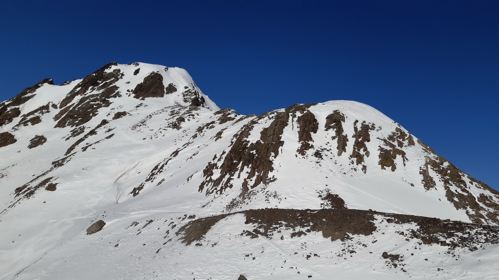 Po krátkom zjazde a následnom traverze nalepím pásy a po krátkom šliapaní sa mi otvorí pohľad na skalný hrebeň, za ktorý sa musím dostať. Tesne pod hrebeňom vidím, že skalná lavína, roztrúsená na svahu, nespadla iba tak sama od seba, ale ju uvoľnili zostupujúci skialpinisti. Skalný hrebeň je úplne rozbitý a ja sa naň rozhodnem vystúpiť žľabom viac vpravo od stôp, ktoré podľa všetkého spustili tú lavínu. Na mačkách o chvíľu vychádzam na hrebeň, opäť som na slnku. Musím trošku popoliezť po skalnom hrebeni, aby som sa dostal ku stopám a k miestu, odkiaľ sa bude dať lyžovať na druhú stranu.