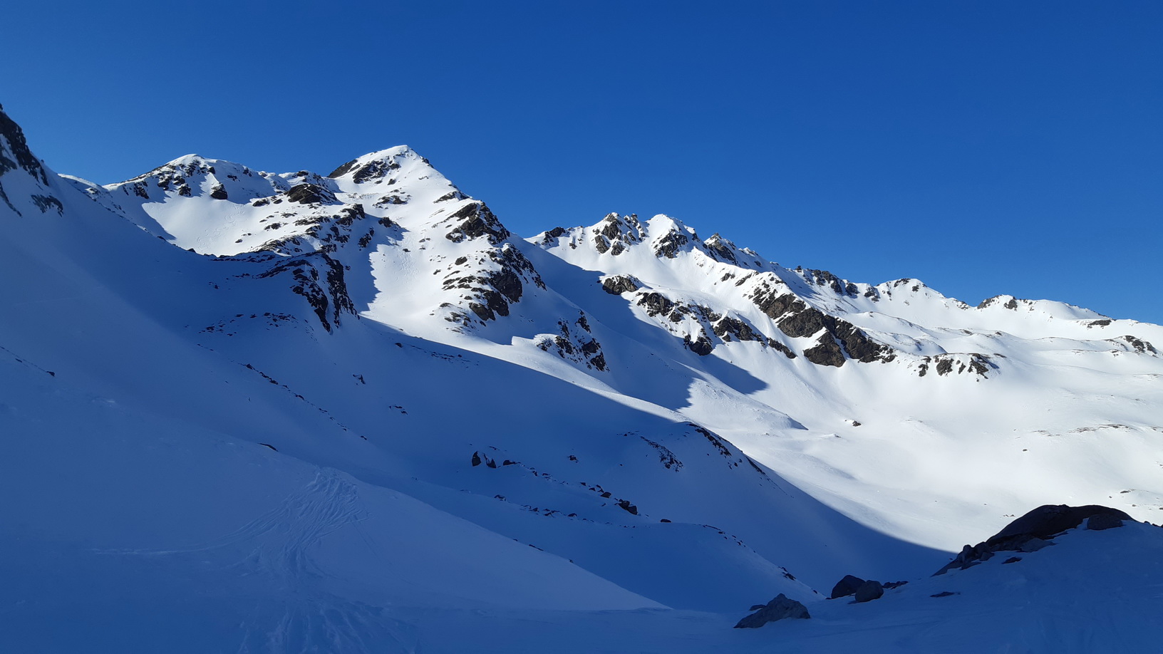 Naliepam pásy a krátkym výšľapom sa dostávam do sedla. Na druhej strane vidieť zjazdové stopy, a tak neváham. O chvíľu už dole traverzujem pod ďalšie sedlo, ktorým sa dostanem na druhú stranu Keschu. Tu už ale stopy nie sú žiadne, a tak si musím vybrať sám najlepší smer výstupu. S lyžami na batohu sa mi podarí vyjsť hore aj bez použitia mačiek. Plán vychádza.