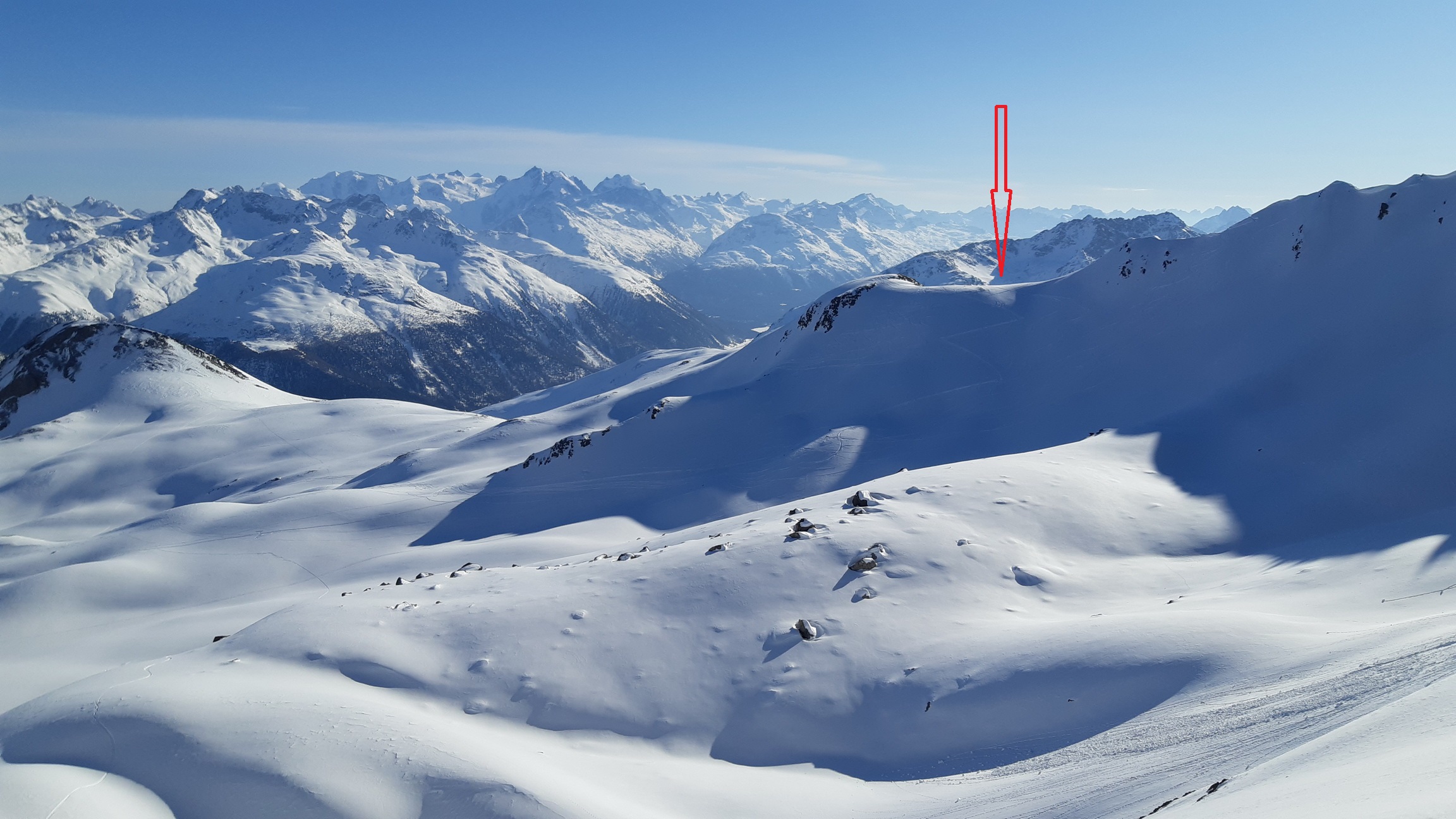 Na vrchol prichádzajú pomaly ďalší skialpinisti. Zatiaľ čo oni uvažujú, ktorým smerom sa pustia dole, aby si užili čo najlepší zjazd, tak ja sa pozerám opačným smerom a hypnotizujem svahy za Piz Keschom smerom na západ. Po krátkom oddychu a fotodokumentácii už lyžujem kúsok po výstupovej stope dole a traverzujem pod sedielko v závere výstupovej dolinky.