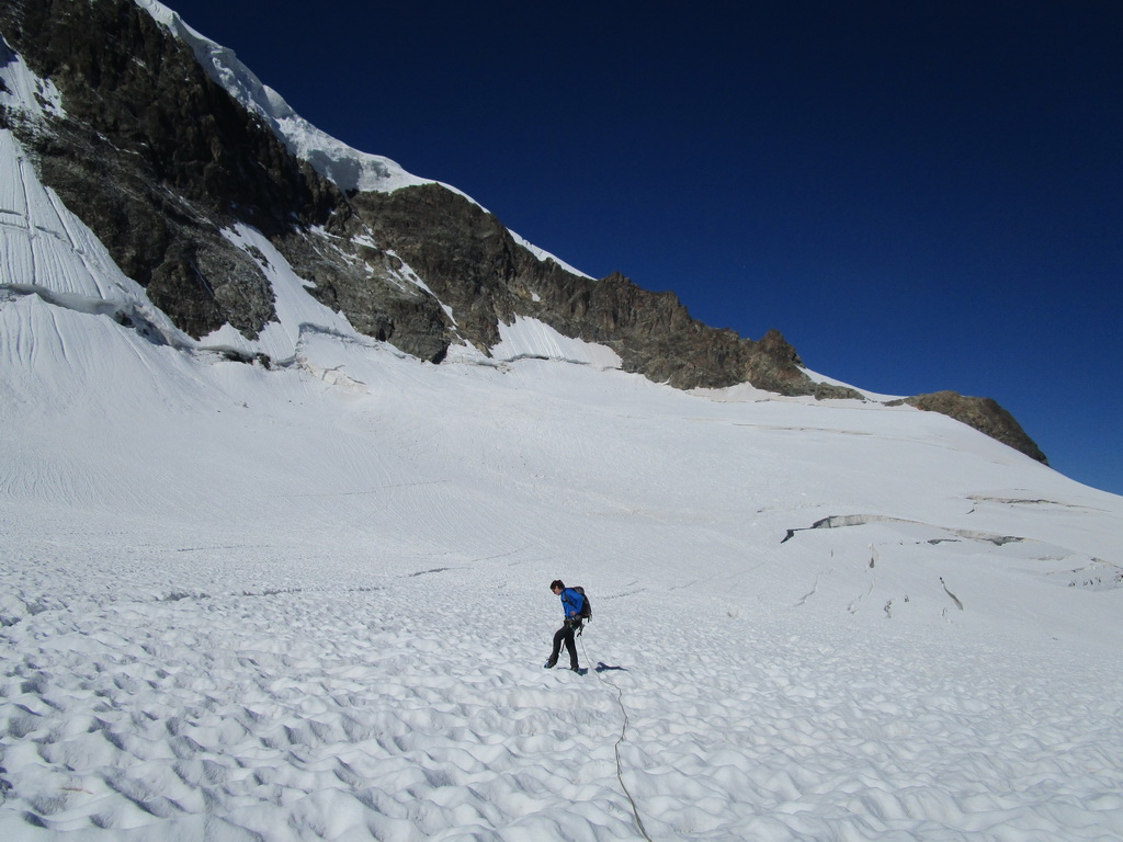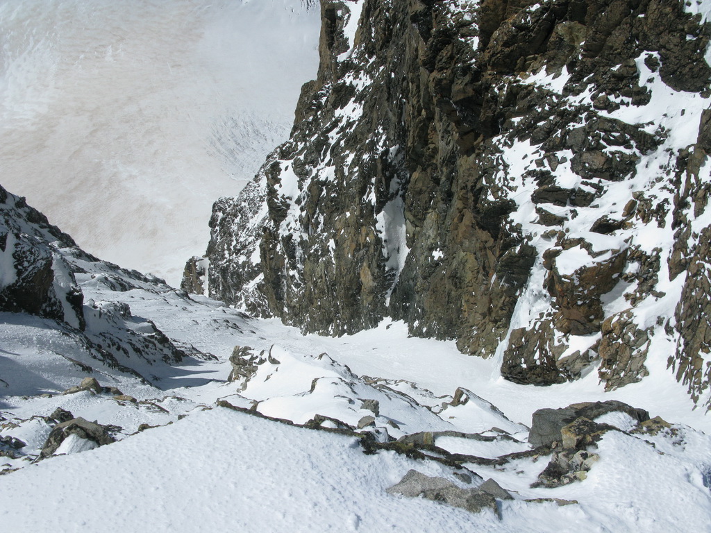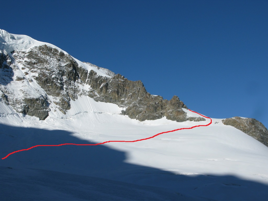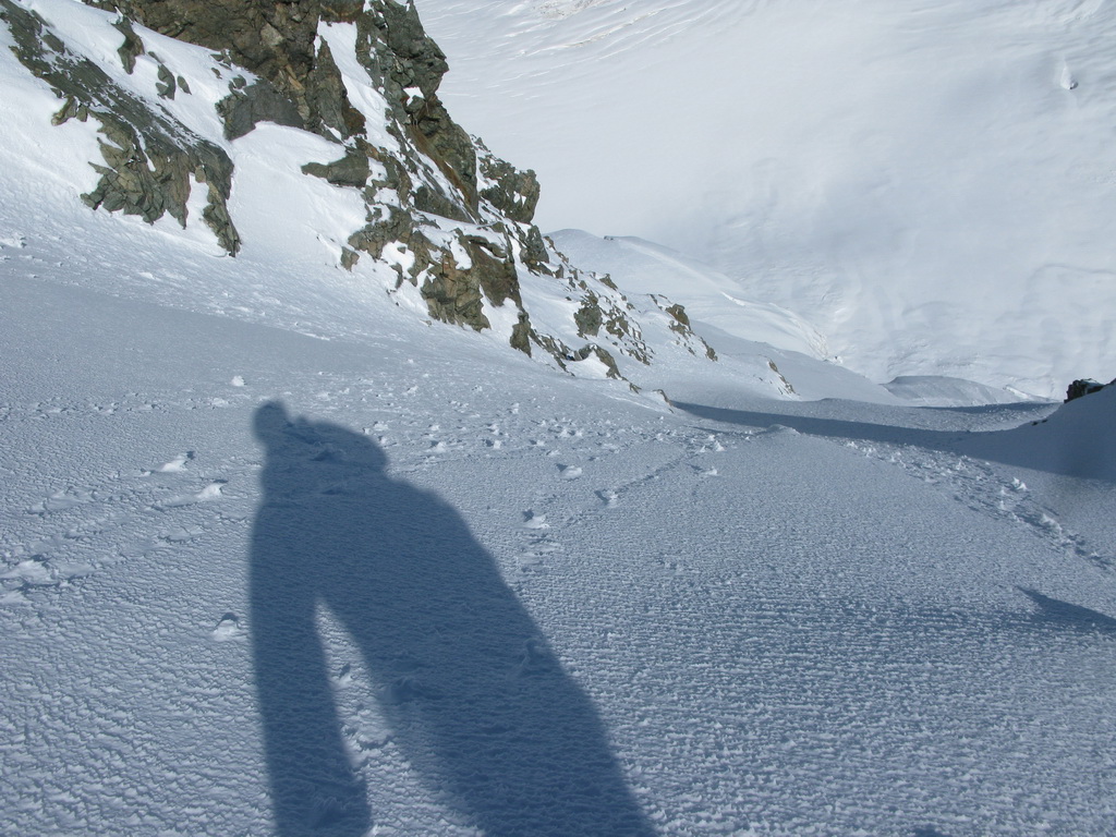 Tu začneme mierne stáčať doprava a popod stenu ktorú máme po ľavej ruke si to namierime do snehového sedla na začiatku Eselgratu. Od steny je dobré udržiavať odstup kôli prípadným lavínam alebo pádom sérakov.