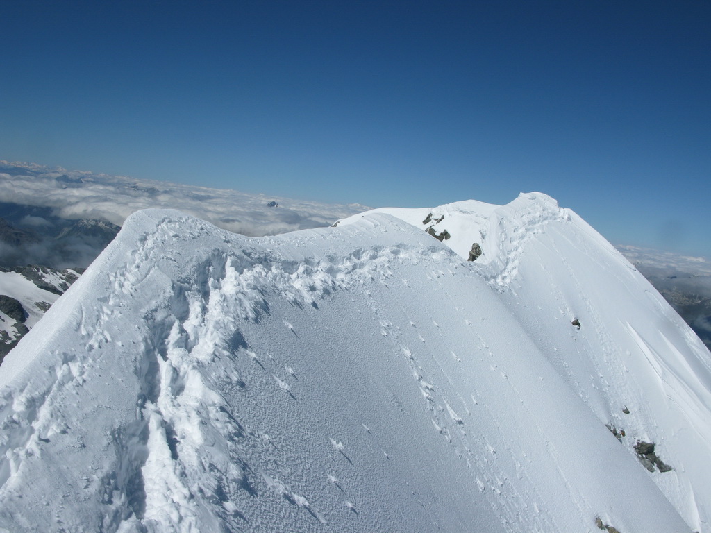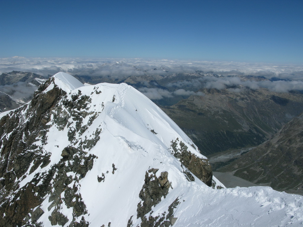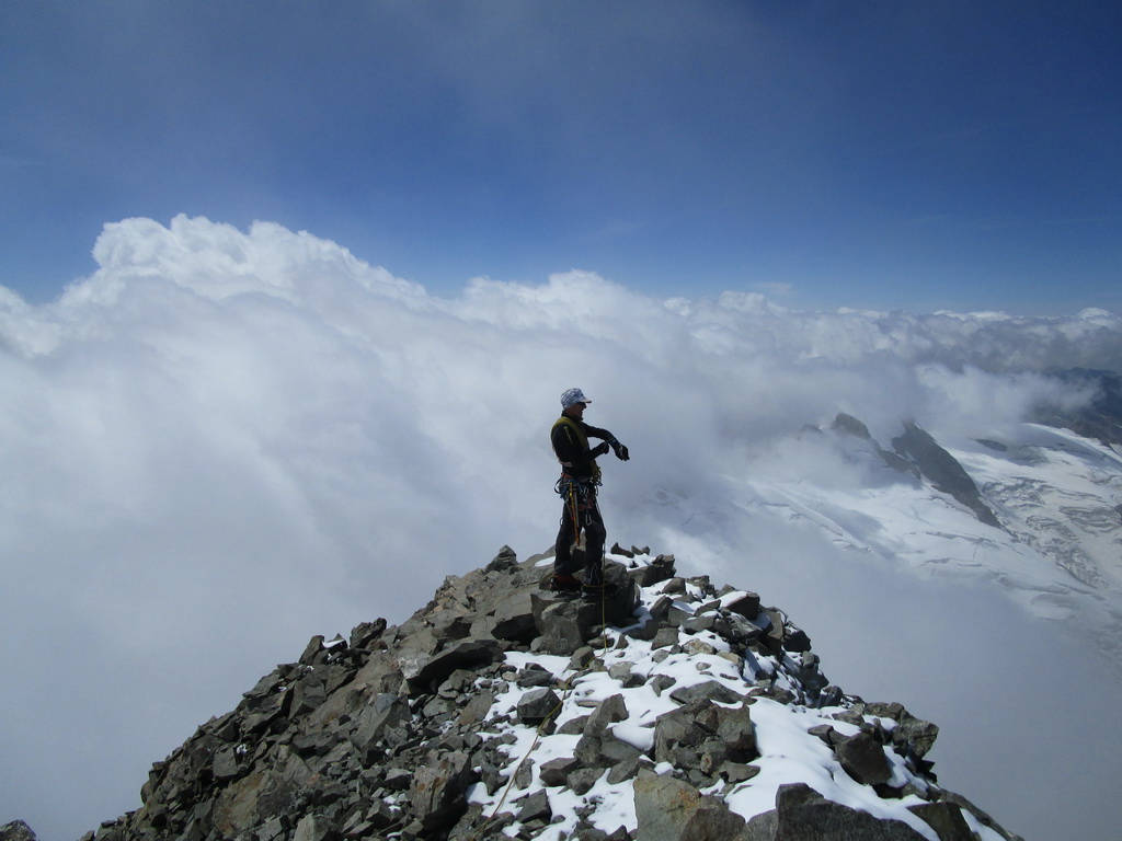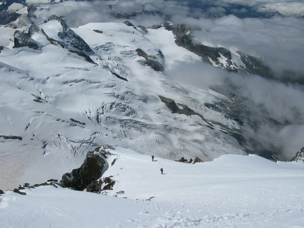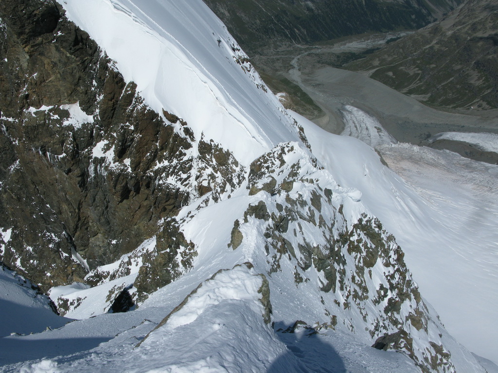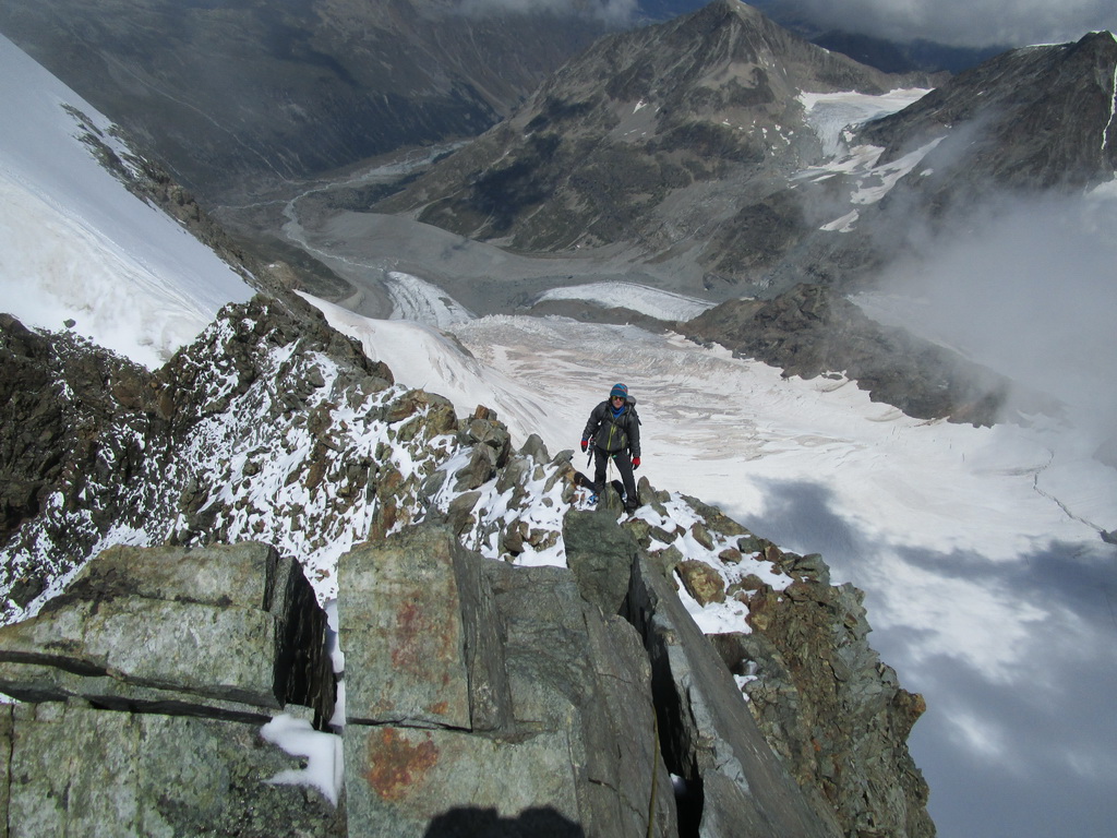 Počas výstupu cez Eselgrat 31.7.2015 bolo na ľadovci veľa nových trhlín. Výrazne teplý mesiac júl spôsobil okrem trhlín aj väčšie riziko pádu ľadovej lavíny z vysutého séraku nad ľadovcom. Je to ďalšie nebezpečenstvo naviac v tomto teplom počasí. Aj nad skalným Eselgratom je množstvo nových trhlín, ktoré treba obchádzať. Záverečný hrebeň na hlavný vrchol je celý odtopený, skala tu ponúka pekné lezenie s množstvom chytov obtiažnosť III. Väčšina ľudí sa stále otáča na nižšom bielom vrchole - je to trošku škoda nedotiahnuť tento pekný výstup dokonca... Pri zostupe po sérii zlaňákov zlaníte až dnu do okrajovej trhliny. Mali sme šťastie akurát deň pred nami niekto prekopal dieru, ktorou sa dalo pohodlne výjsť vonku...